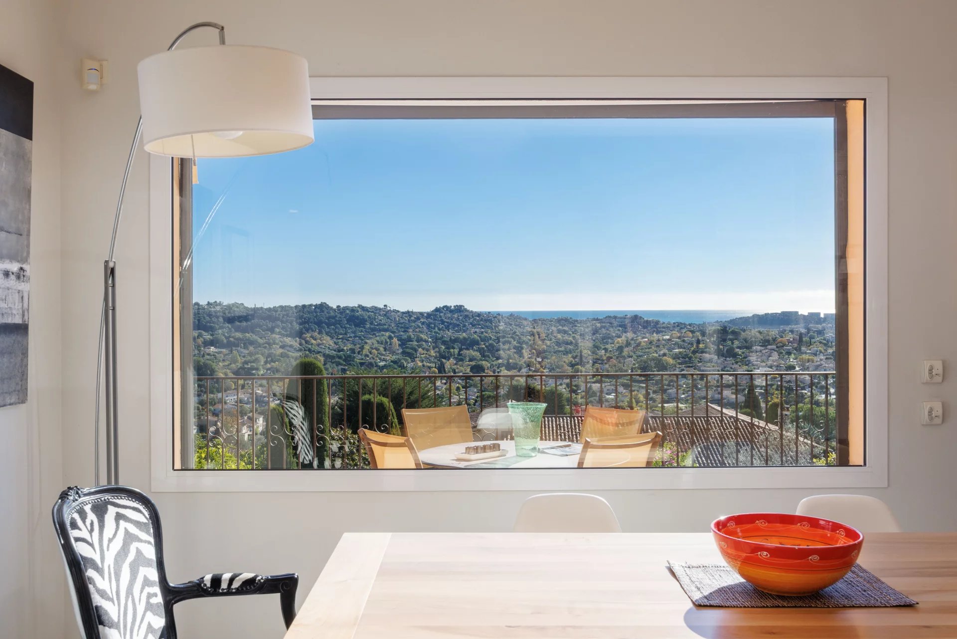 As soon as you enter the villa, the generous volumes and large bay windows open up to a breathtaking panorama: the valley, the village of Saint-Paul and the sea in the background.