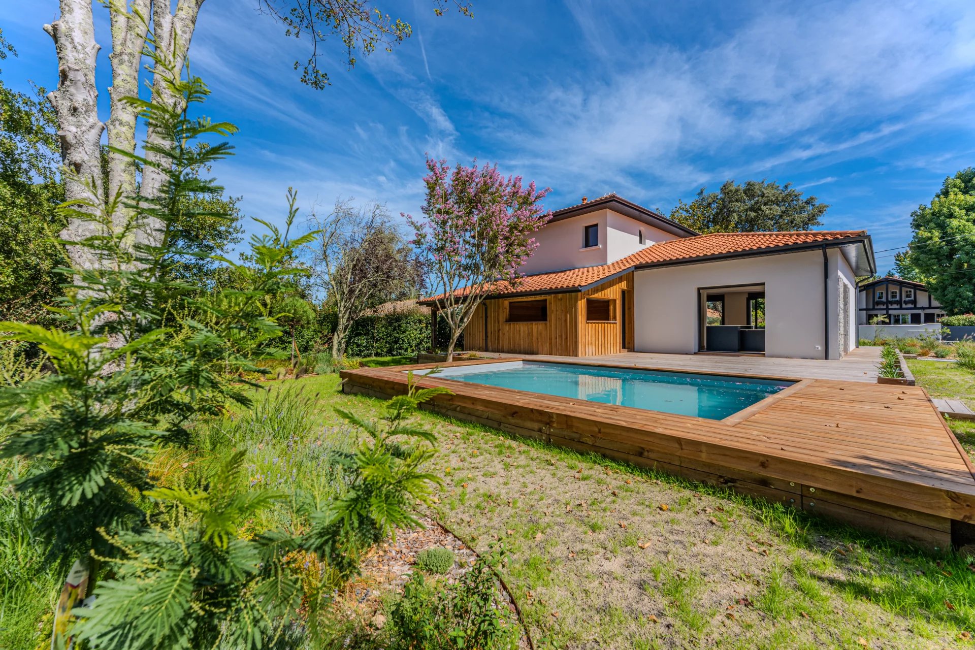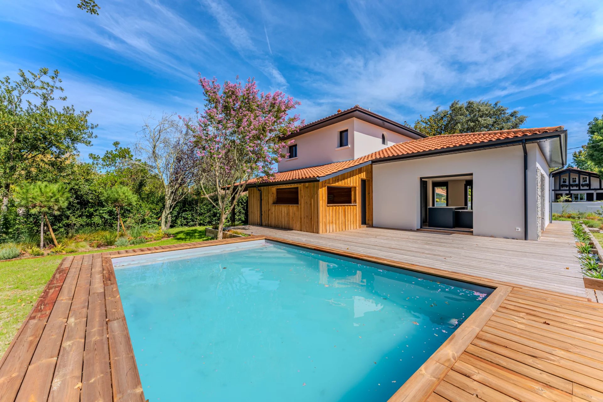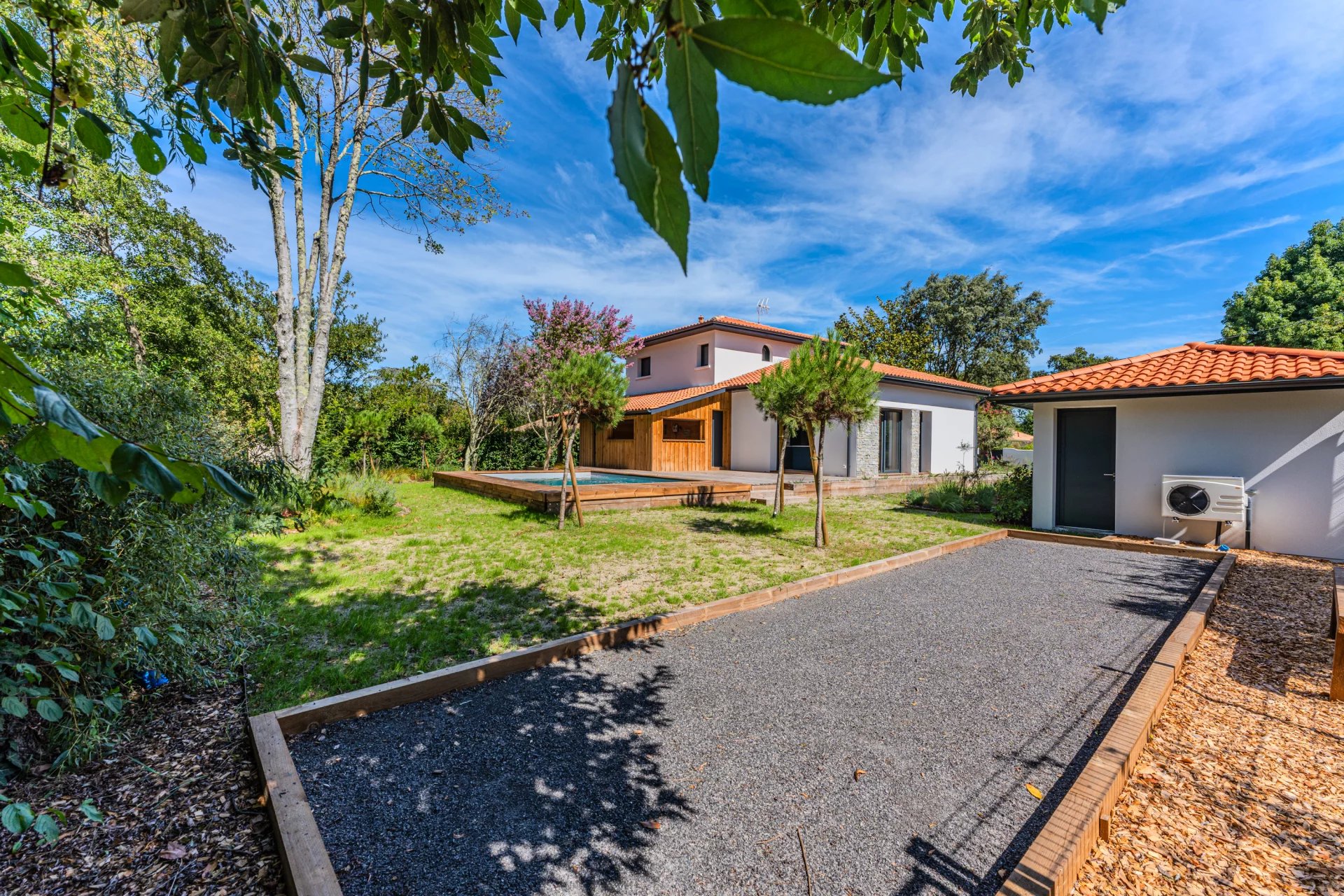 This villa is surrounded by a splendid 1130 sqm plot, where you can enjoy a large landscaped garden, a petanque court for friendly moments, and a beautiful 24 sqm swimming pool, perfect for cooling off on sunny days.