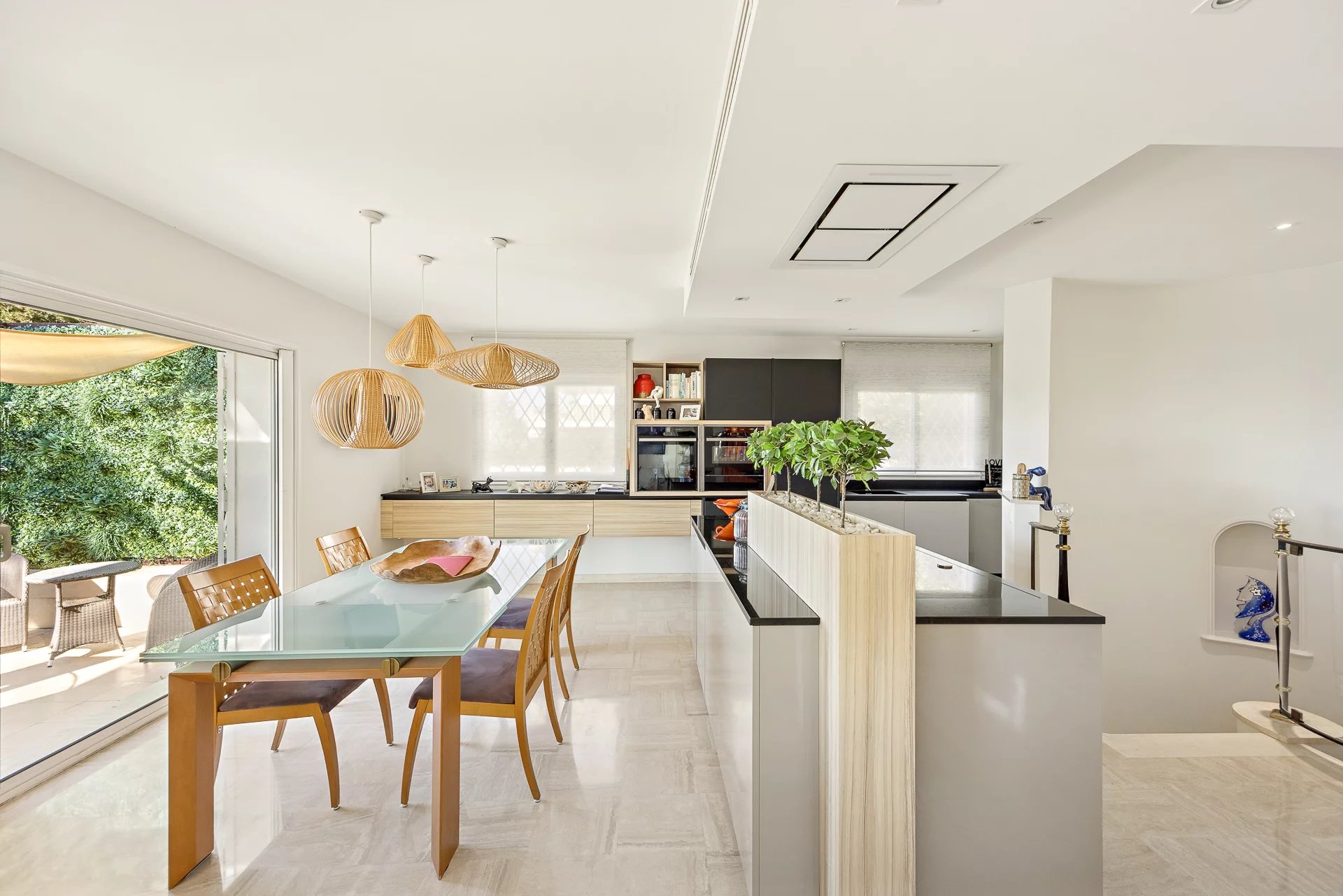 Offering approximately 200 sqm of surface, the property currently features three bedrooms, with the possibility of creating a fourth according to one’s needs. It is set on a beautifully landscaped plot of 1,380 sqm, richly planted with Mediterranean species and enhanced by majestic palm trees.