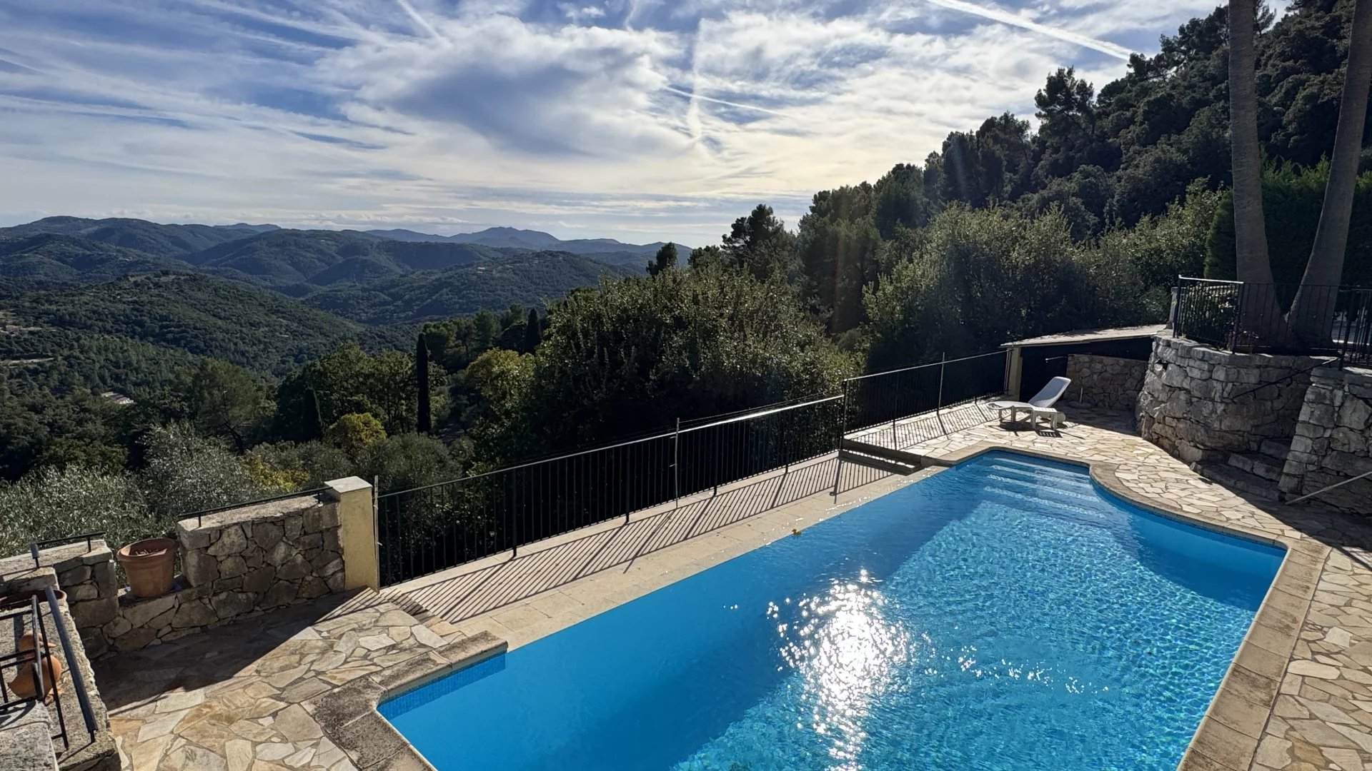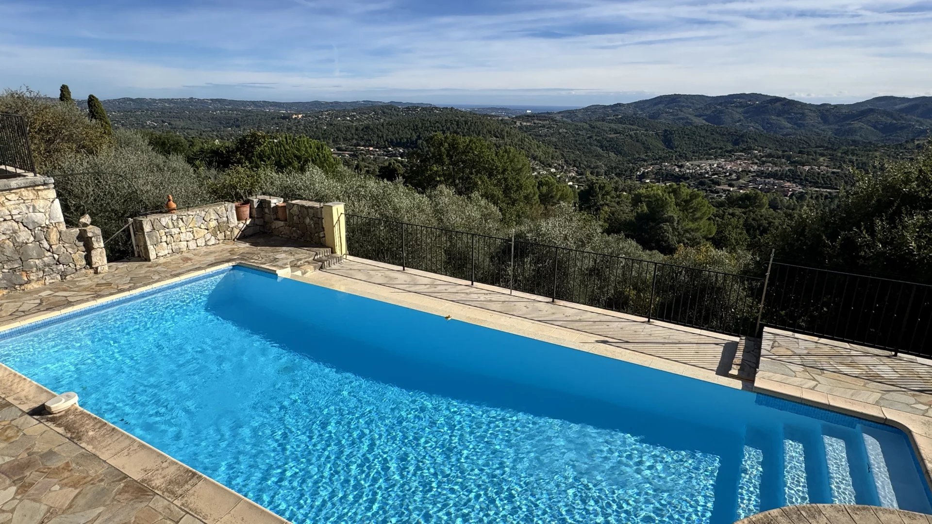 Beyond its exceptional view, the property features a delightful olive grove with around thirty mature trees. A parking area and a charming pool house complete the ensemble. Special mention to the two stately “Hollywood” palm trees gracefully watching over the swimmers.