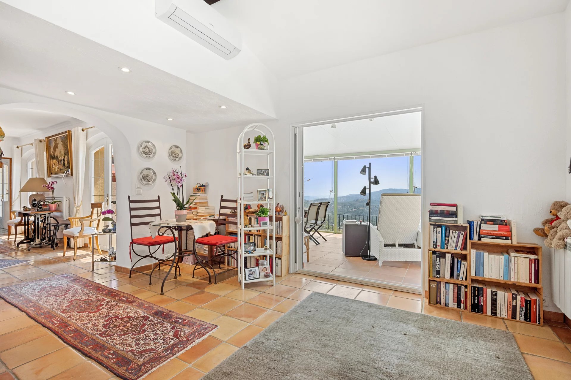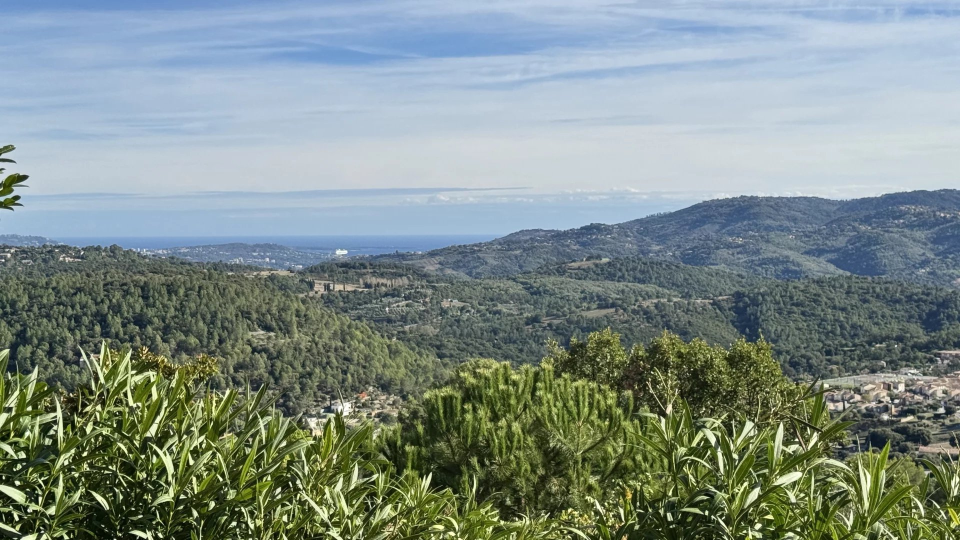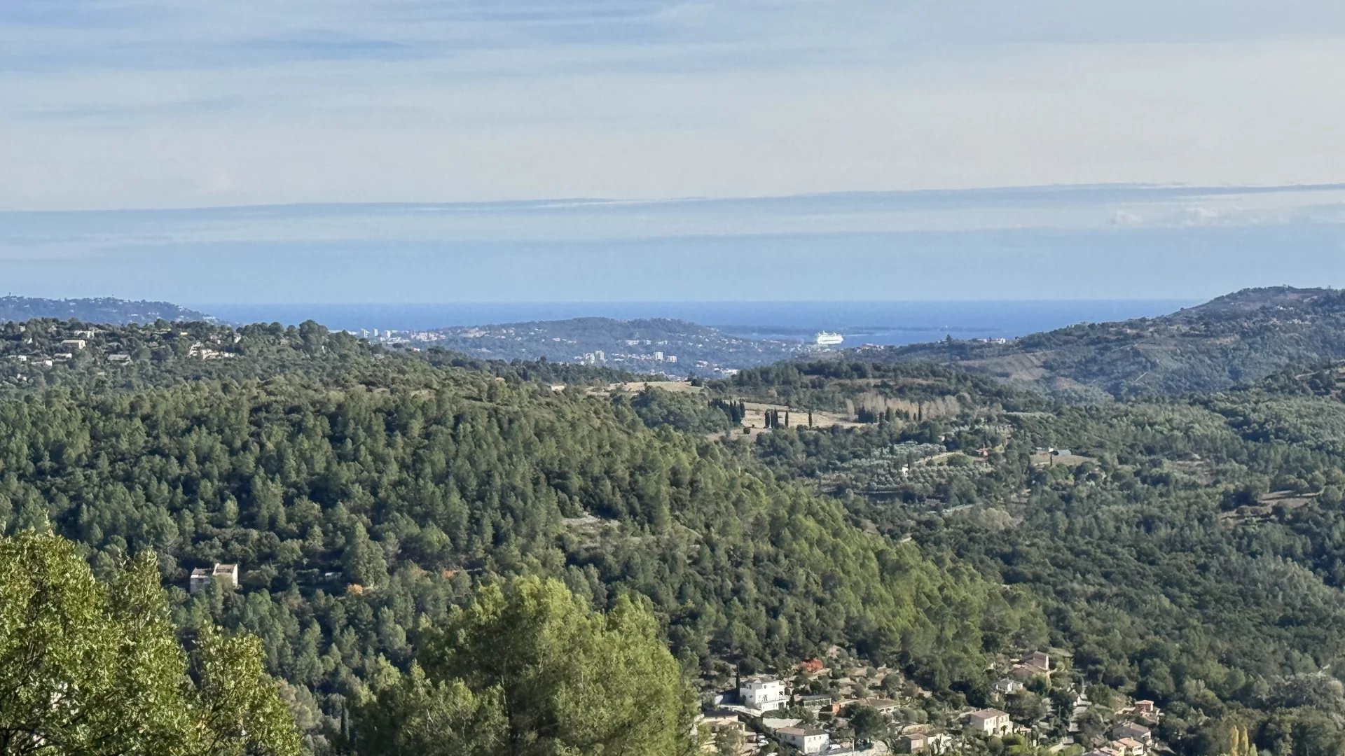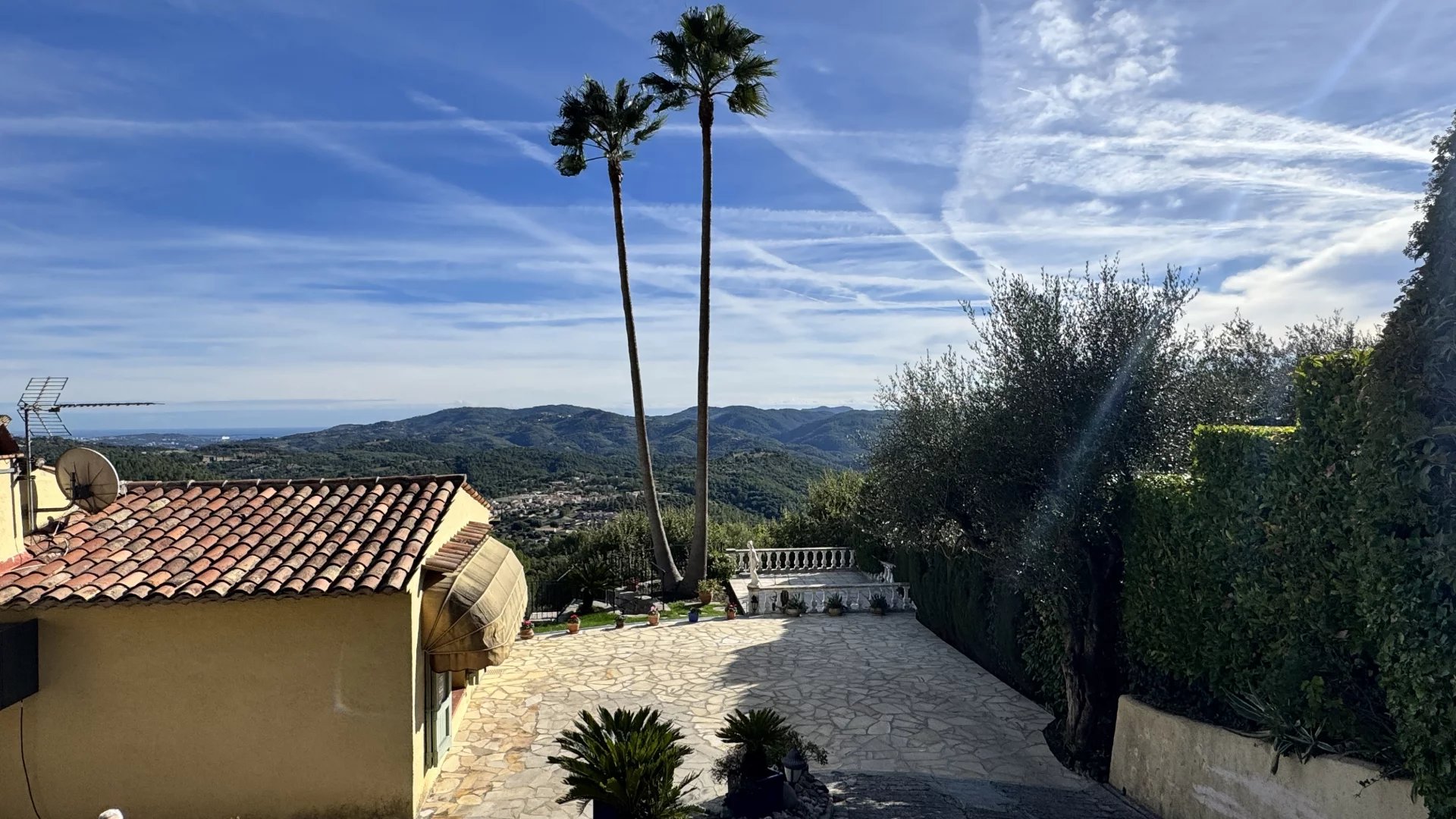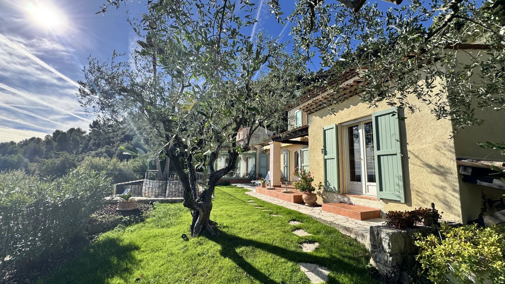 This charming Provençal villa enjoys a breathtaking panoramic view — in the foreground, the rolling hills of the hinterland, and beyond, the sea with the Lérins Islands on the horizon.