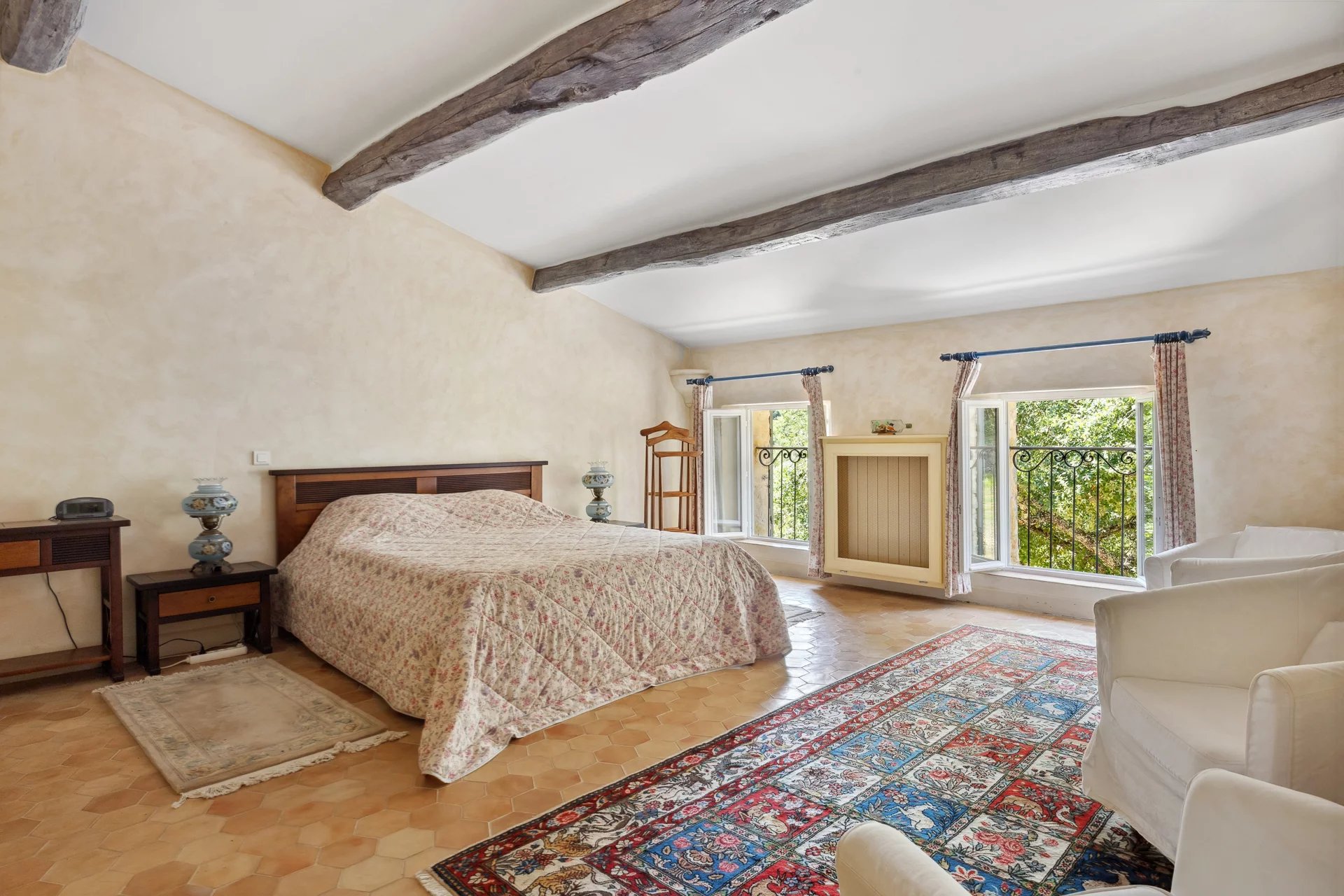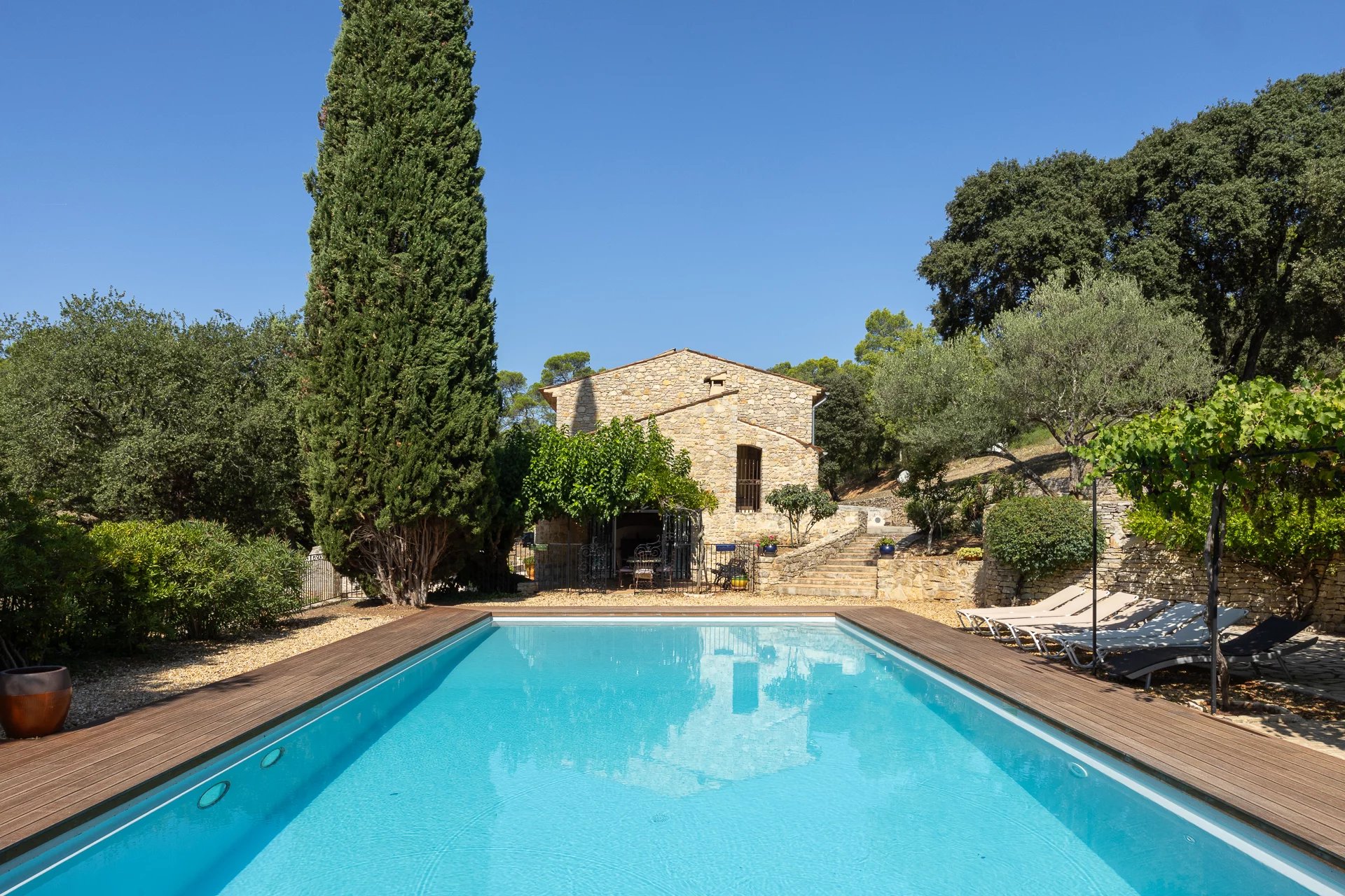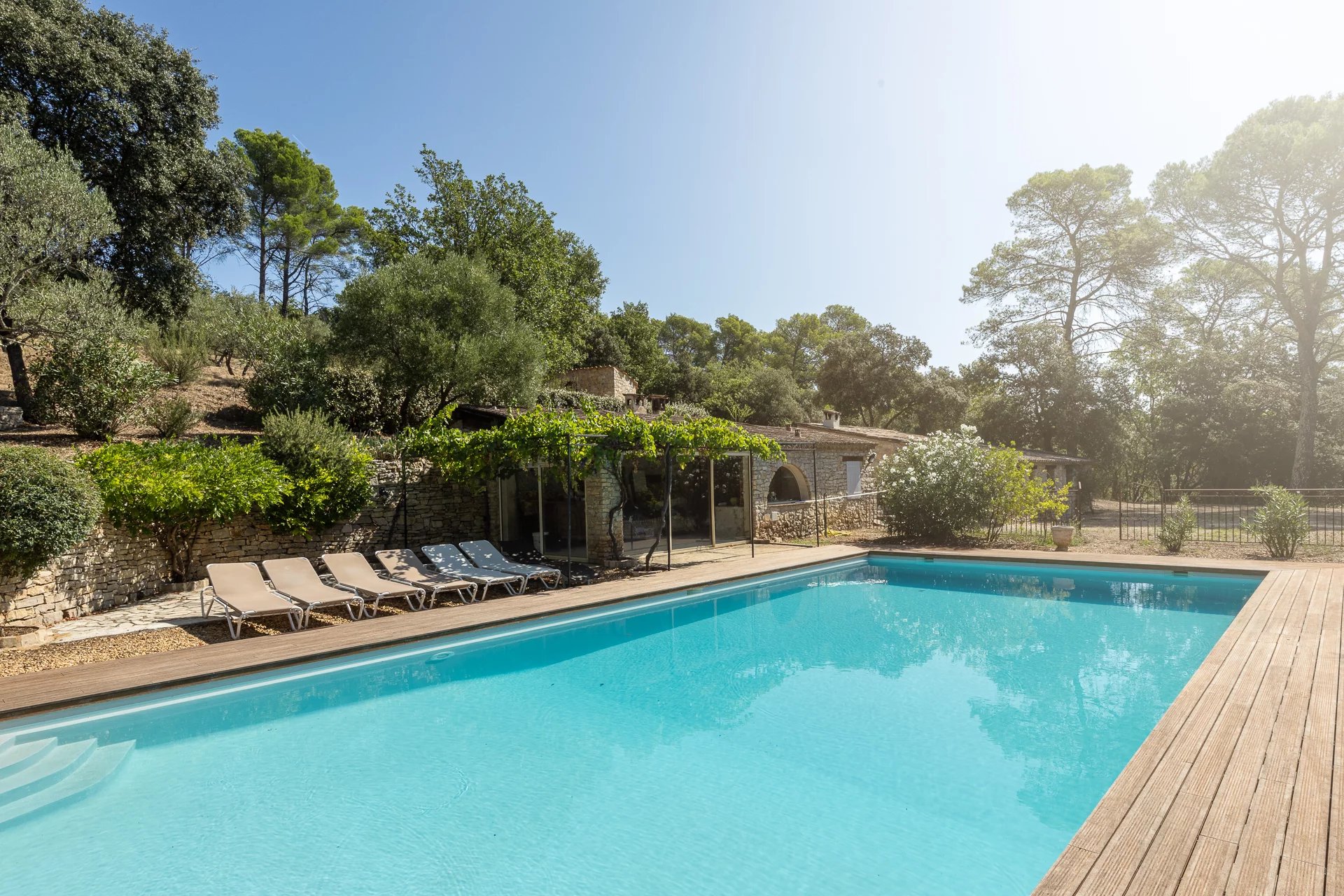 Learn moreThe main house features generous volumes bathed in natural light, combining authentic charm with high-end amenities: a spacious living room with stone fireplace, a welcoming dining area, a fully equipped Provençal kitchen, and four elegant en-suite bedrooms, each with private bathroom and dressing room. A dedicated wellness space includes a fitness room, hammam, and jacuzzi — perfect for year-round relaxation.