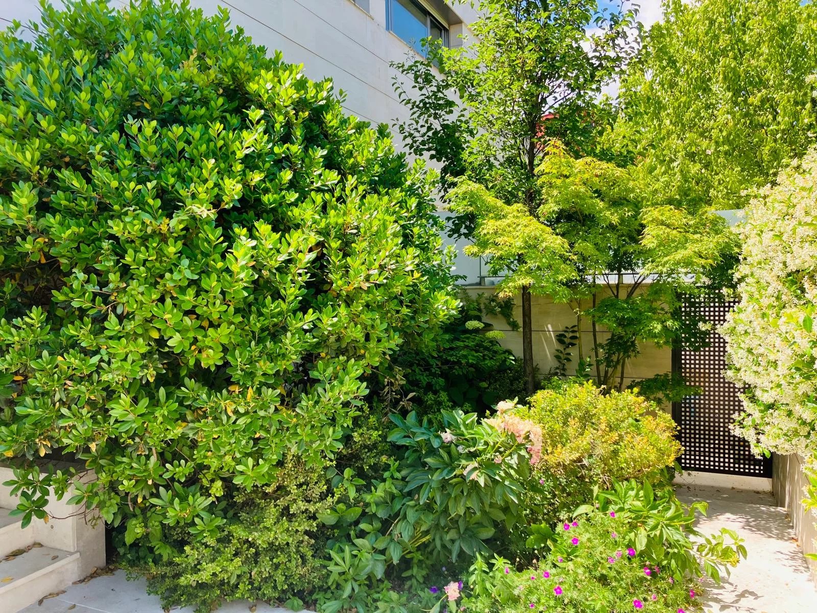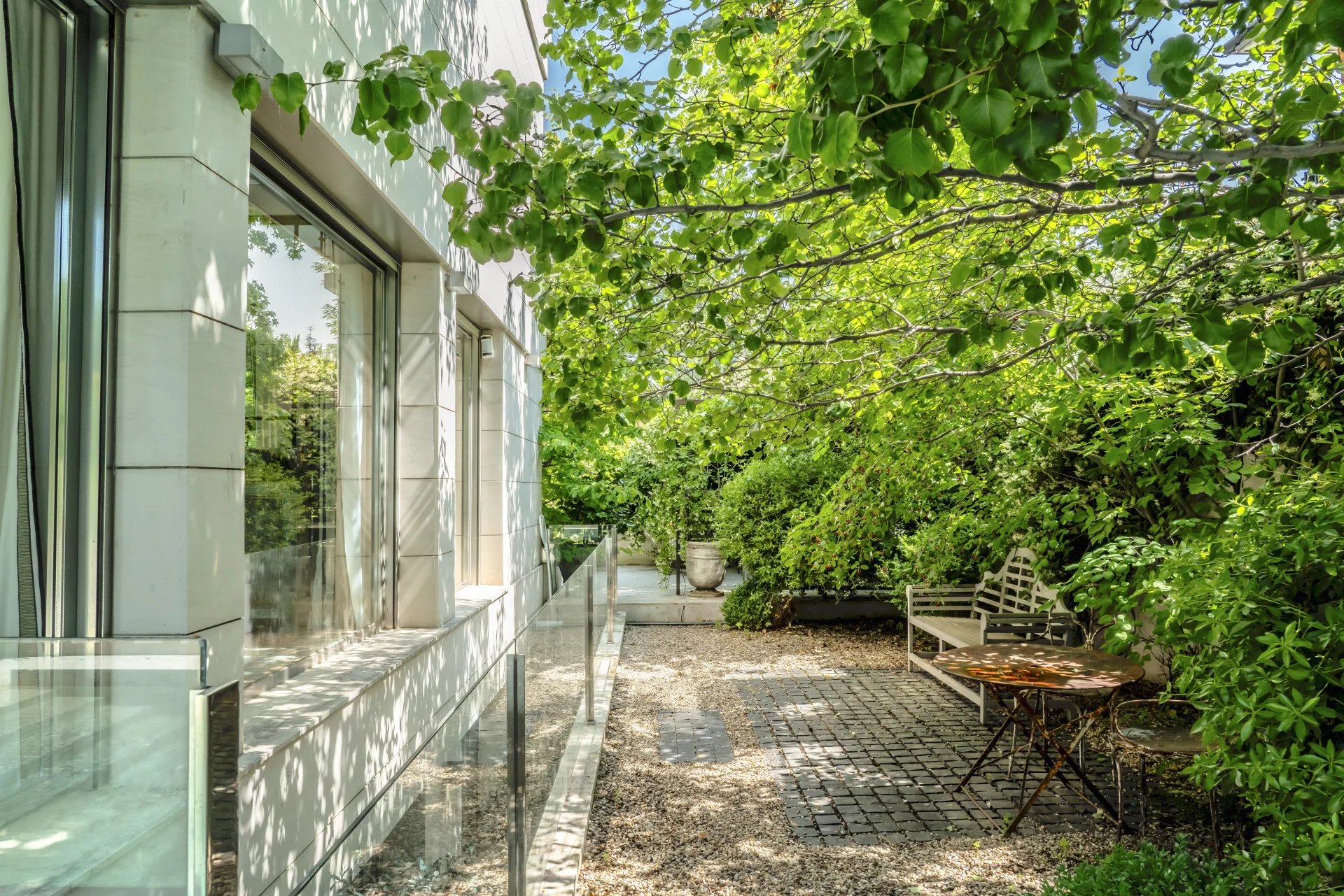 Garden with wonderful trees and consolidated plants and elegant saline water swimming pool made of limestone and with steel structure porches for summer and winter.