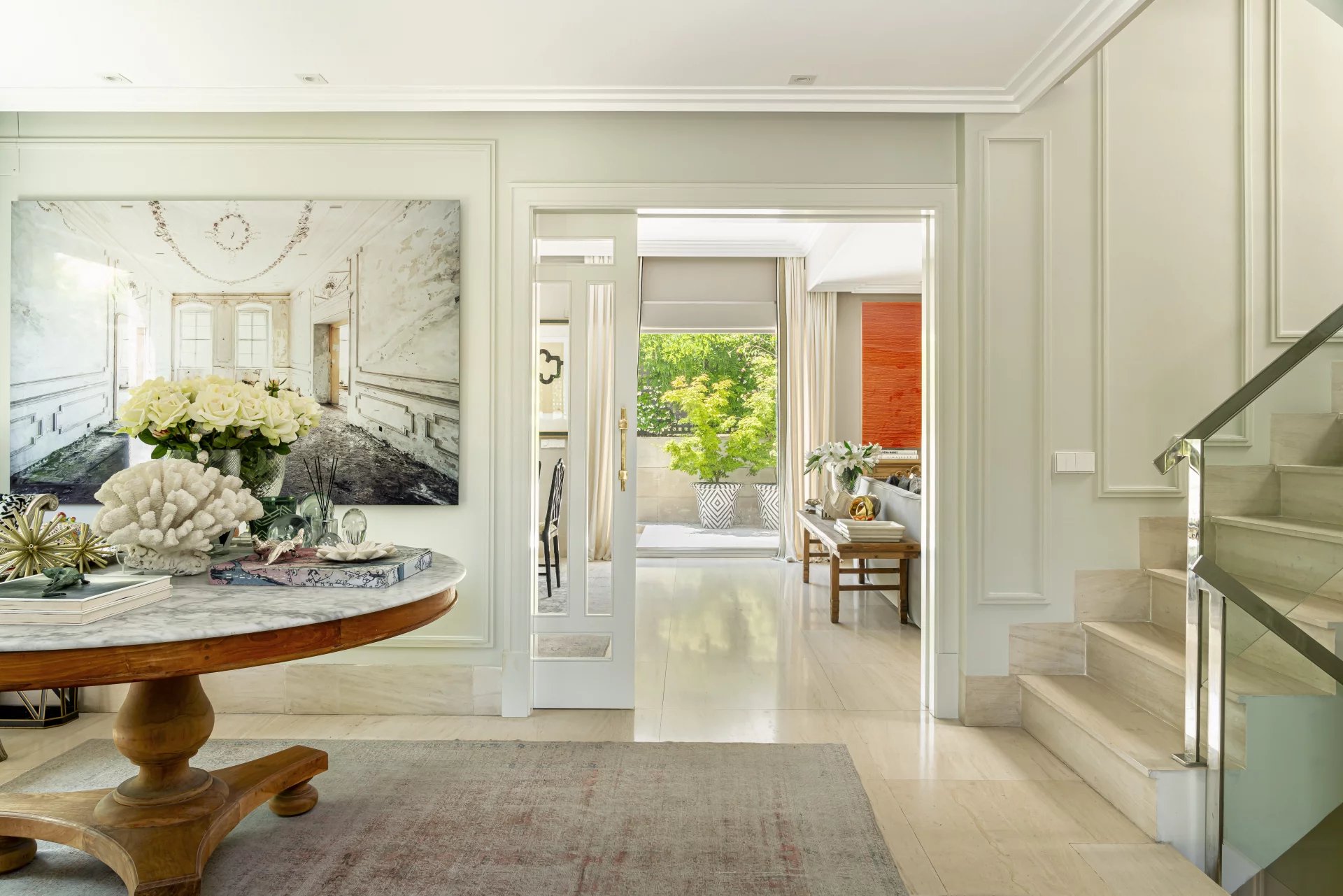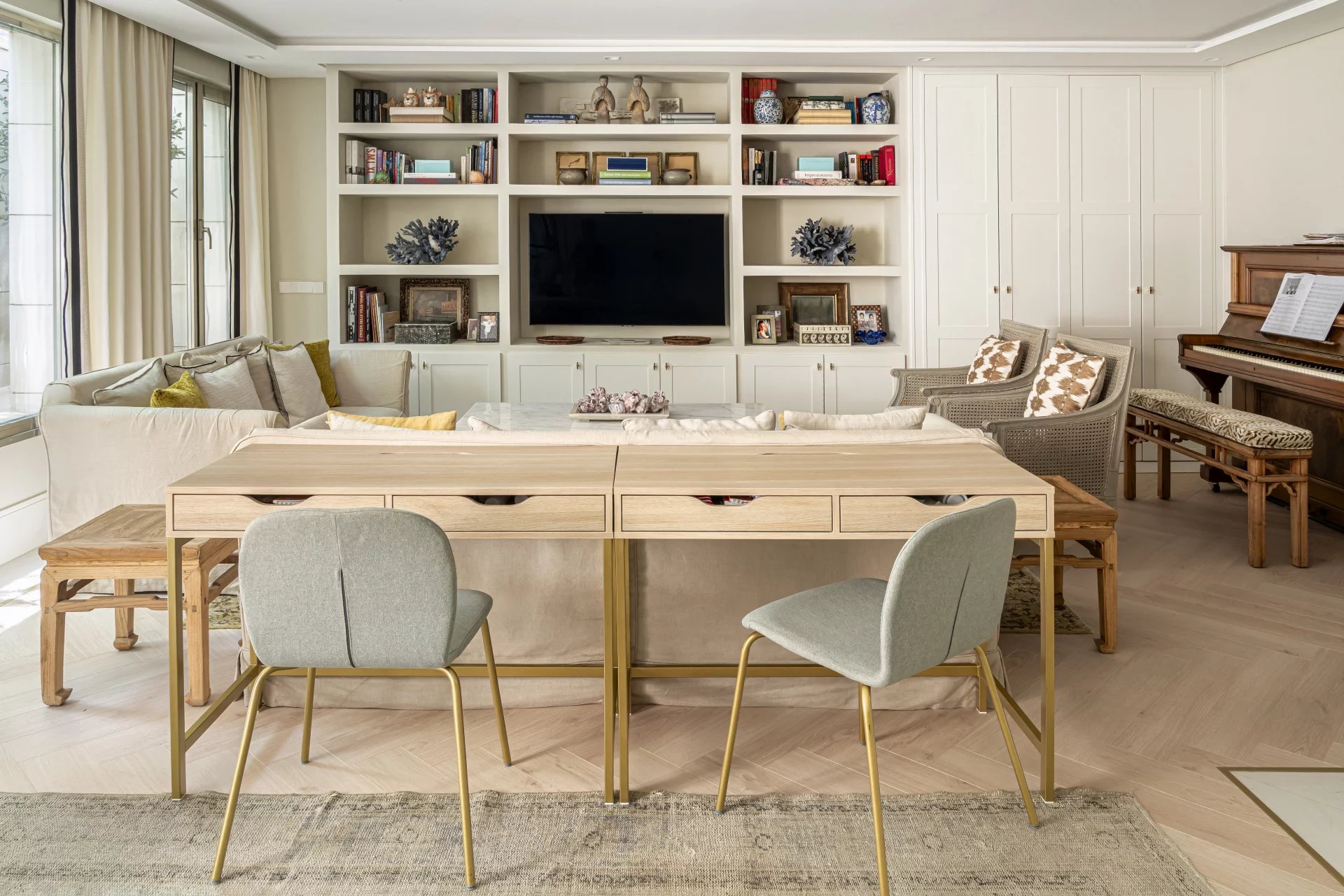 On the second floor, a beautiful garden terrace overlooking a park and the skyline of Madrid. A living room with large windows and an office.