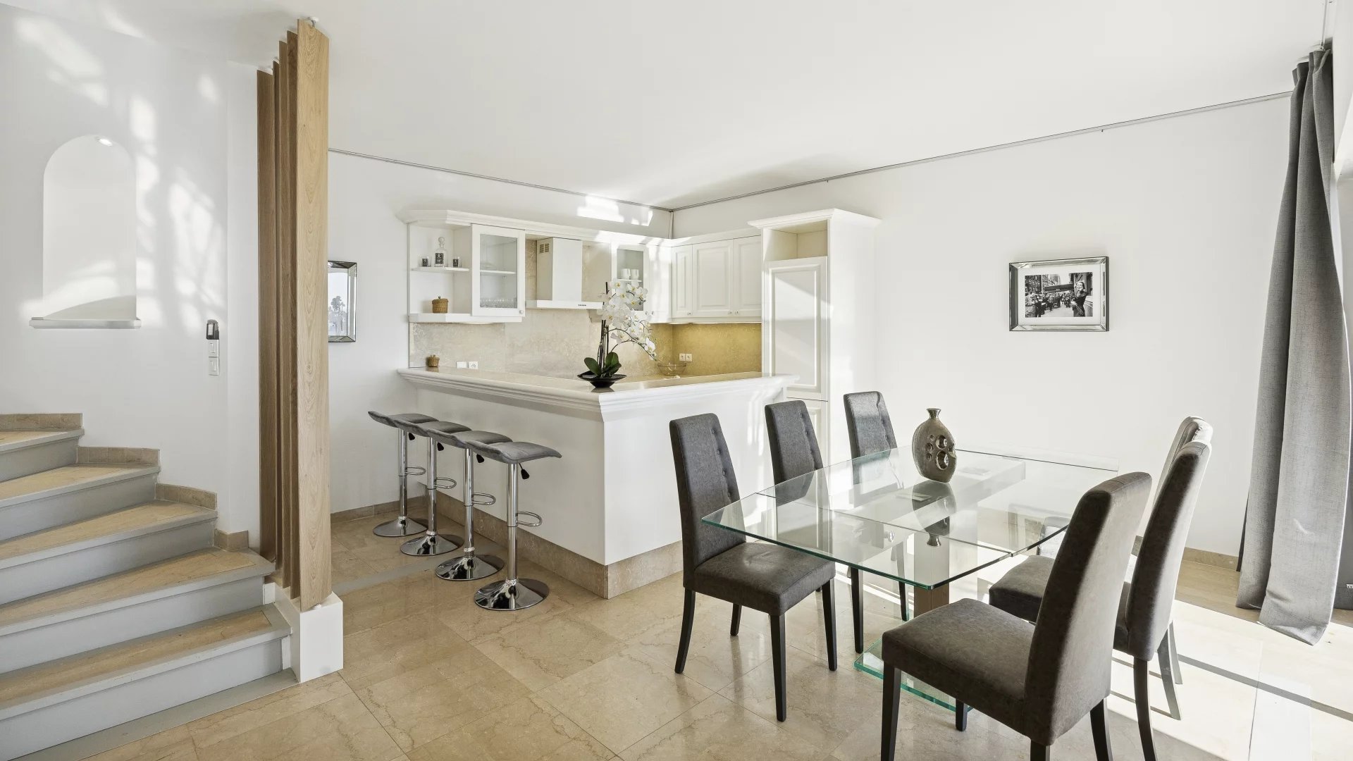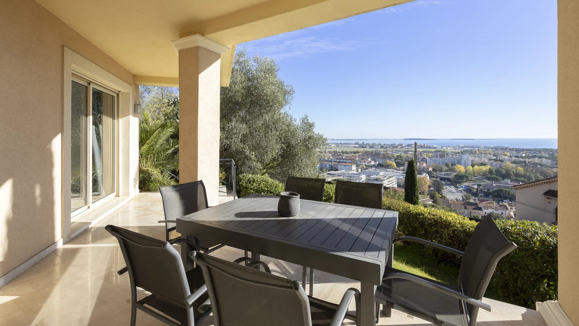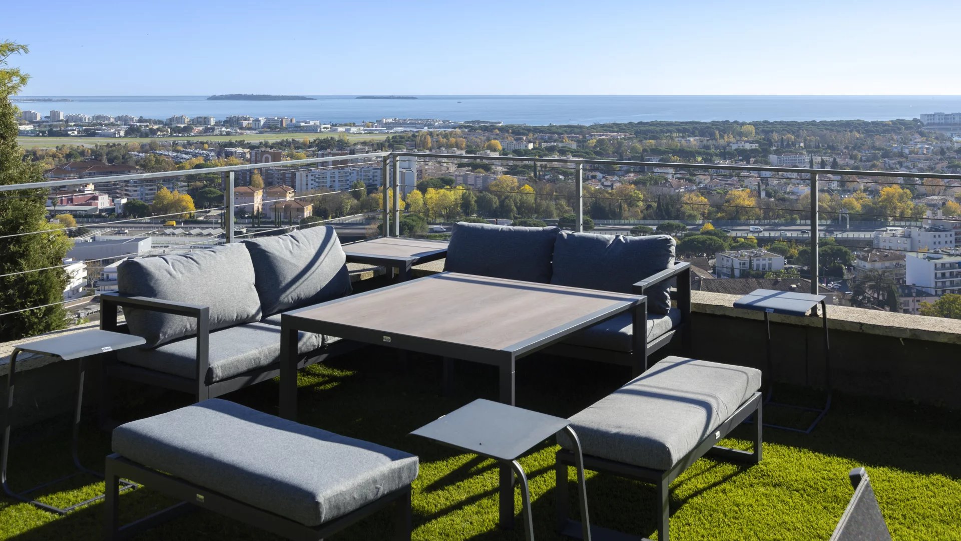 Located on the hill of Les Termes, this superb contemporary villa of approximately 118 sqm offers breathtaking panoramic sea views. The south-east facing house is spread over two floors and comprises an entrance hall, a large, bright living room with an open-plan fitted kitchen opening onto the dining room, three bedrooms each with their own bathroom, a covered terrace and a large roof terrace with a jacuzzi. A terraced garden of approximately 990 sqm surrounds the house, which has several parking spaces. Close to amenities and 35 minutes from Nice International Airport.