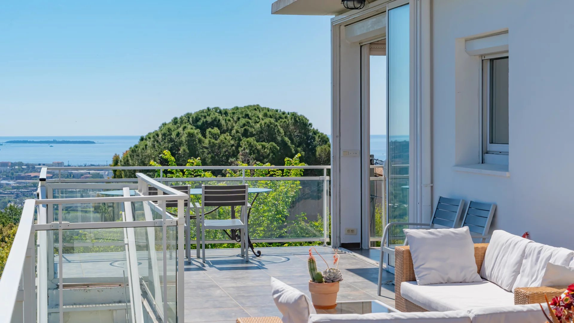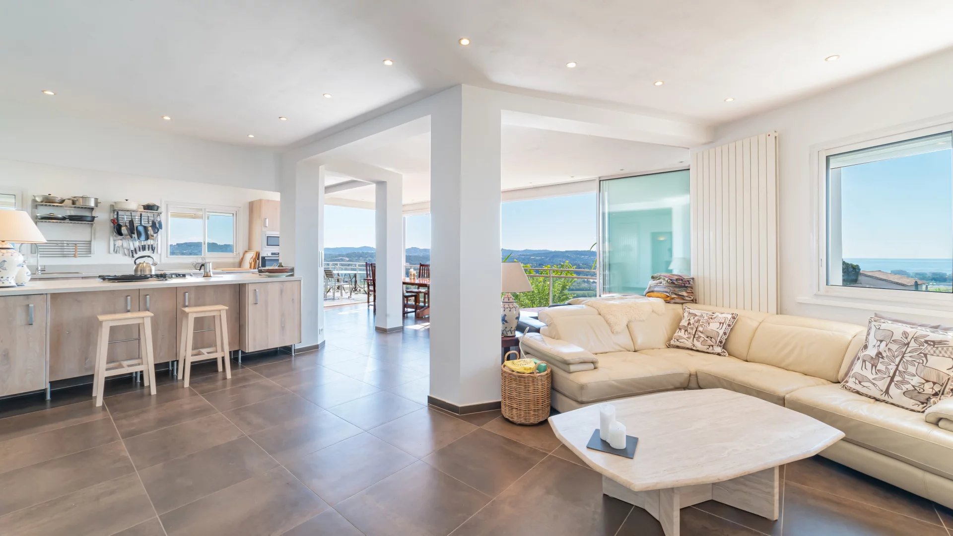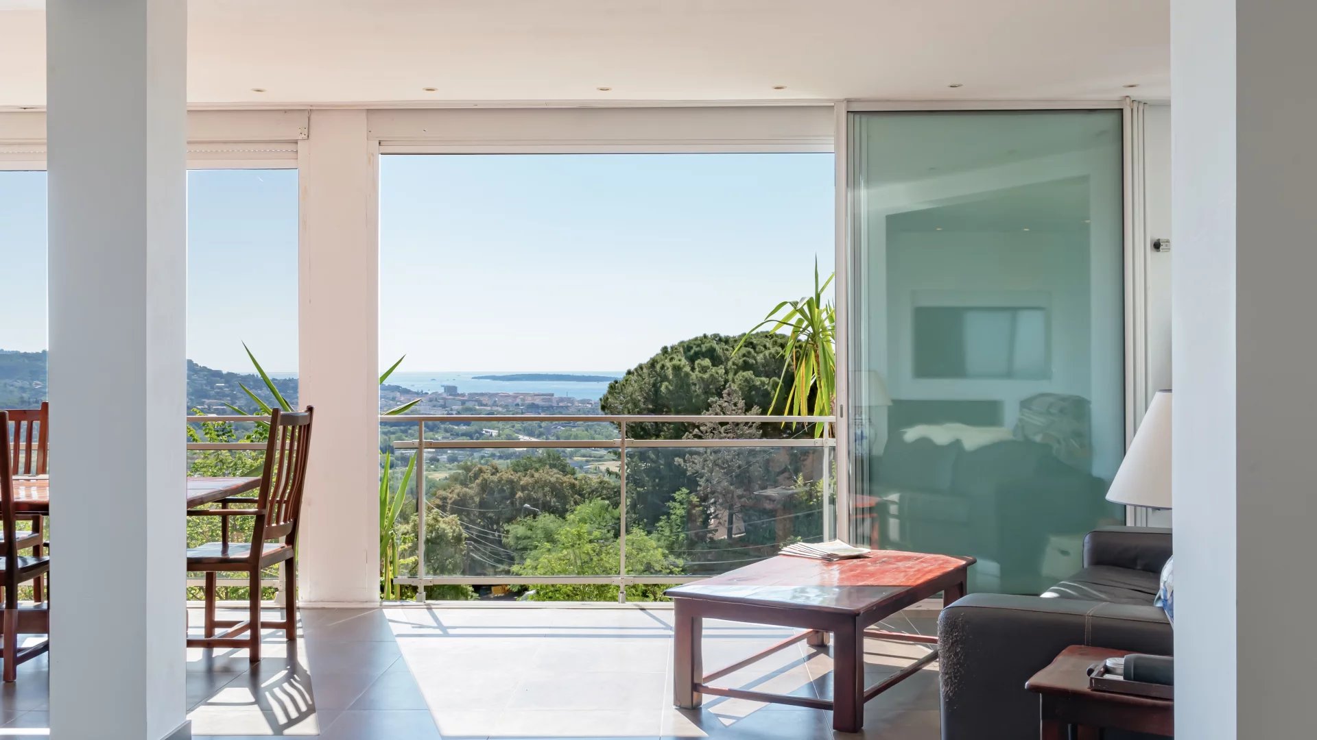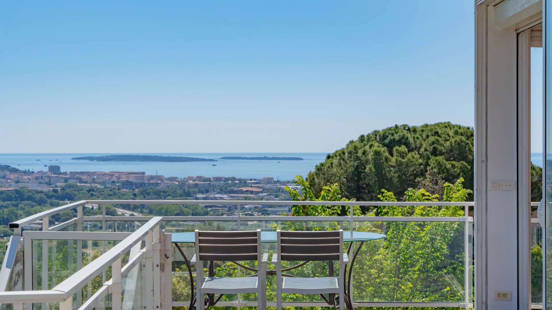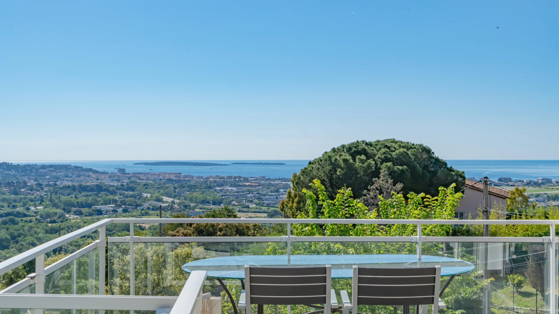 Located on the heights of Mandelieu, this contemporary-style villa boasts breathtaking 270-degree panoramic views of the islands, the bay of Cannes, the Estérel massif and the Alps.
