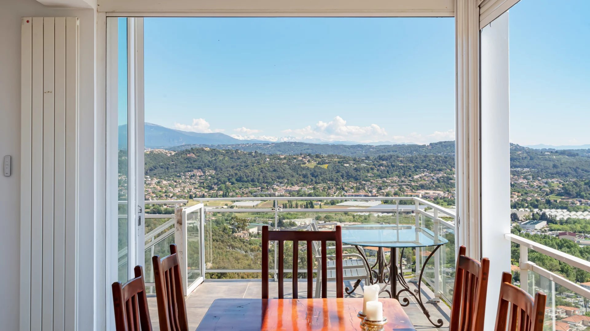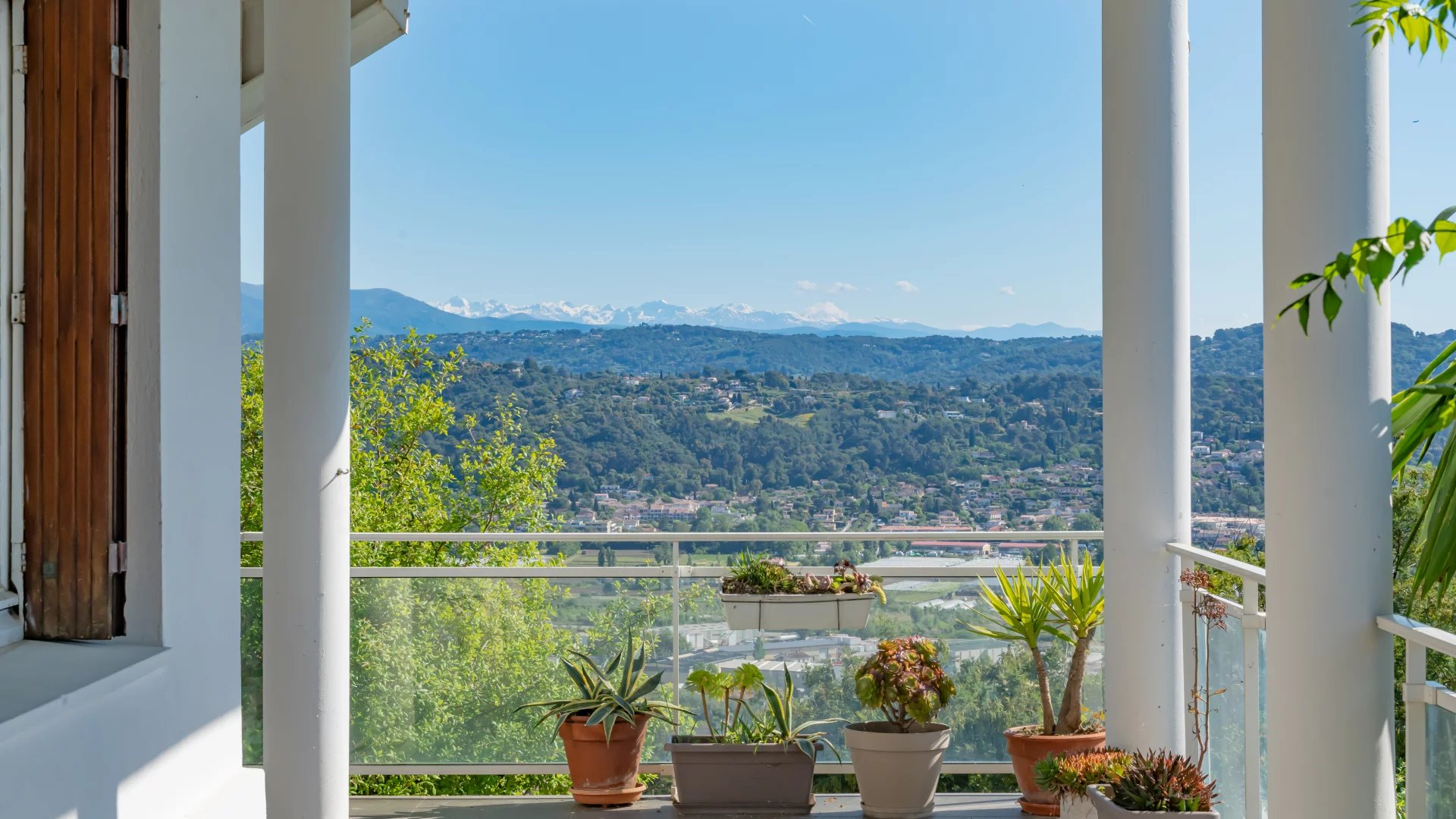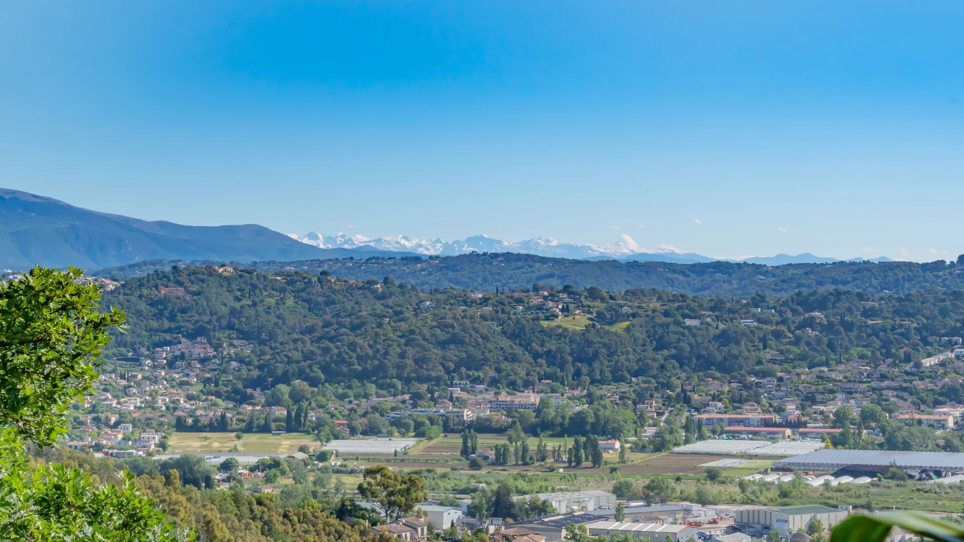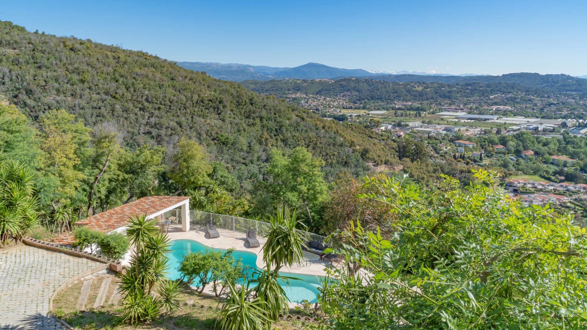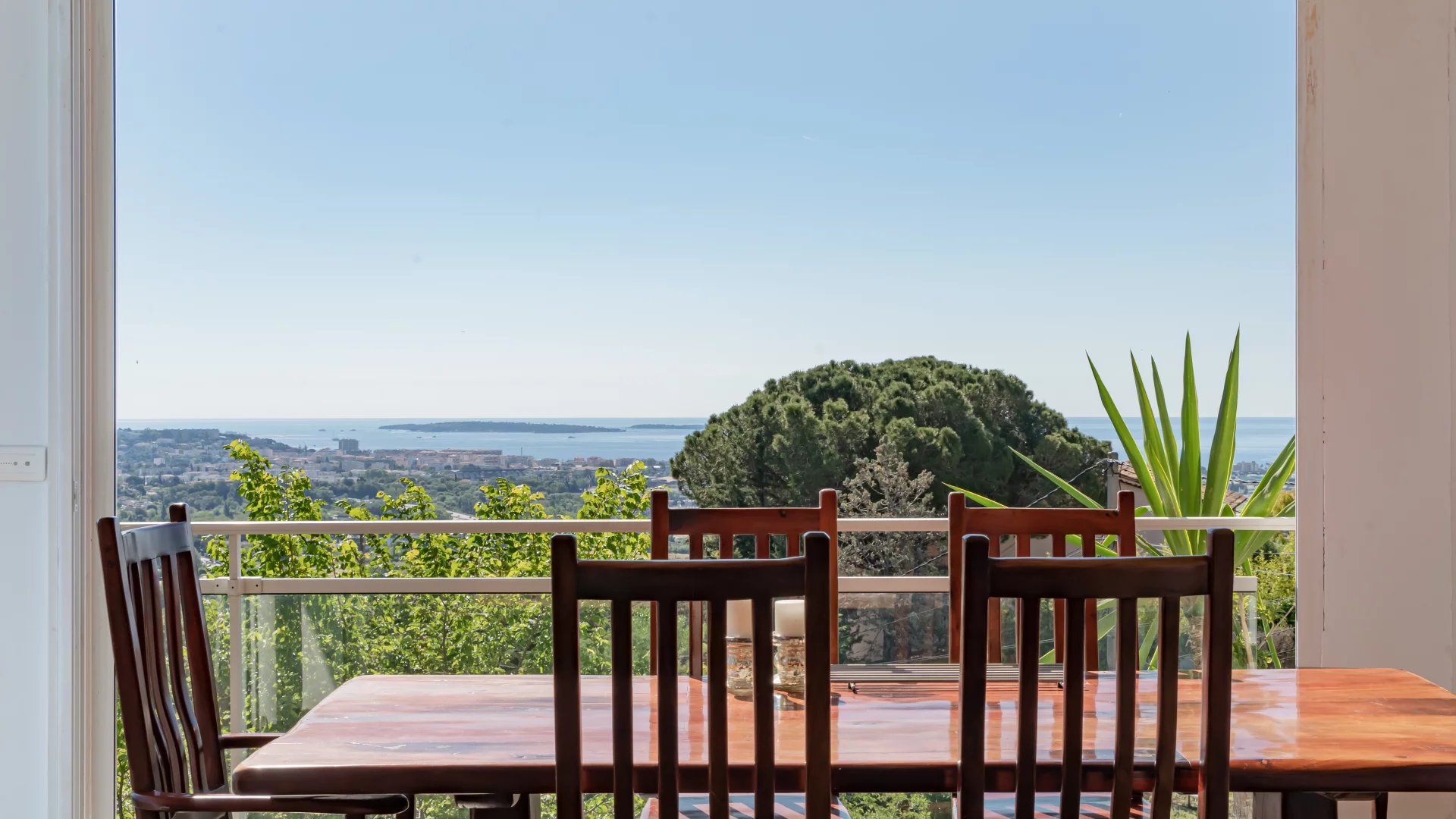 Located on the heights of Mandelieu, this contemporary-style villa boasts breathtaking 270-degree panoramic views of the islands, the bay of Cannes, the Estérel massif and the Alps.