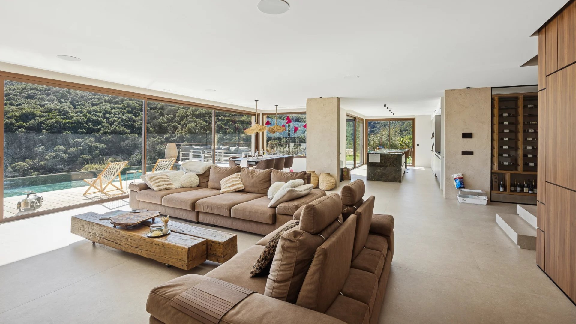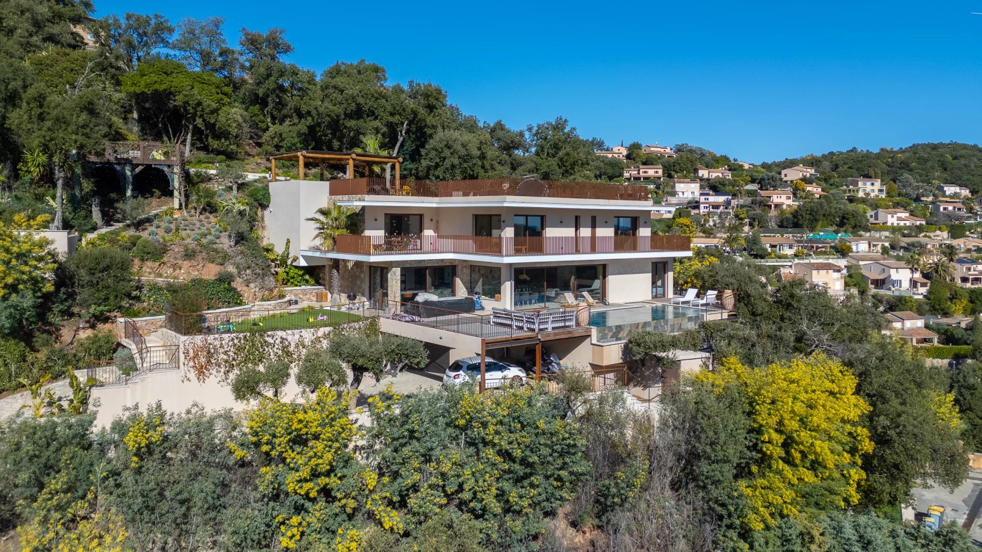 Located just 12 minutes from the beaches, restaurants and the port of Mandelieu-La-Napoule, this modern villa offers more than 400 sqm of living space (approximately 318 sqm of living area). Built on a south-facing plot of over 2,000 sqm, it enjoys privacy and peace and quiet, in the heart of a secure estate bordering the forest of the Massif de l’Estérel.