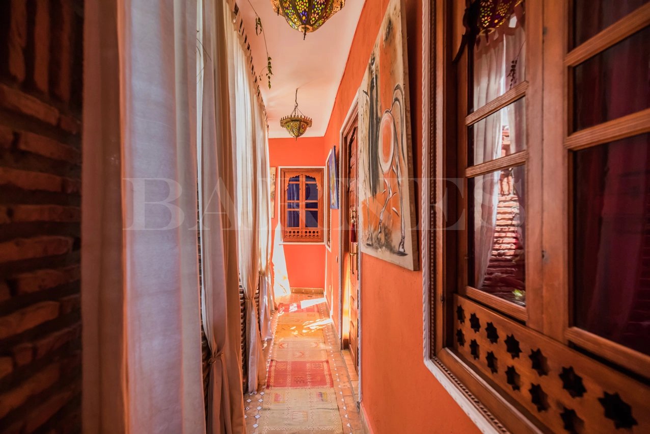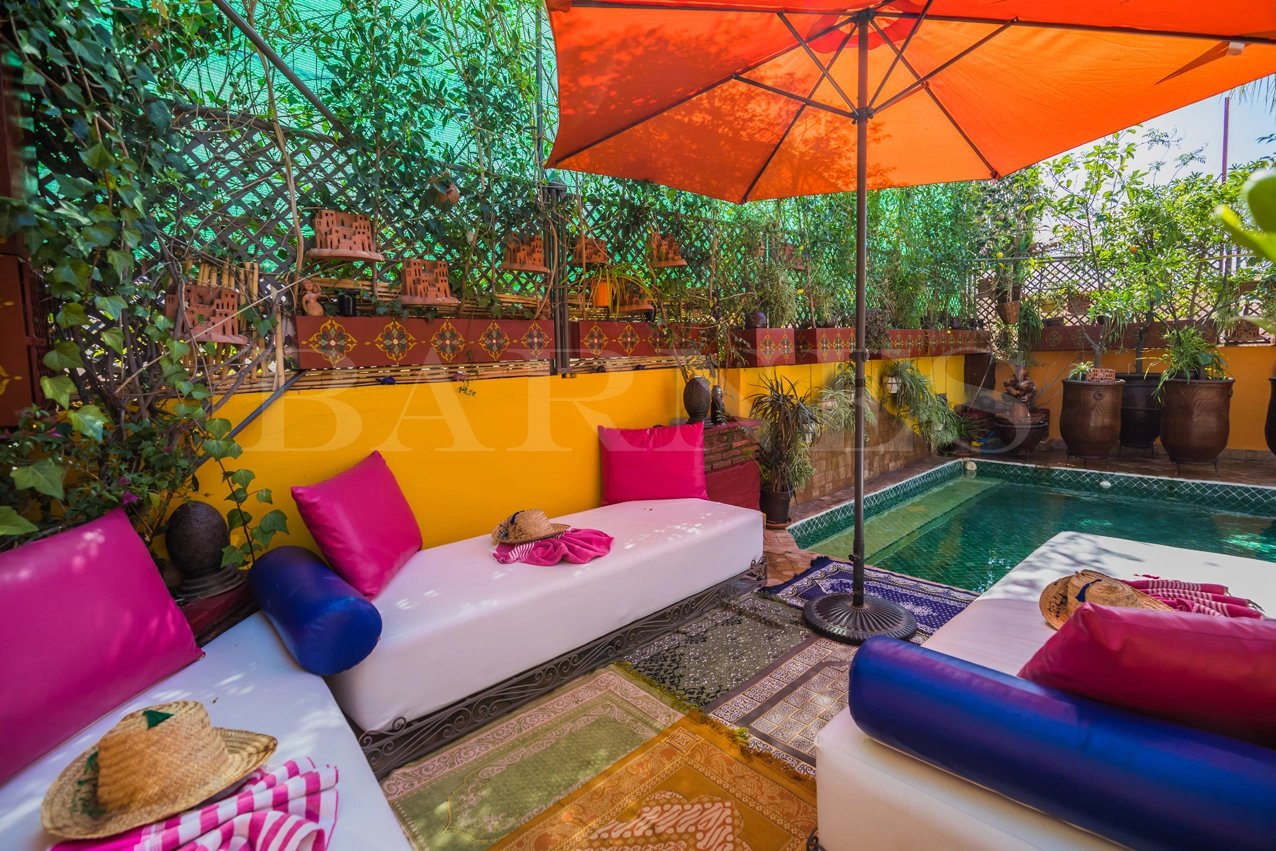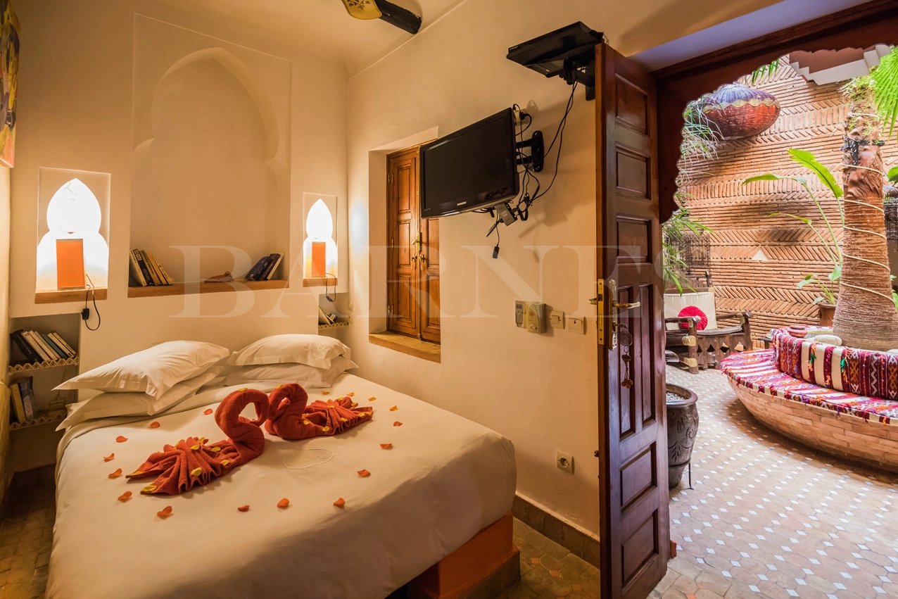 "This riad guesthouse for sale in Marrakech is located 5 minutes from the Spice Square and 5 minutes from Dar Bacha. It has a surface area of 128 square meters and features 6 bedrooms.