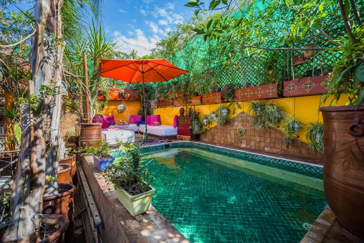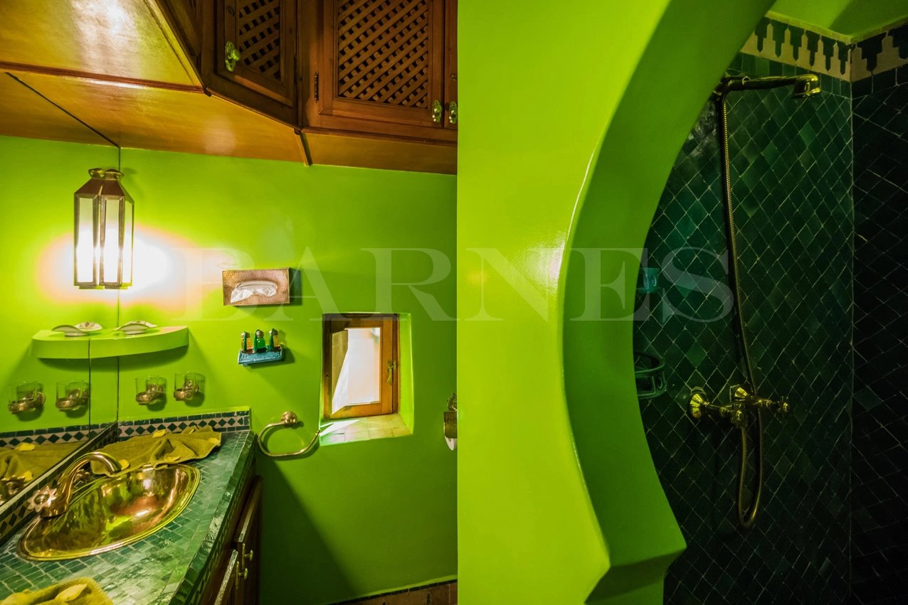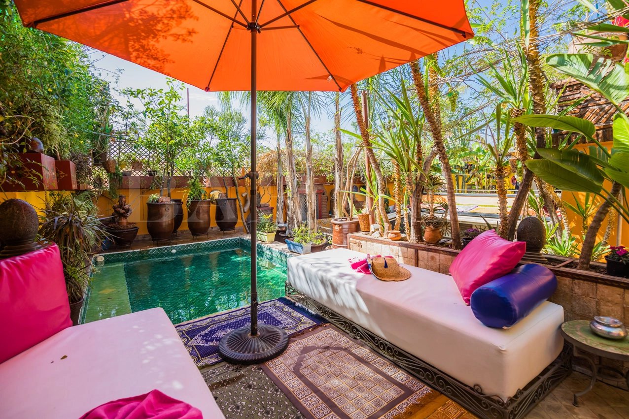 "This riad guesthouse for sale in Marrakech is located 5 minutes from the Spice Square and 5 minutes from Dar Bacha. It has a surface area of 128 square meters and features 6 bedrooms.