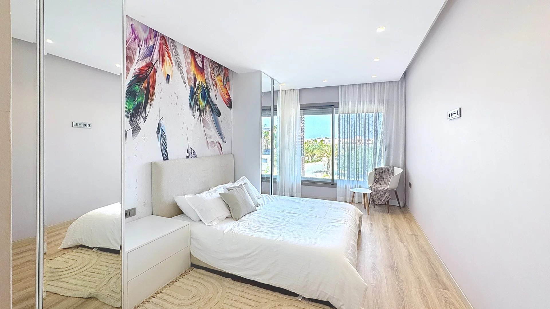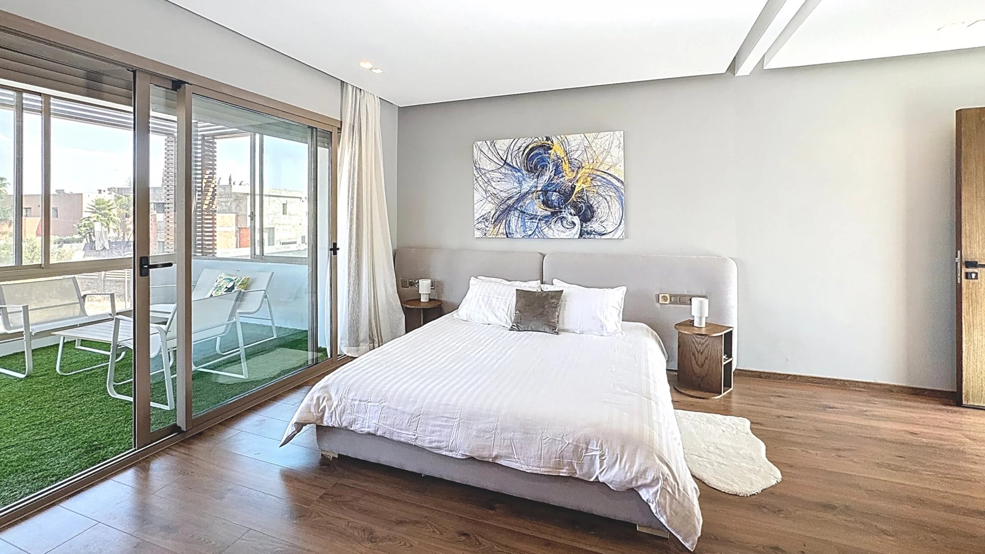 A beautiful master suite with walk-in closet, private bathroom, and a covered terrace arranged as an outdoor lounge