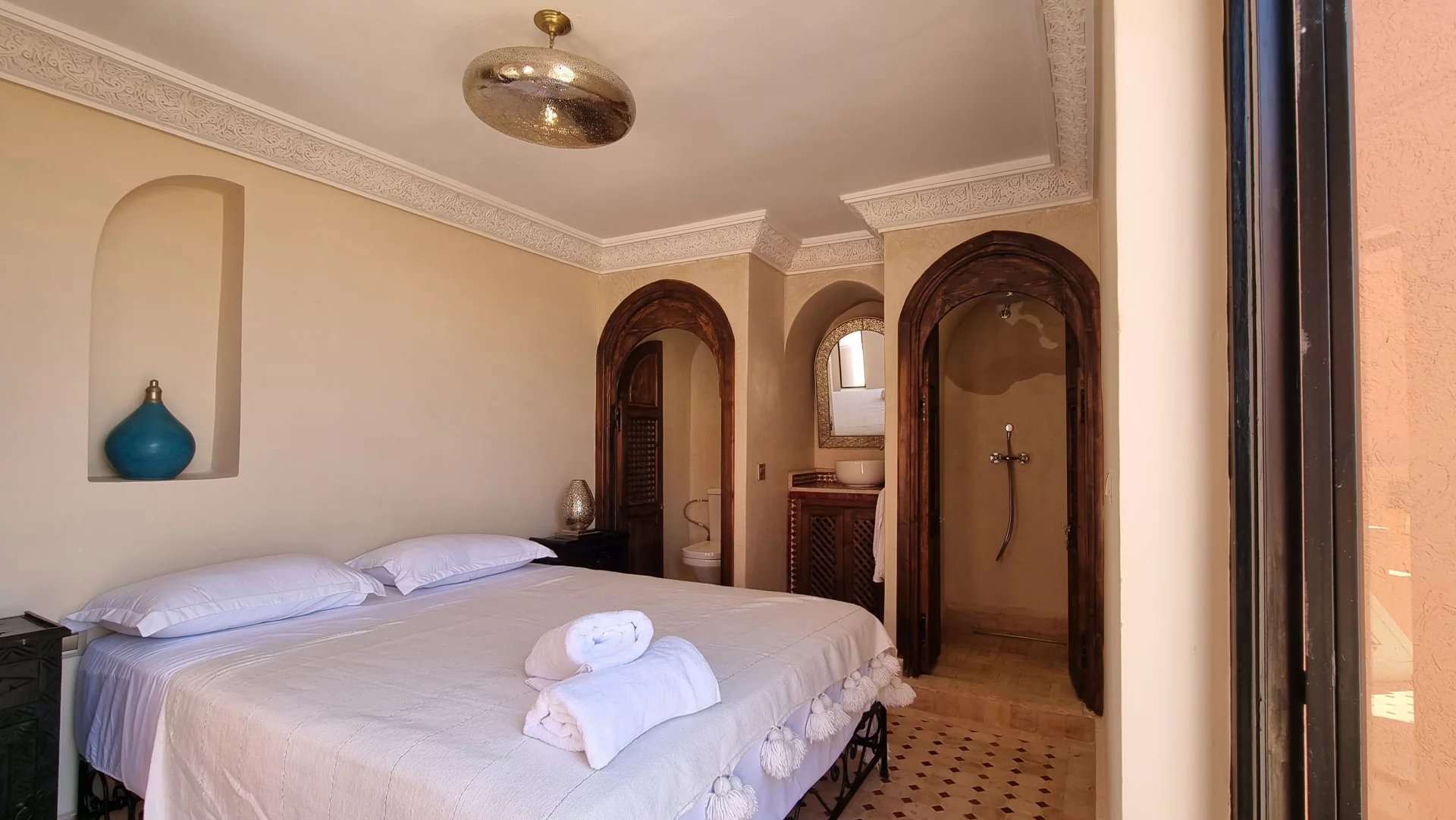 There is a solarium area, a dining area, various relaxation spaces, and a superb bedroom with a bathroom from where, lying in your bed, you can contemplate the Koutoubia and dreamlike sunsets.