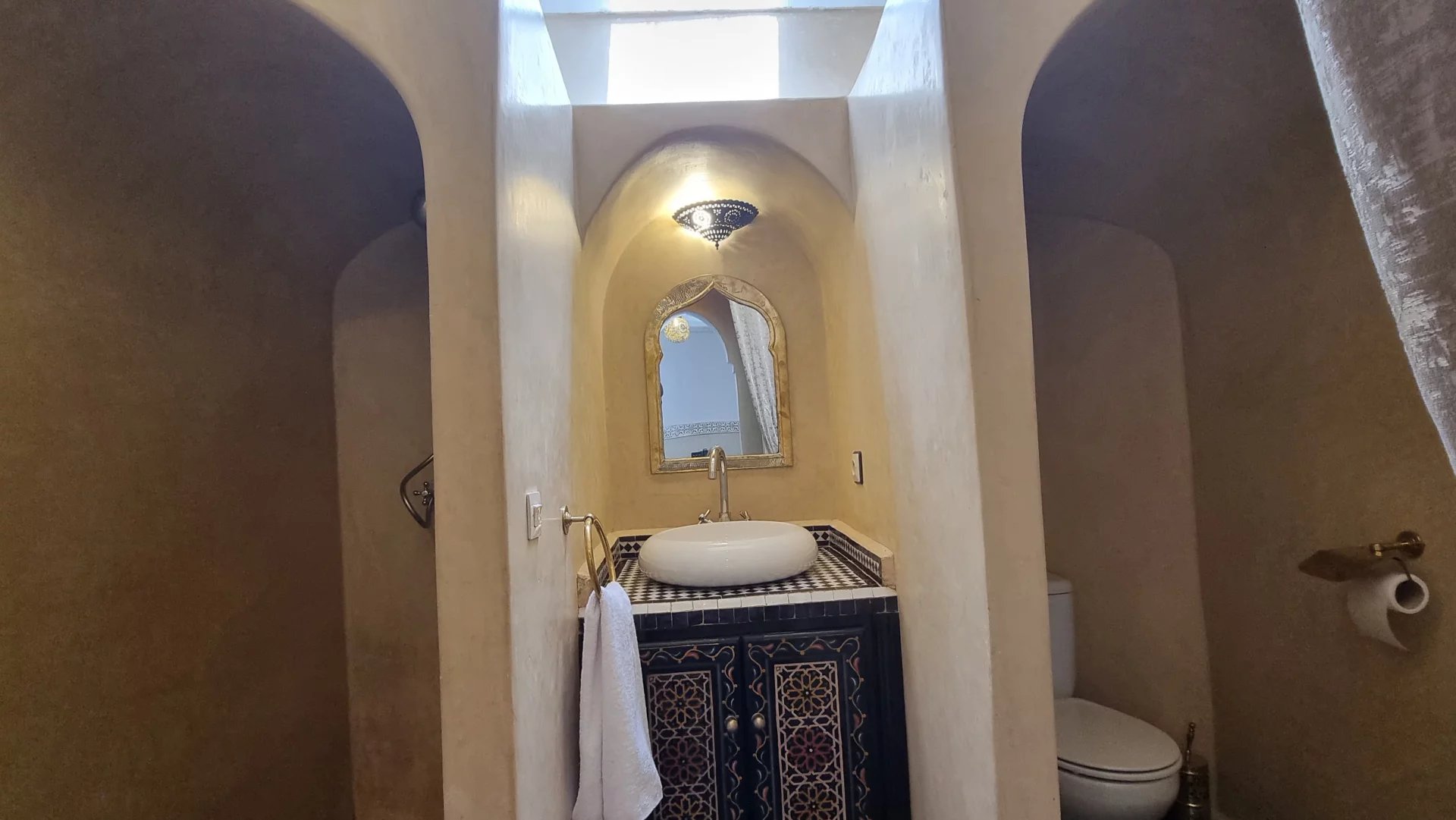 With a ground area of 126m², it consists of a ground floor with an entrance with guest toilets leading to a stunning, bright patio, a beautiful pool, a fully equipped kitchen, a living room, a dining room, a Bhou (a Moroccan lounge), and also a bedroom with a bathroom.
