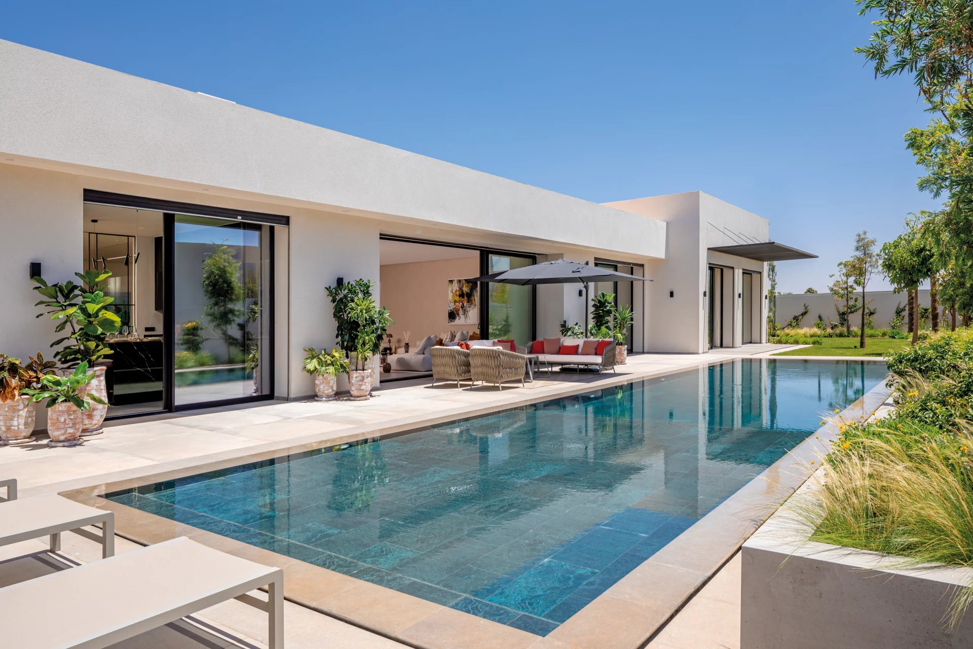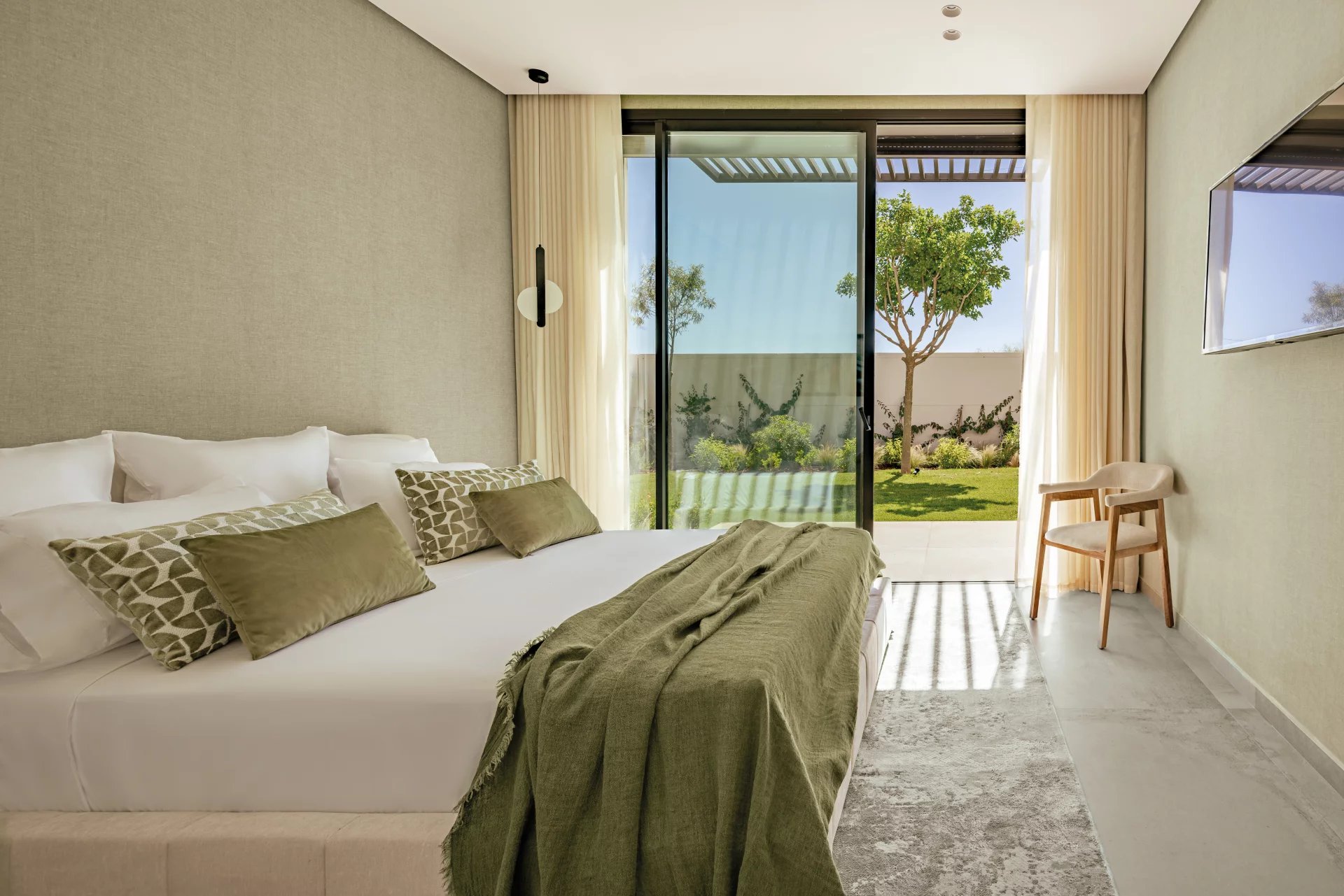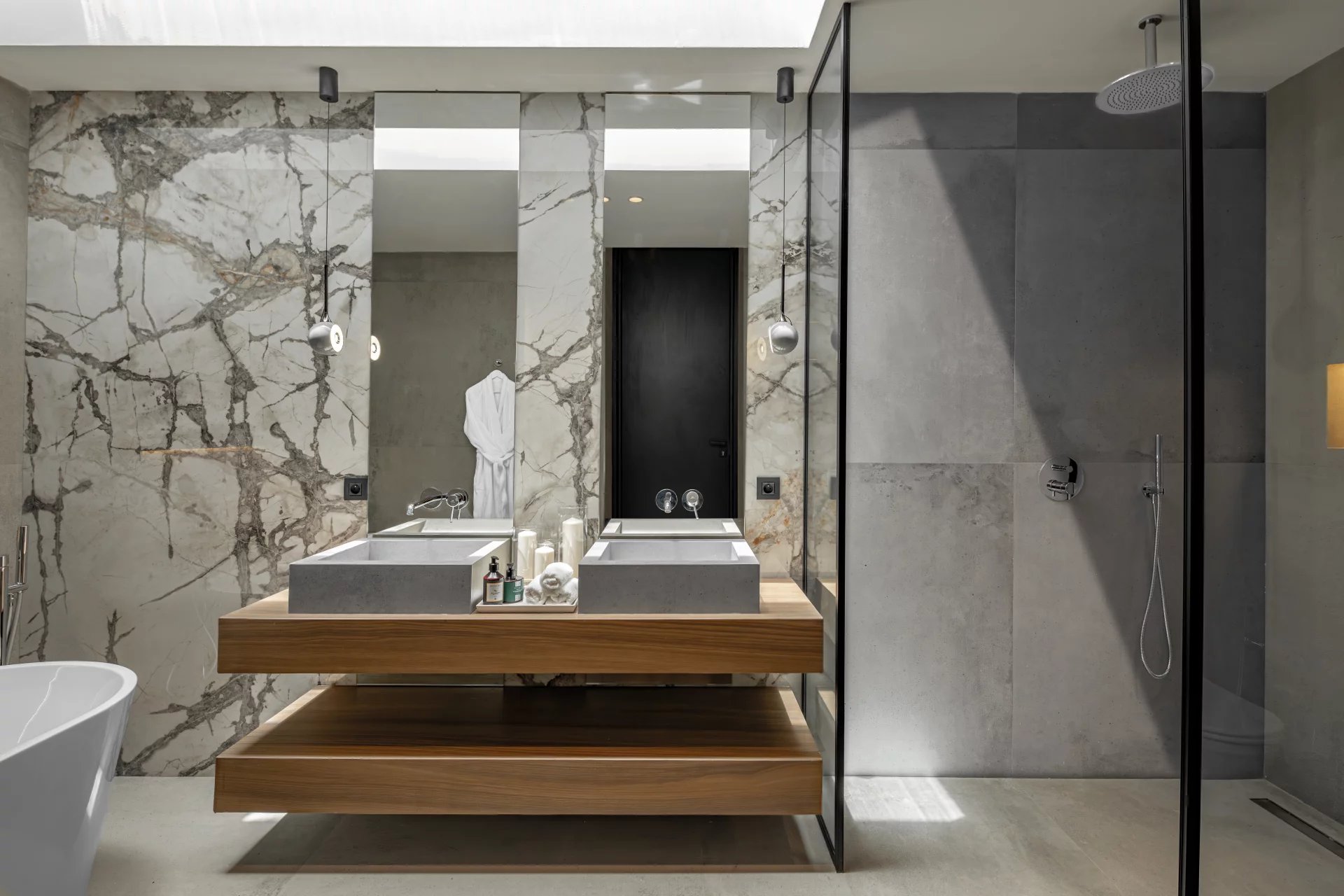 Each single-storey villa boasts a spacious double living room with a fireplace and a view of the pool, a dining room, an Italian-designed equipped kitchen, 4 suites with dressing rooms and en-suite bathrooms, including a master suite. It also includes a service kitchen and a staff room with a separate access.