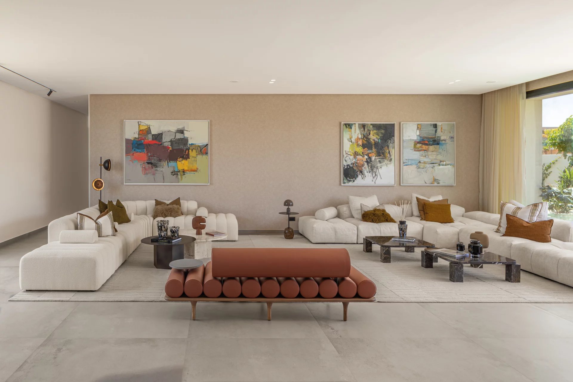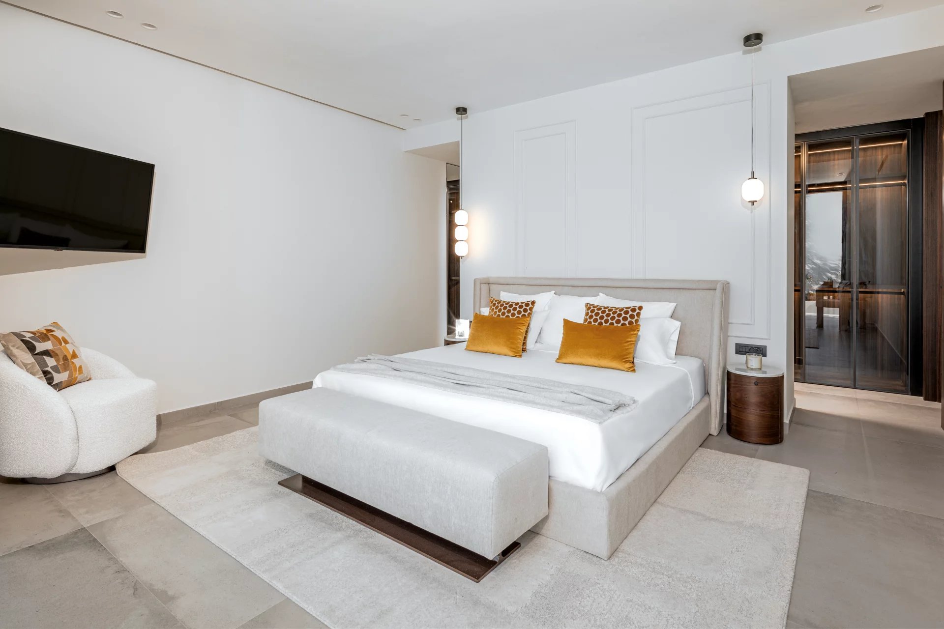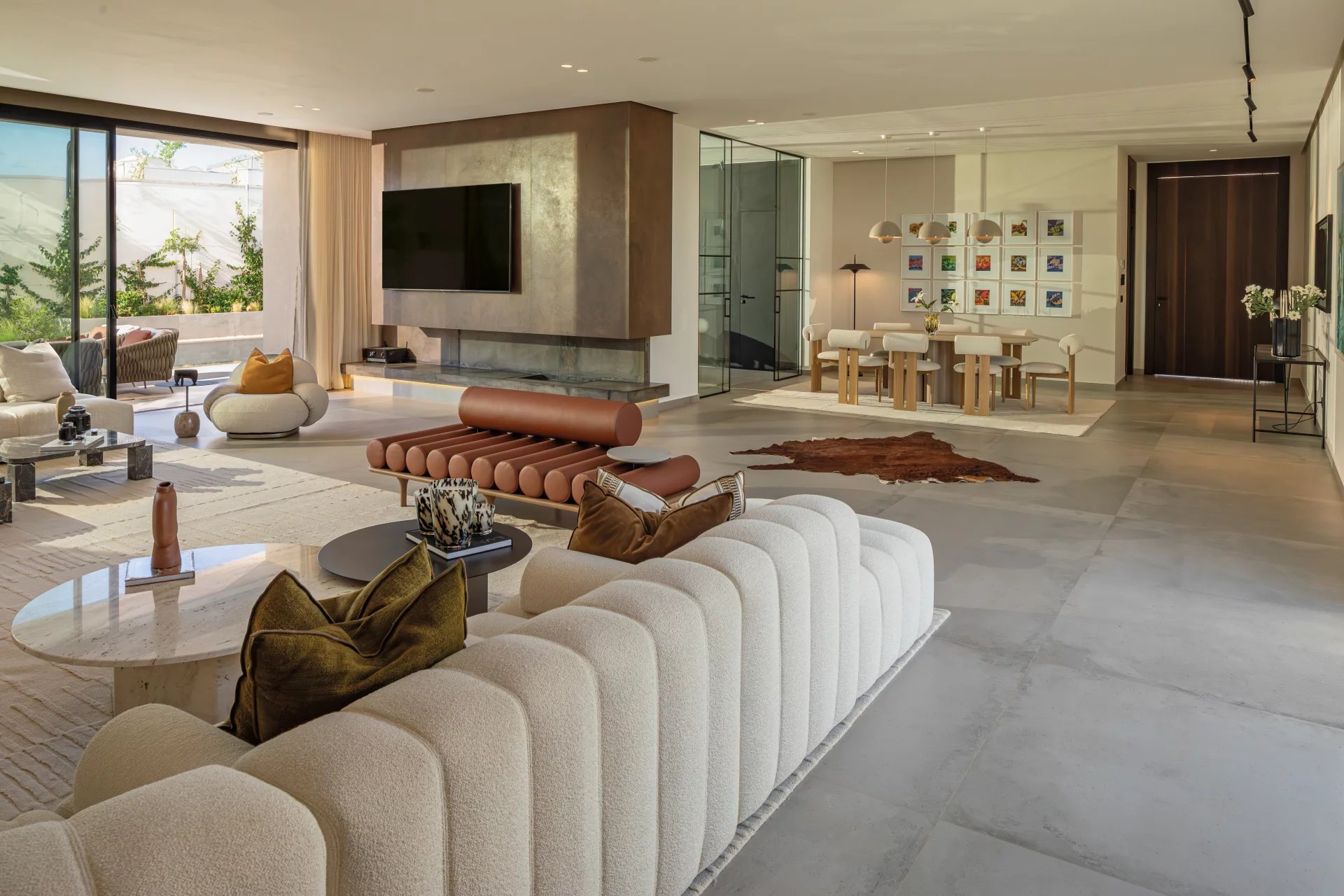 Each single-storey villa boasts a spacious double living room with a fireplace and a view of the pool, a dining room, an Italian-designed equipped kitchen, 4 suites with dressing rooms and en-suite bathrooms, including a master suite. It also includes a service kitchen and a staff room with a separate access.