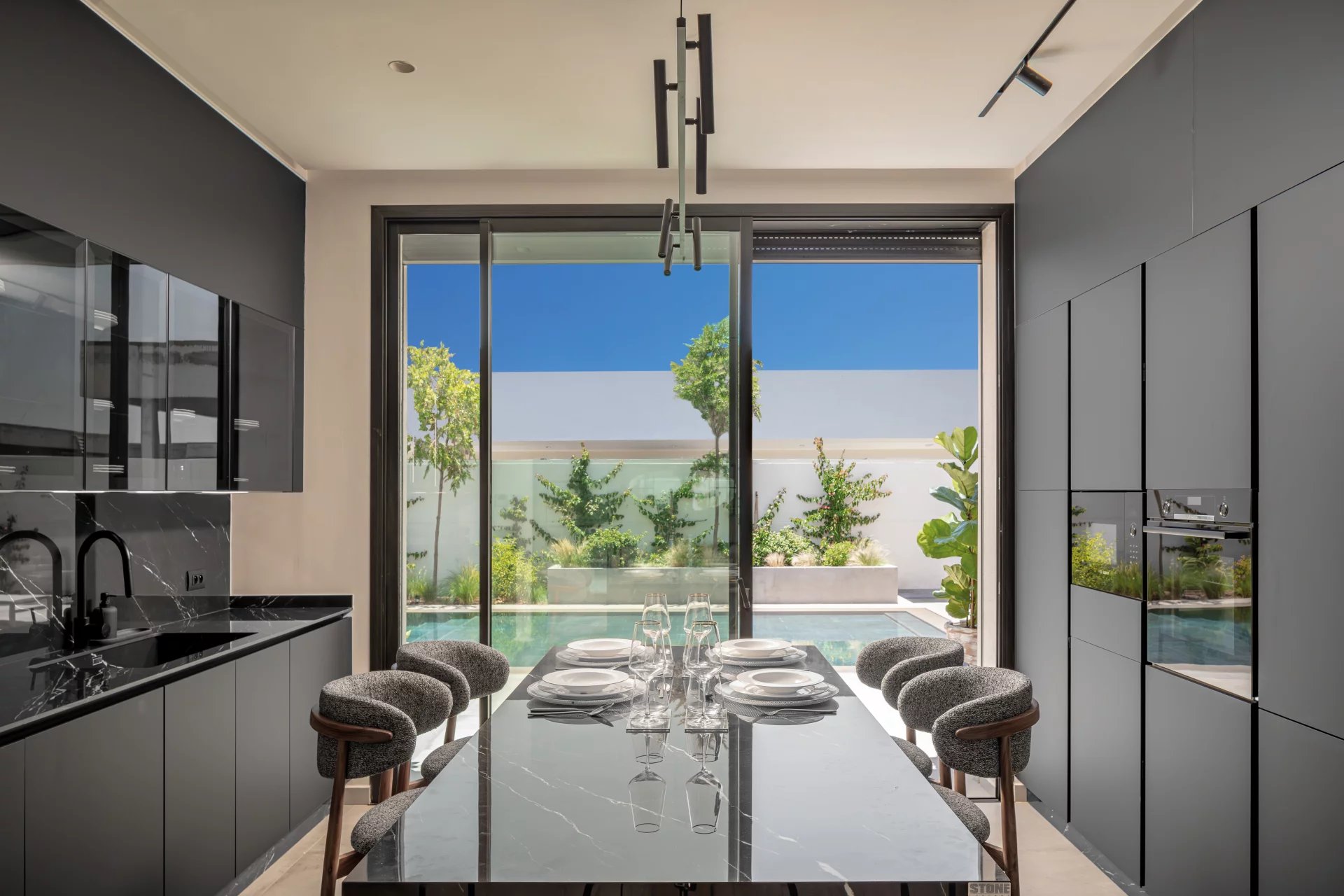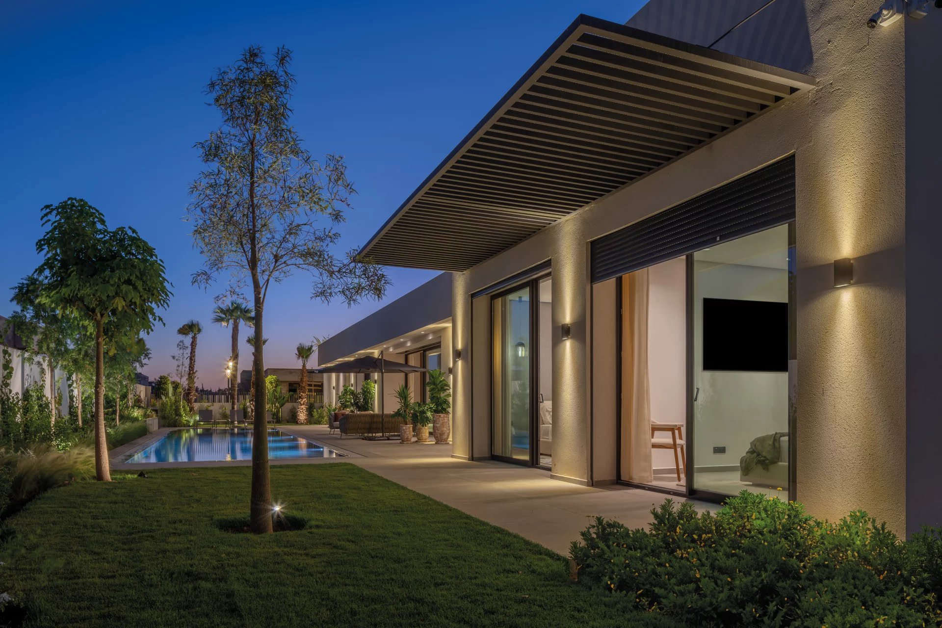 The exterior layout of the villas includes a large south-facing landscaped garden with no direct neighbors, featuring an automated irrigation system and night lighting. A heated infinity pool is complemented by a terrace that connects to the large living room and the main kitchen. Additionally, there is a two-car shelter.