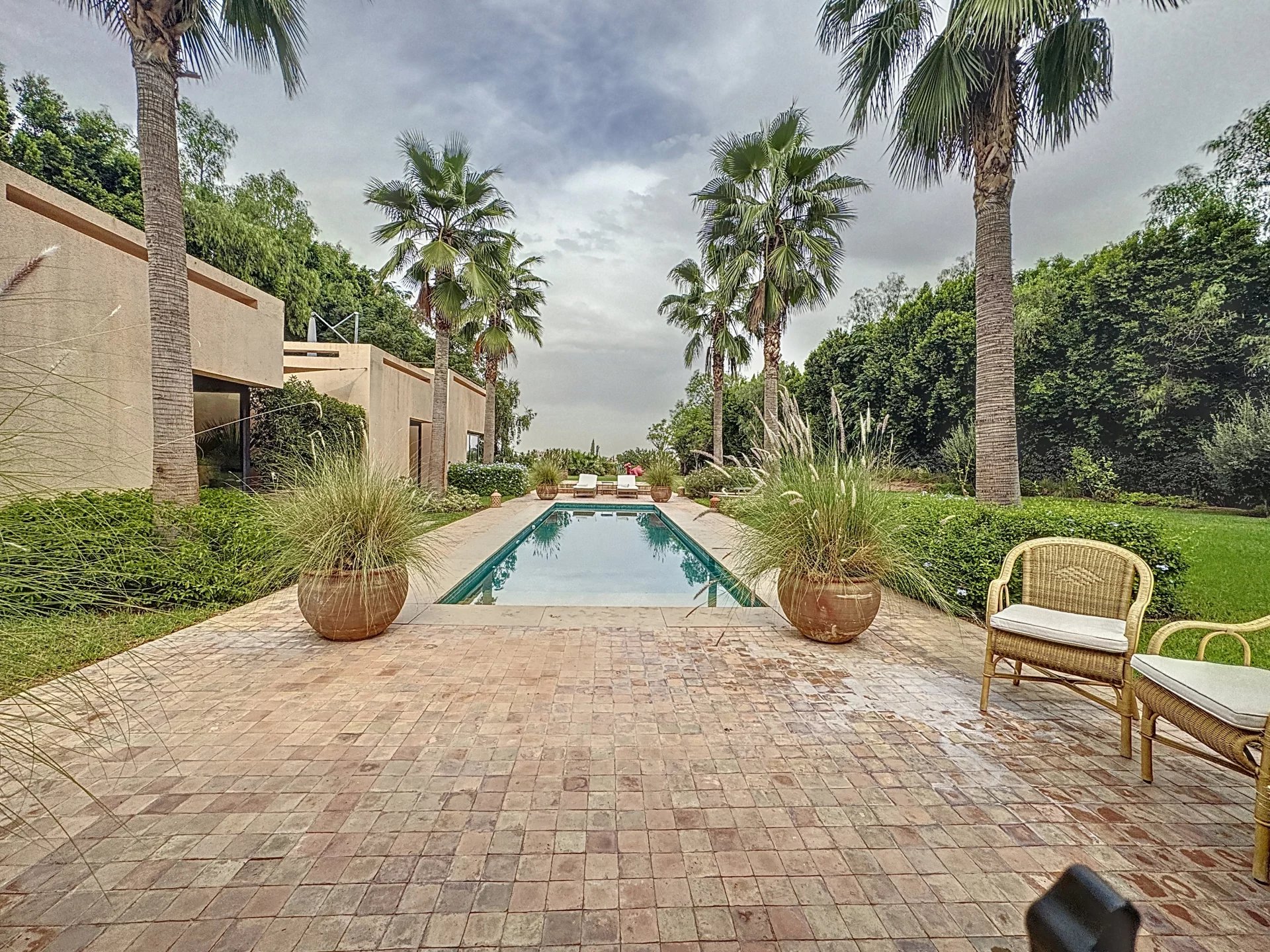 Located just 15 minutes from the city center of Marrakech, this sumptuous single-story villa, with an area of 400 m², is built on a landscaped plot of 3,000 m², offering an unobstructed view of the golf course.