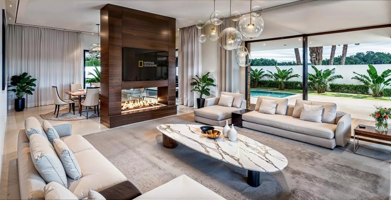 Spacious reception area with 2 living rooms, a dining room, and a fully equipped kitchen.