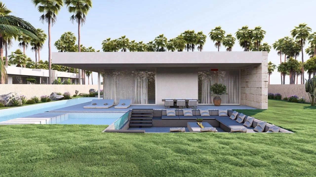 A contemporary single-story villa within a resort of 16 villas, located just 5 km from the city center. Set on a beautiful 1,515 m² plot, this villa offers a living space of 367 m², featuring 4 spacious and bright suites, including a master suite. The villa consists of large open lounges, dining areas, a TV lounge, and a living room with a fireplace. All spaces open onto expansive terraces and gardens, with the majestic Atlas mountain range as a backdrop
