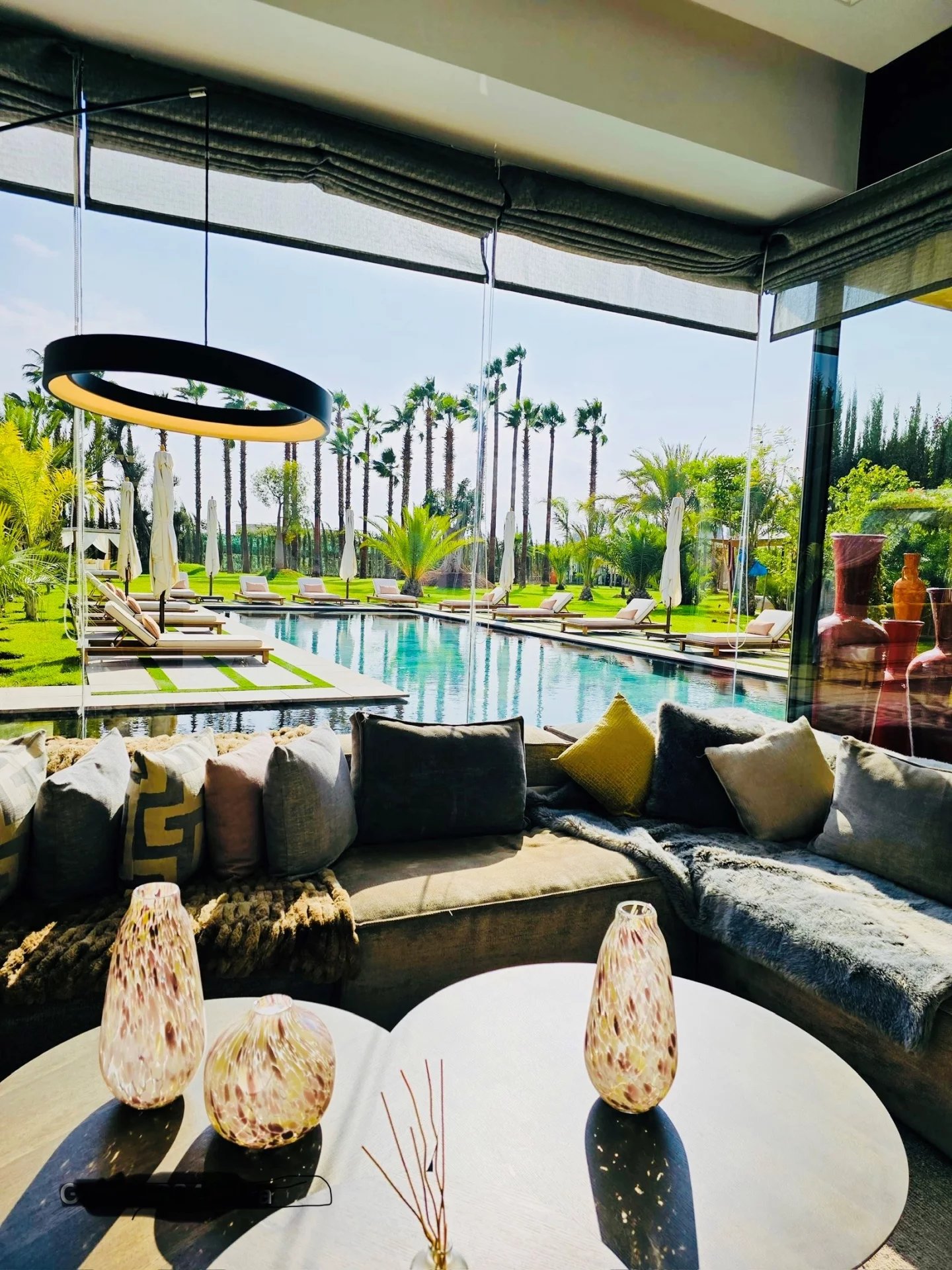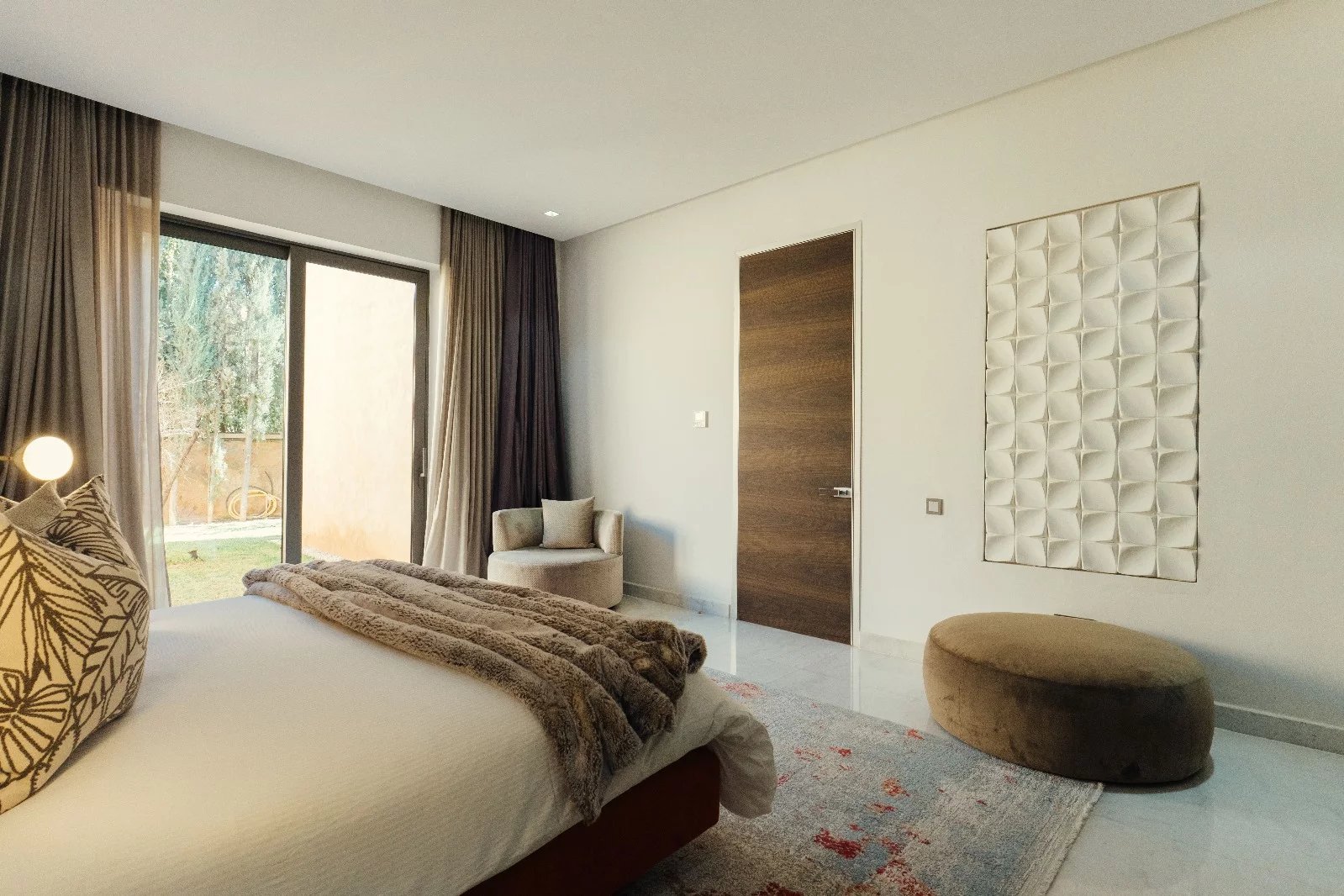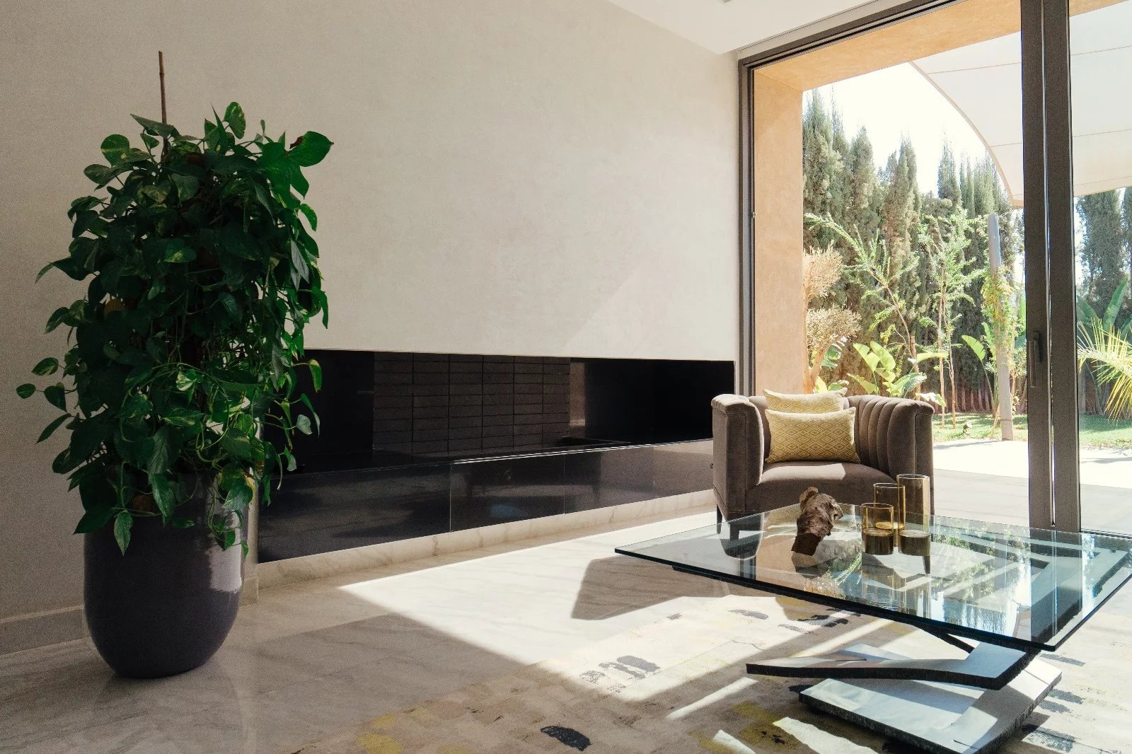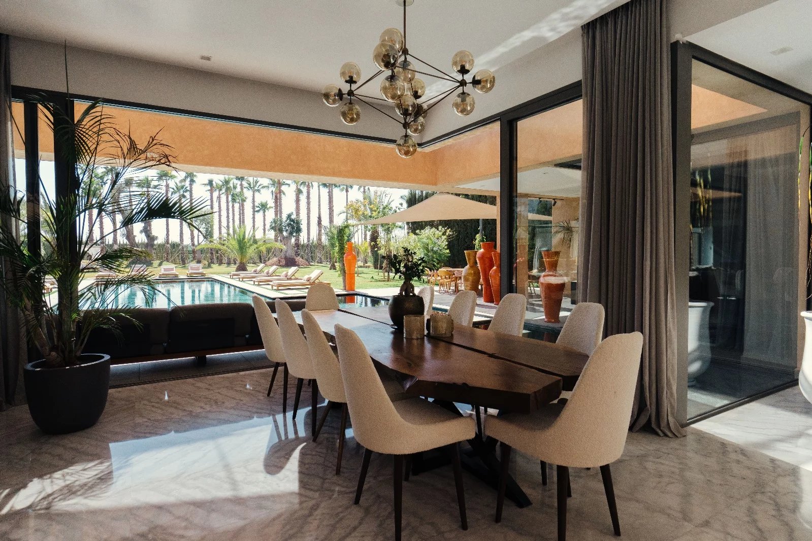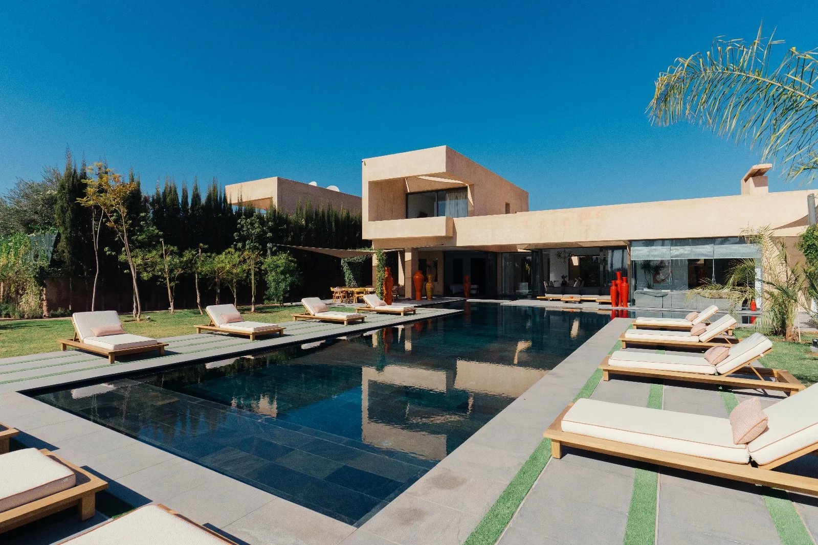 Nestled in a handsome landscaped 3 800 sqm garden hosting a substantial swimming-pool, a tented suite, a fitness as well as a shaded parking, the villa with pure and moderne lines boasts luxury finishings. The views over the Atlas mountains are utterly awesome.