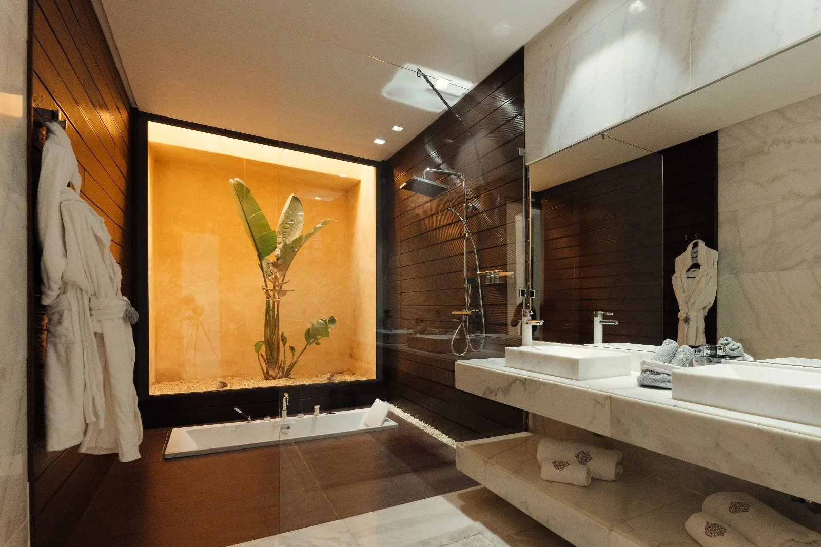 The villa comprises over 2 floors: an entrance with guest loo, large and airy living areas with fireplace opening onto the pool, a modern fitted kitchen, 5 well apppointed ensuite bedrooms and a full spa combing a hammam and a room for treatments.