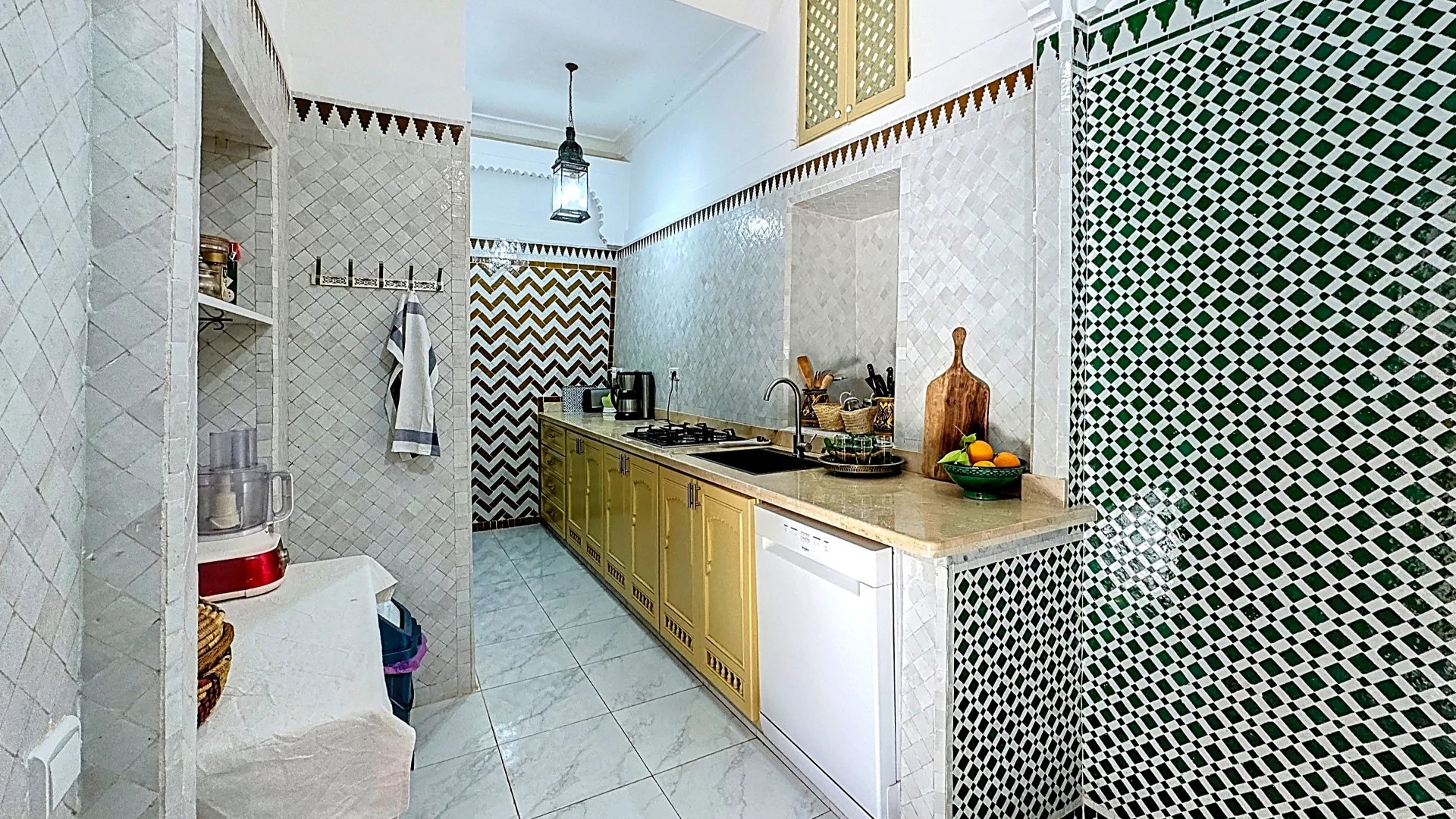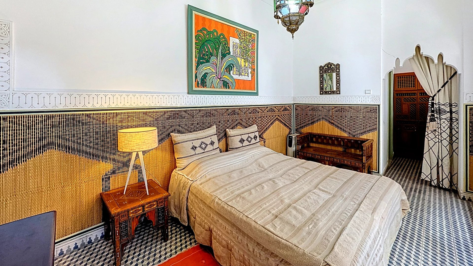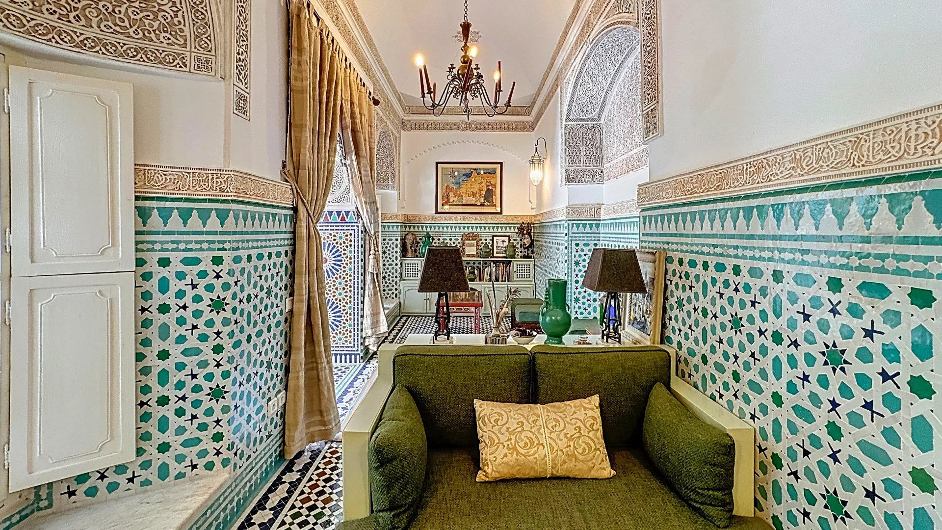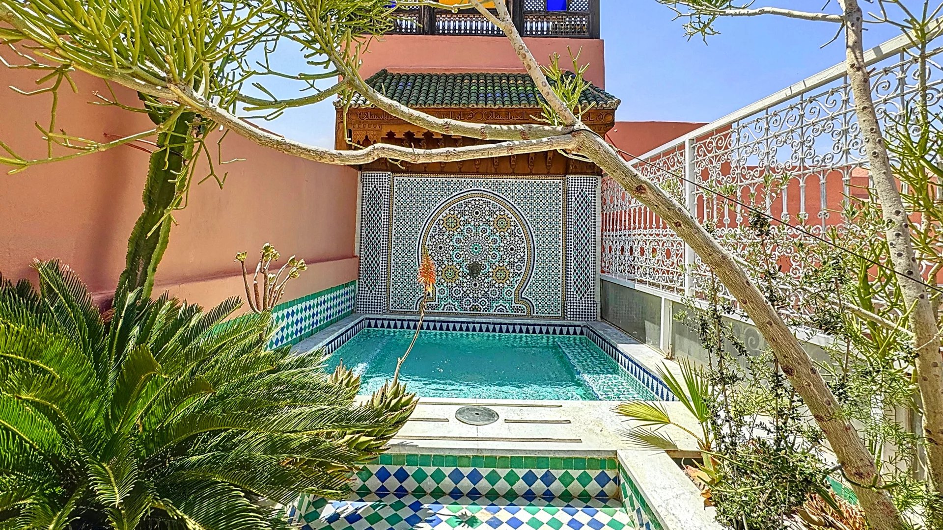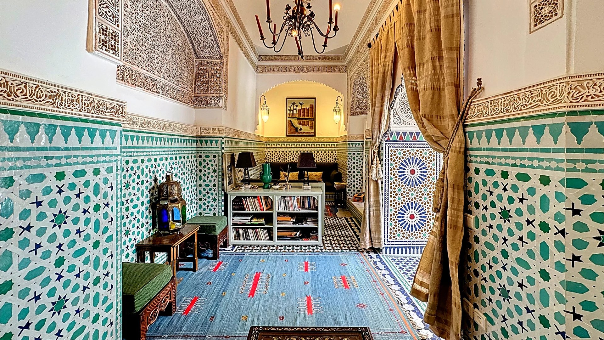 The riad stands out thanks to its original architectural features: ancient doors, true works of art, tell their own story and add undeniable character. The walls adorned with handcrafted Fassi zellige (tiles from Fez) reflect a centuries-old artisanal tradition, adding splendor to every room.