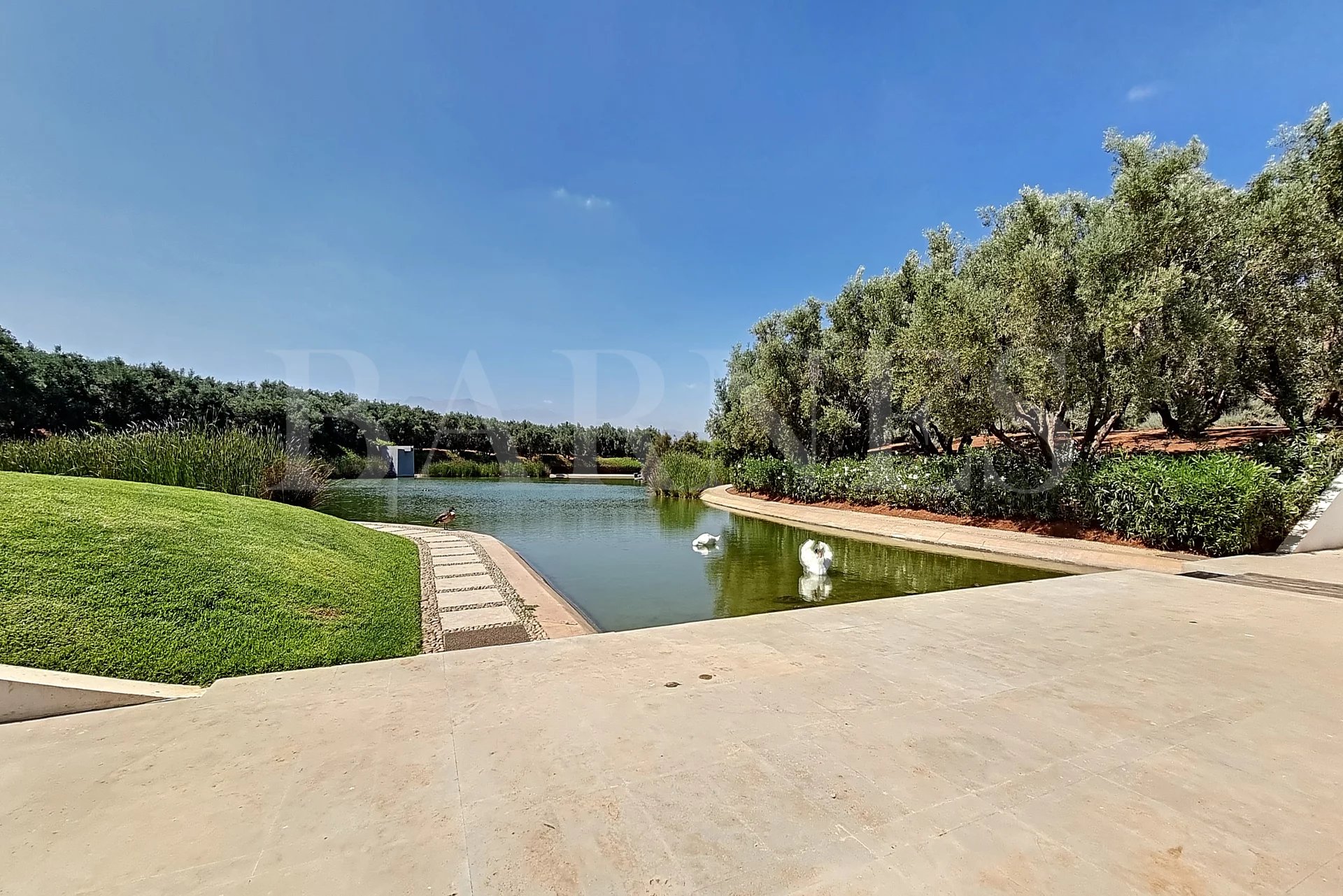 The 4-hectare landscaped and wooded plot includes a 5,000 m2 body of water followed by a decidedly modern 50-meter-long swimming pool. The main house blends perfectly into this green setting. The apparent simplicity of the volumes discreetly underlies the extreme sophistication of all technical devices (underfloor heating, reversible air conditioning, heated pool, etc.). The main building offers 2 bedrooms, one with its private pool, Moroccan-style bathrooms with a revisited tadelakt to match the modern aesthetic of the rest of the house, a spa, a cinema room, and various spaces to gather and share friendly moments.