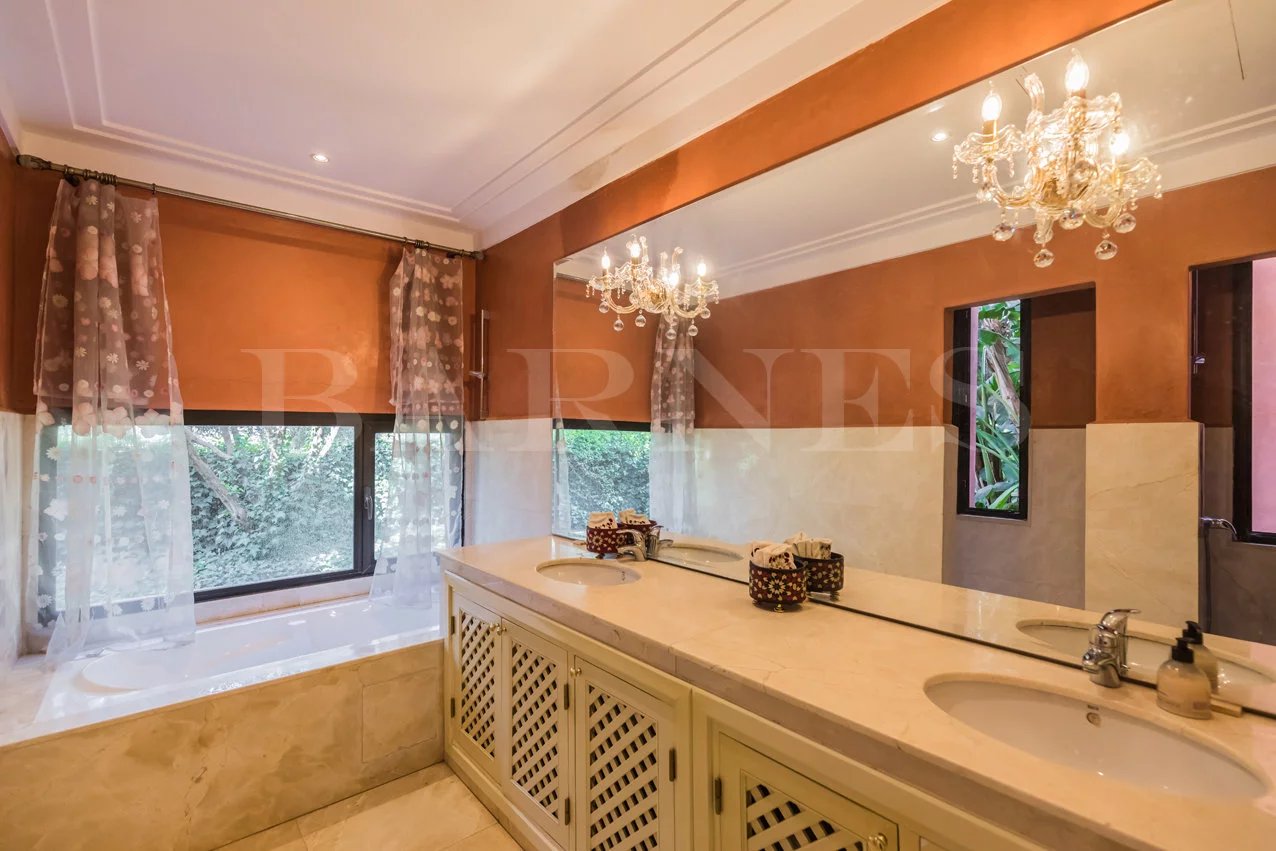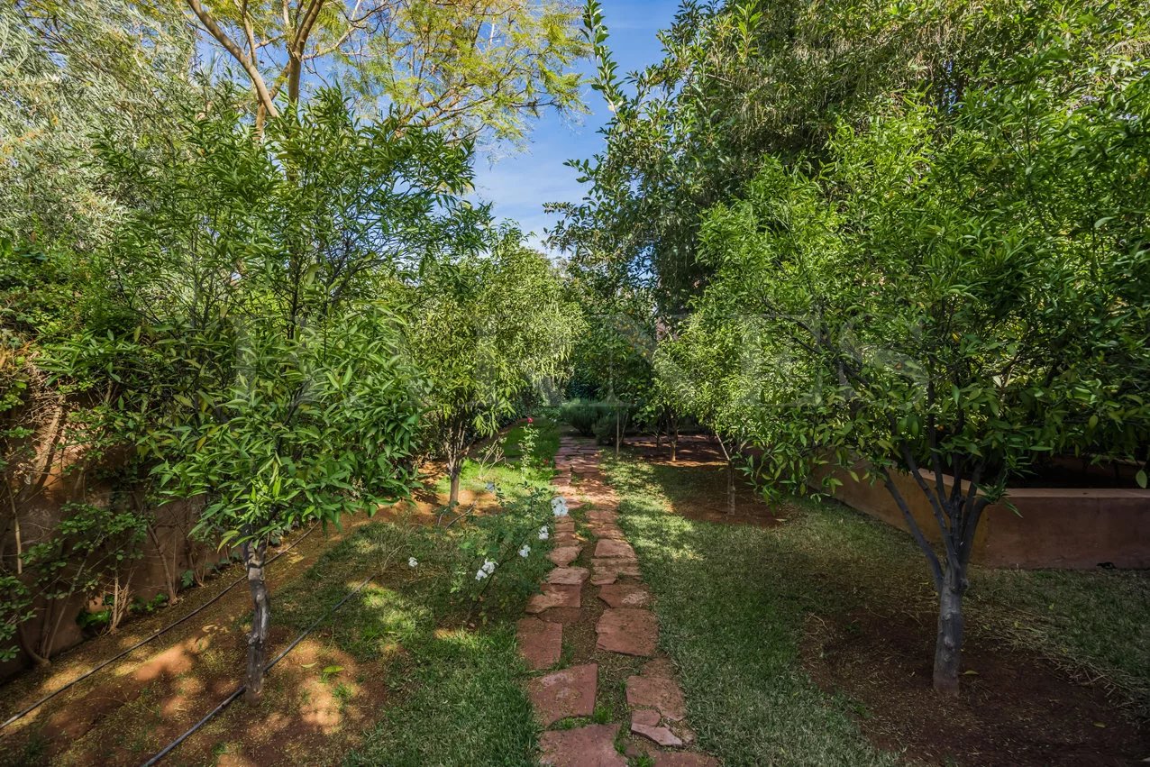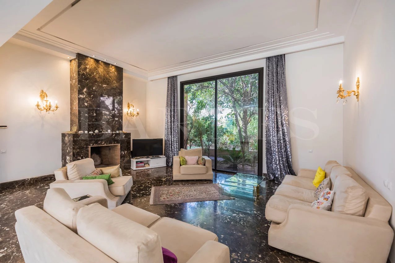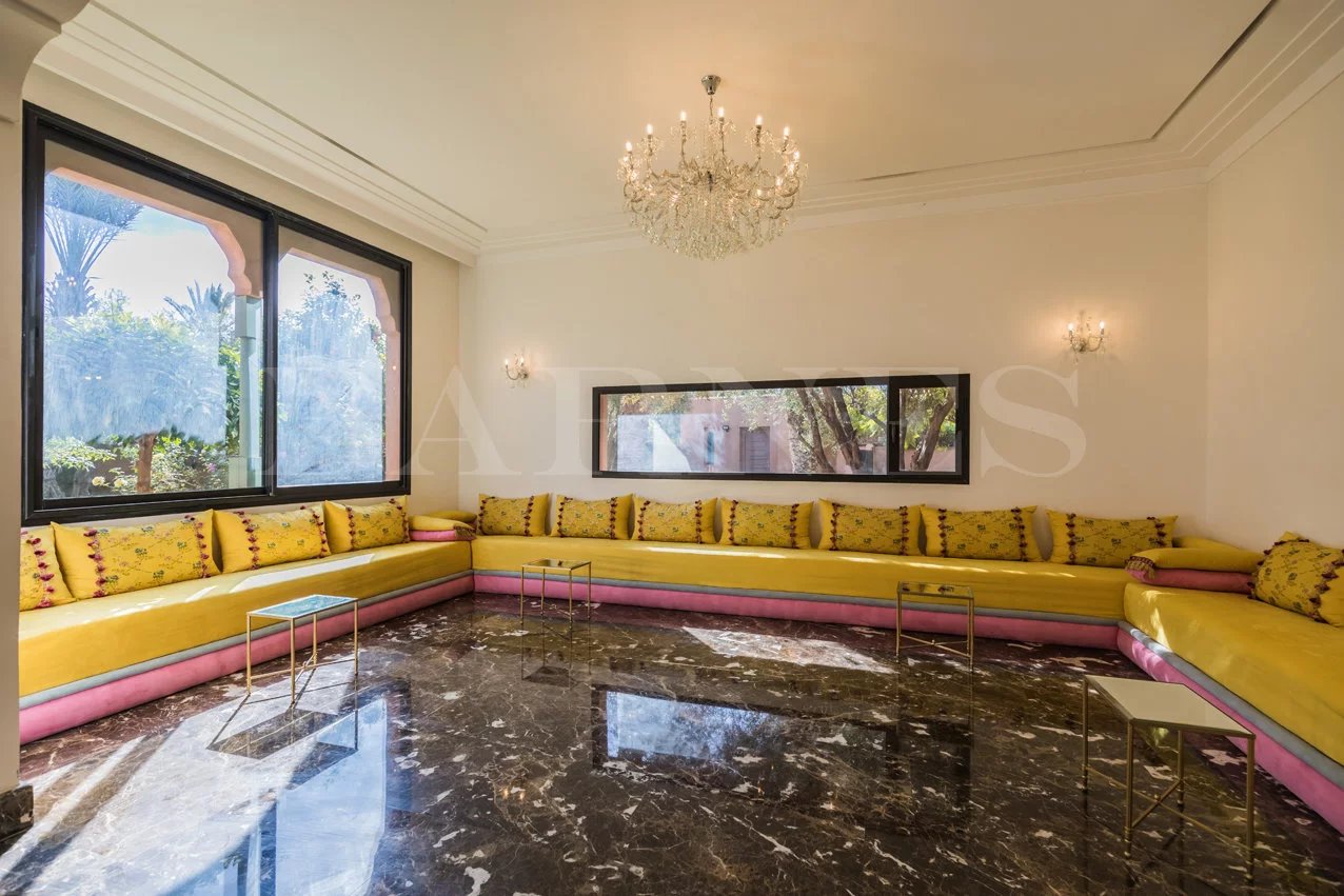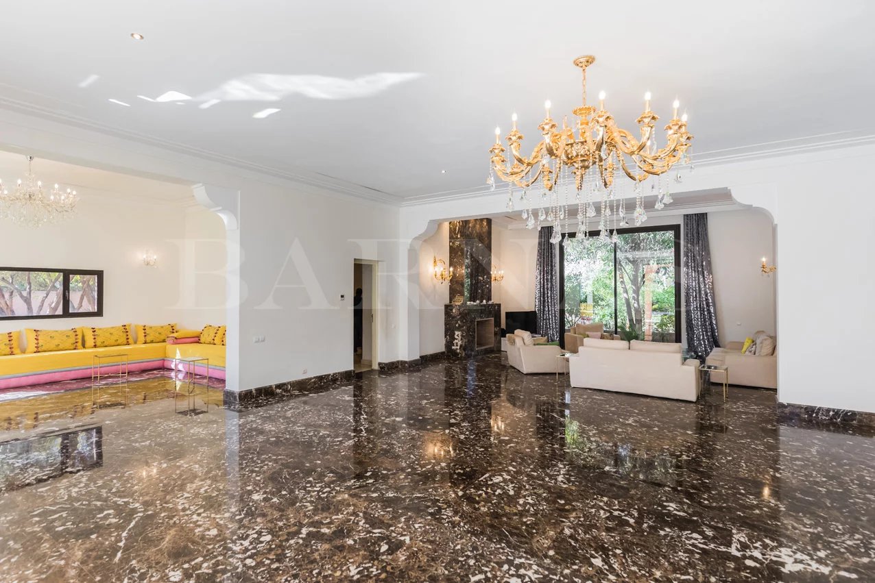 "Beautiful property located in the secure residential area of 'Parcs de l'Agdal,' built on a wooded plot of 2000 m2 with 500 m² of living space. Comprising of a spacious living room with fireplace and dining room of approximately 200 m2, toilet, 3 beautiful bedrooms with bathrooms and a terrace with garden access. Equipped kitchen with terrace and personal space, bedroom, and bathroom for staff.