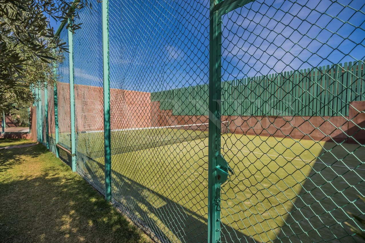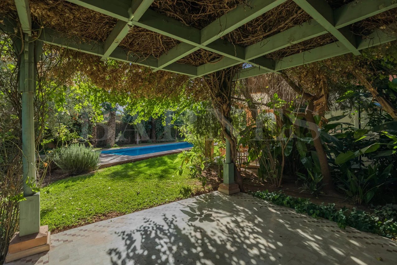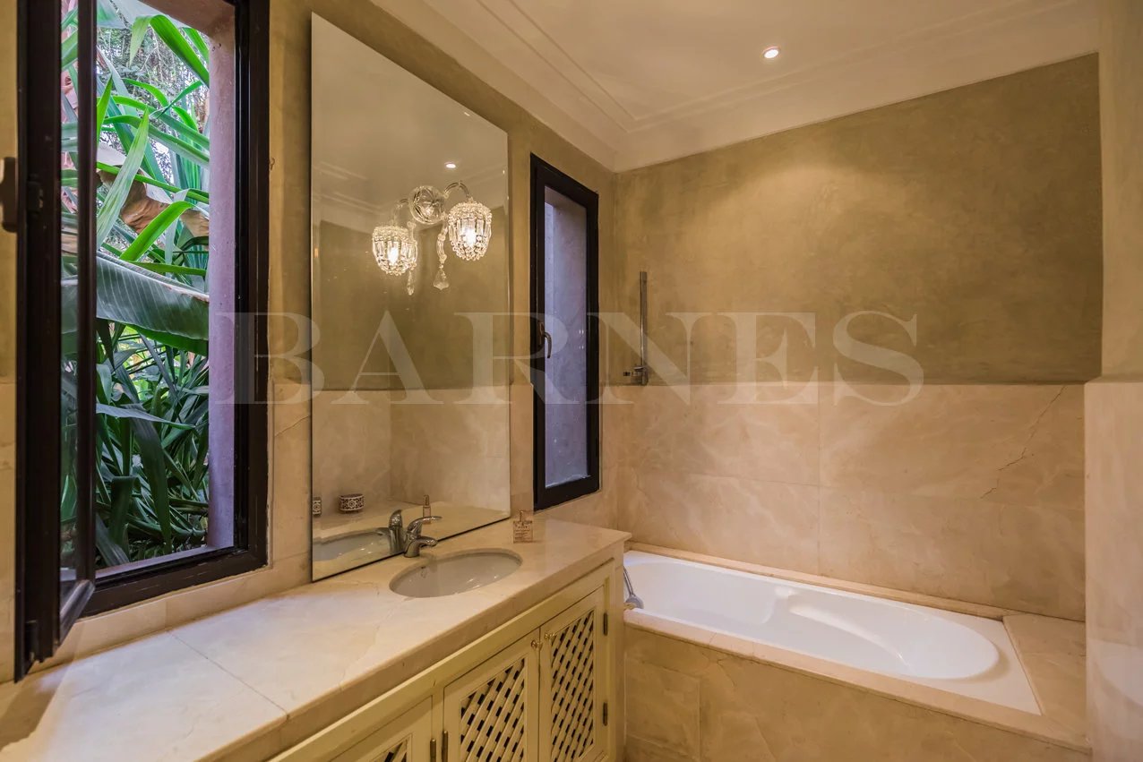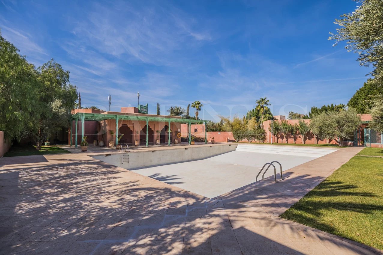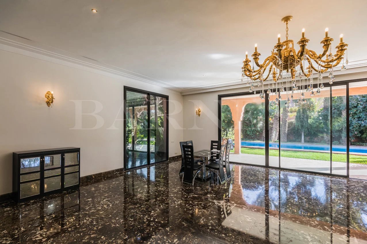 "Beautiful property located in the secure residential area of 'Parcs de l'Agdal,' built on a wooded plot of 2000 m2 with 500 m² of living space. Comprising of a spacious living room with fireplace and dining room of approximately 200 m2, toilet, 3 beautiful bedrooms with bathrooms and a terrace with garden access. Equipped kitchen with terrace and personal space, bedroom, and bathroom for staff.