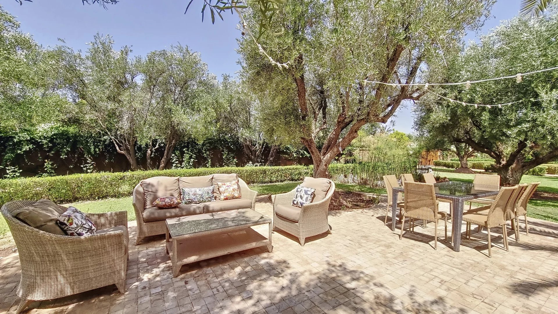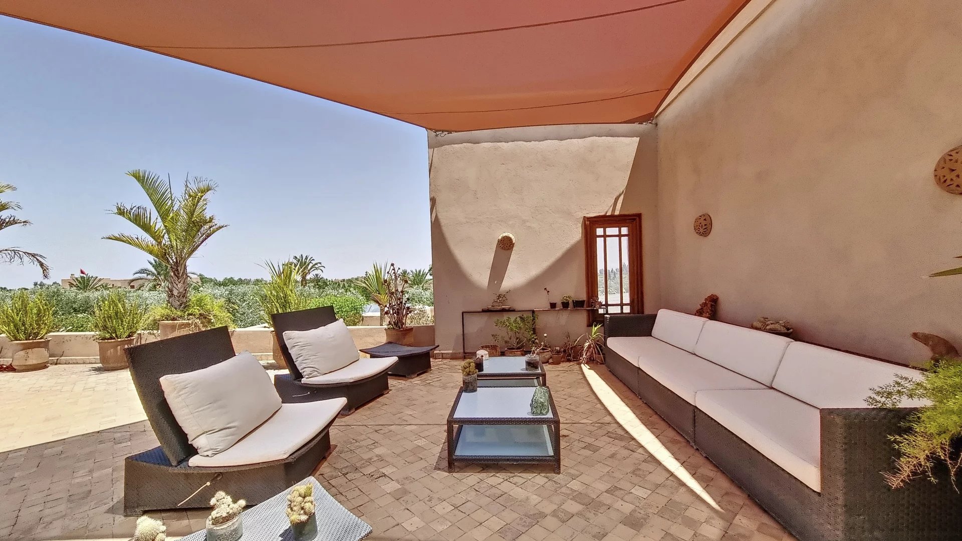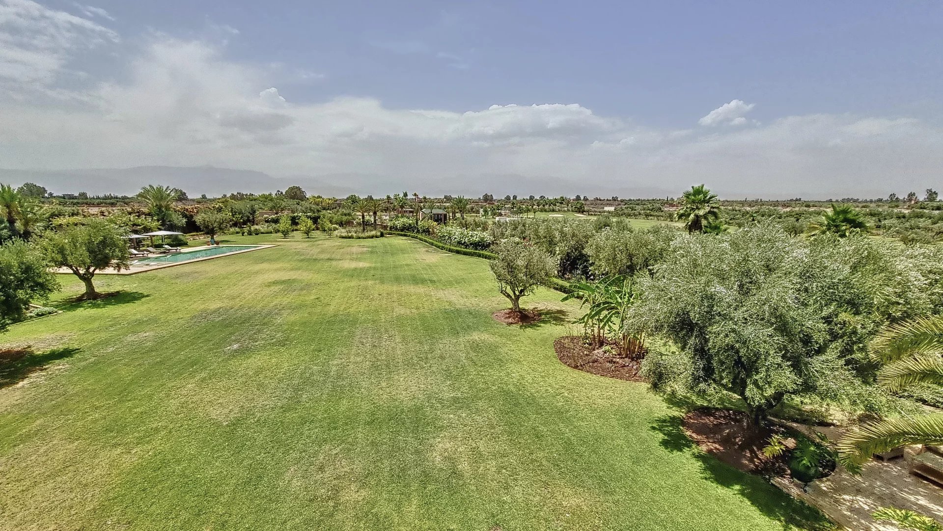Moroccan architecture villa in a private estate of 6 villas, each built on a 1-hectare plot. The villa features 5 beautiful suites, a spacious reception area, solid cedar woodwork, marble floors, and high-quality furniture. Built-up area of 800 square meters. The estate includes a professional golf academy, a fitness center, and a 6000m2 organic garden. Clear view of the Atlas Mountains, high-quality neighborhood.