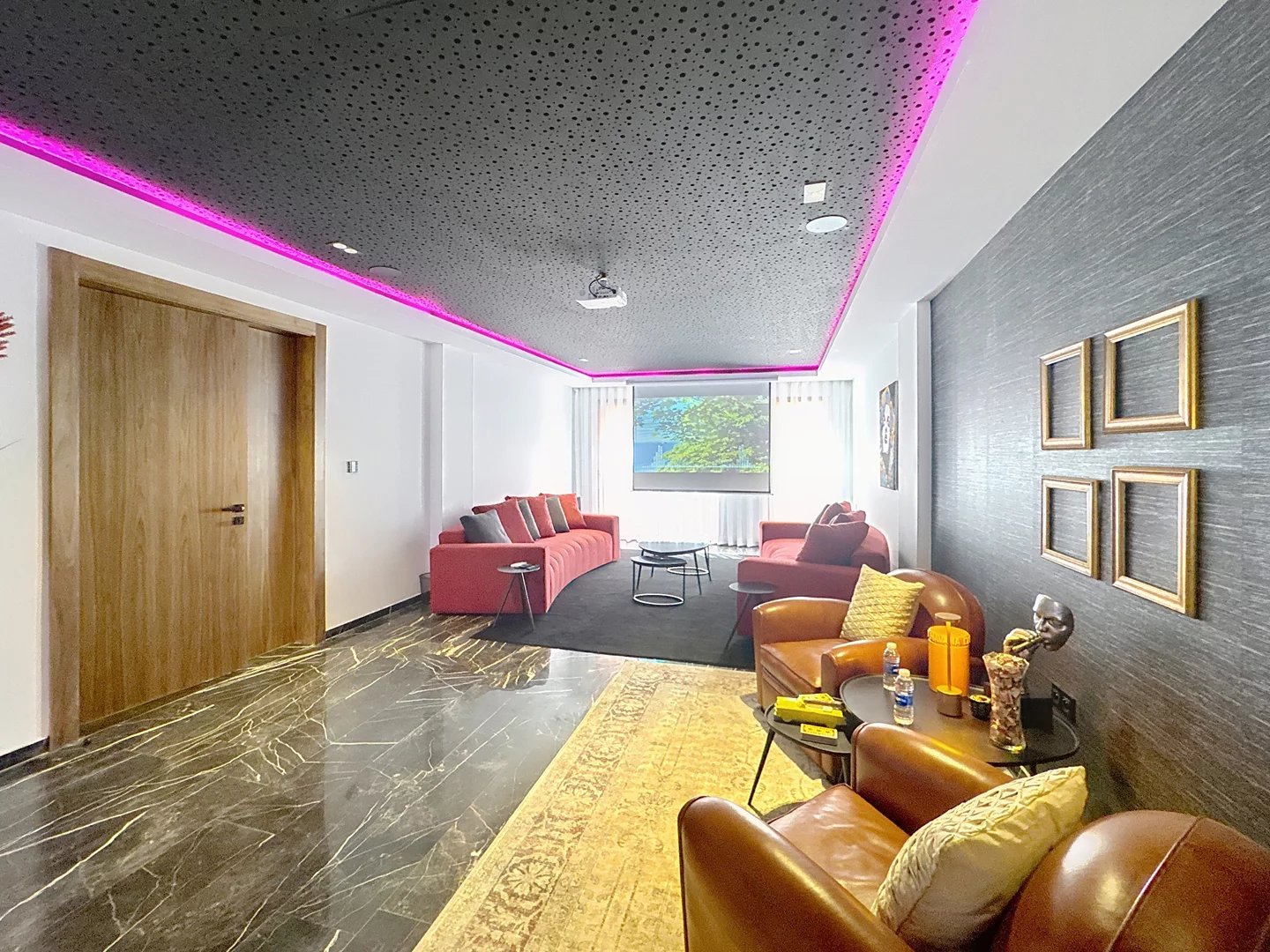 The basement is a versatile and fully equipped living space, featuring a suite, a home cinema with an immersive sound system, a bar, a soundproofed room, and a laundry room.