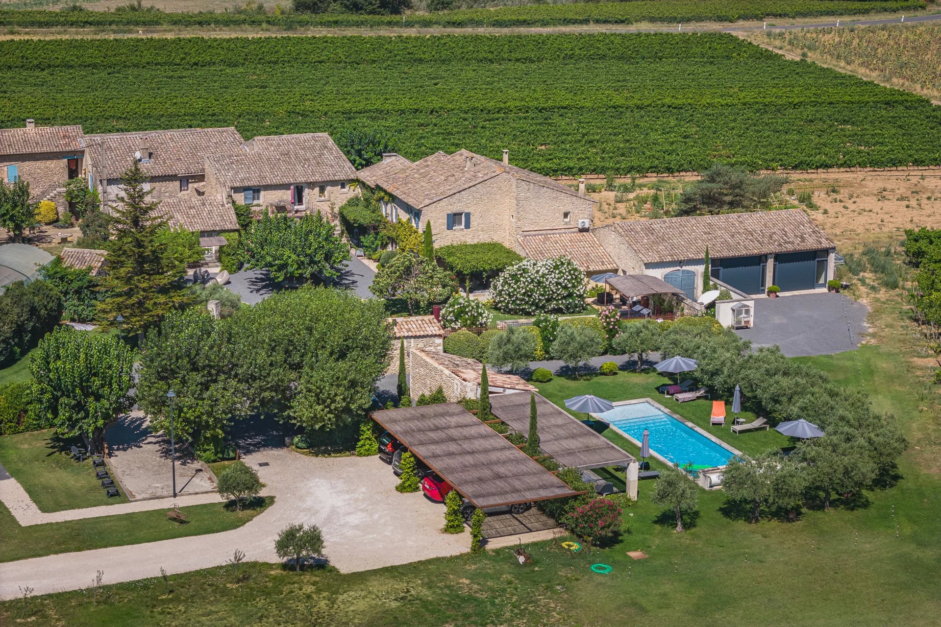 With 1 ha of organically grown vines (farmed), a garden with typical Provencal species and various relaxation areas: a petanque area, a swimming pool/pond (8X4), a poolhouse and a large heated swimming pool (14 X 4.5 X 1.40) with underwater decking surrounded by lawn and olive trees....
