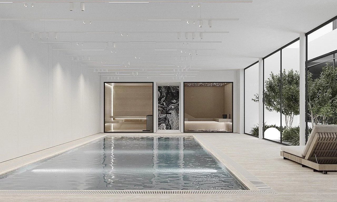 -The lower level features a wellness area with indoor pool, sauna, steam room and gym.