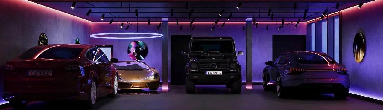 -A magnificent garage for 5 vehicles, fitted out to show them off as if in a showroom.