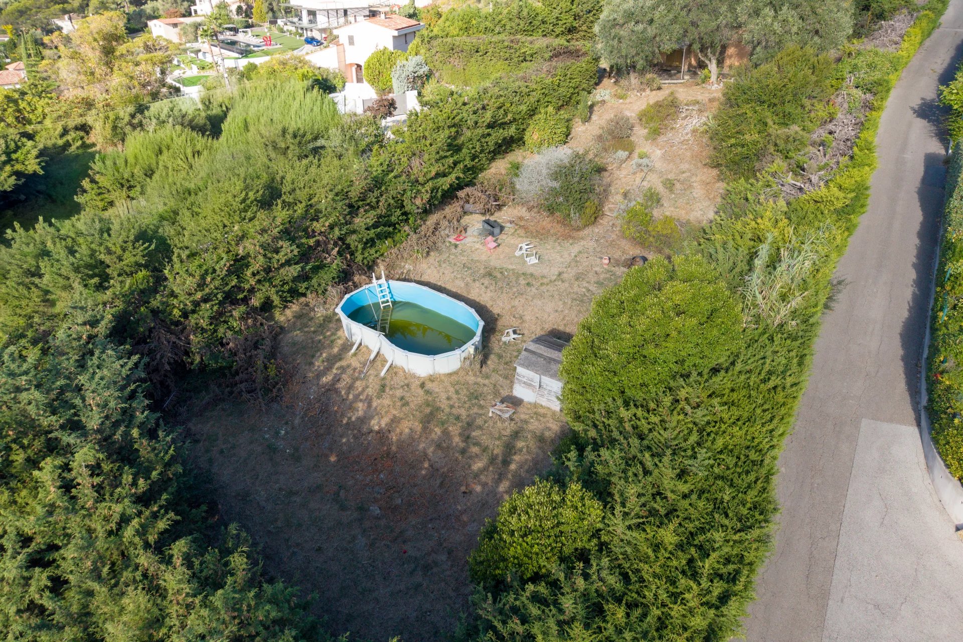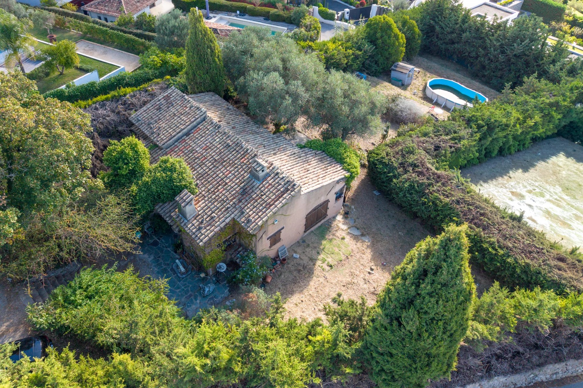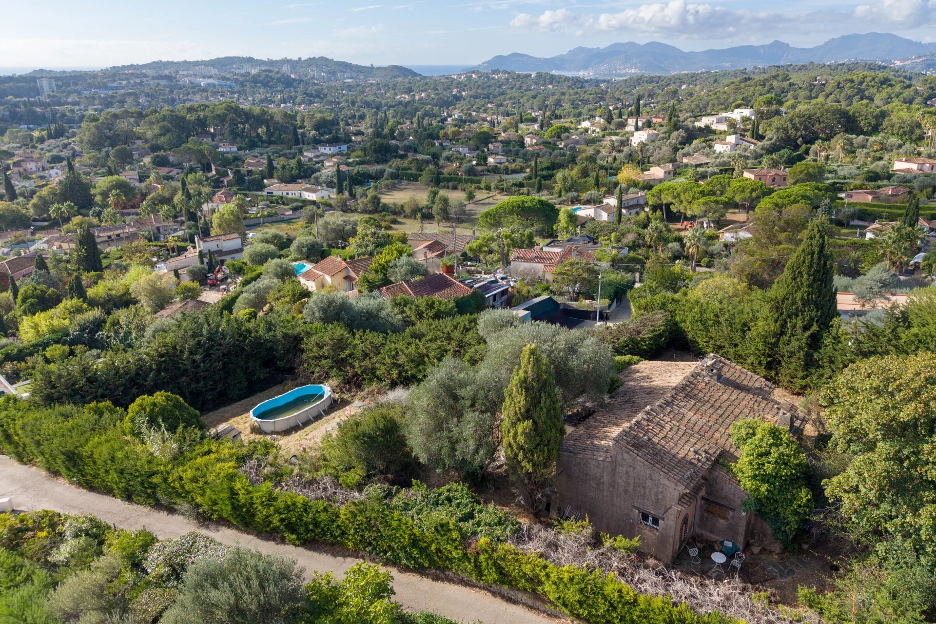 Located in a residential area, this property offers approximately 2,000 m² of land in an elevated position, enjoying panoramic views of the surrounding hills all the way to the bay of Théoule.