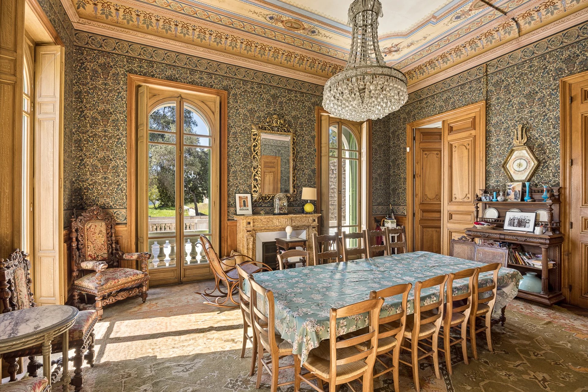The ground floor features superb reception rooms — living room, dining room, smoking room — with décor inspired by grand Italian villas. A central staircase leads to the upper floors, comprising numerous bedrooms, dressing rooms and bathrooms.