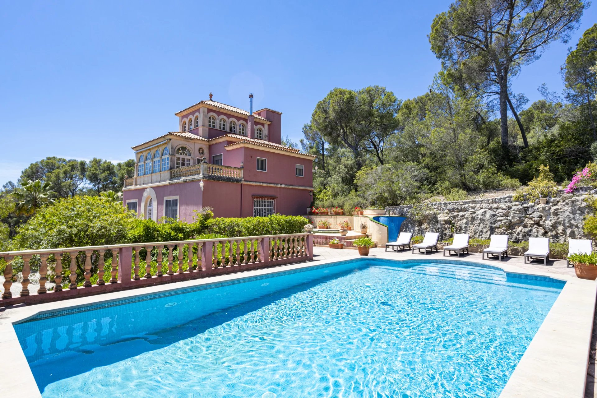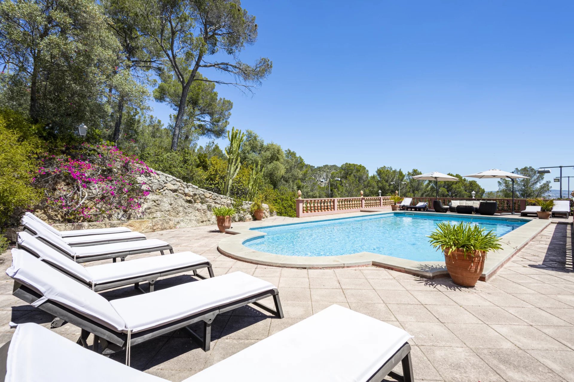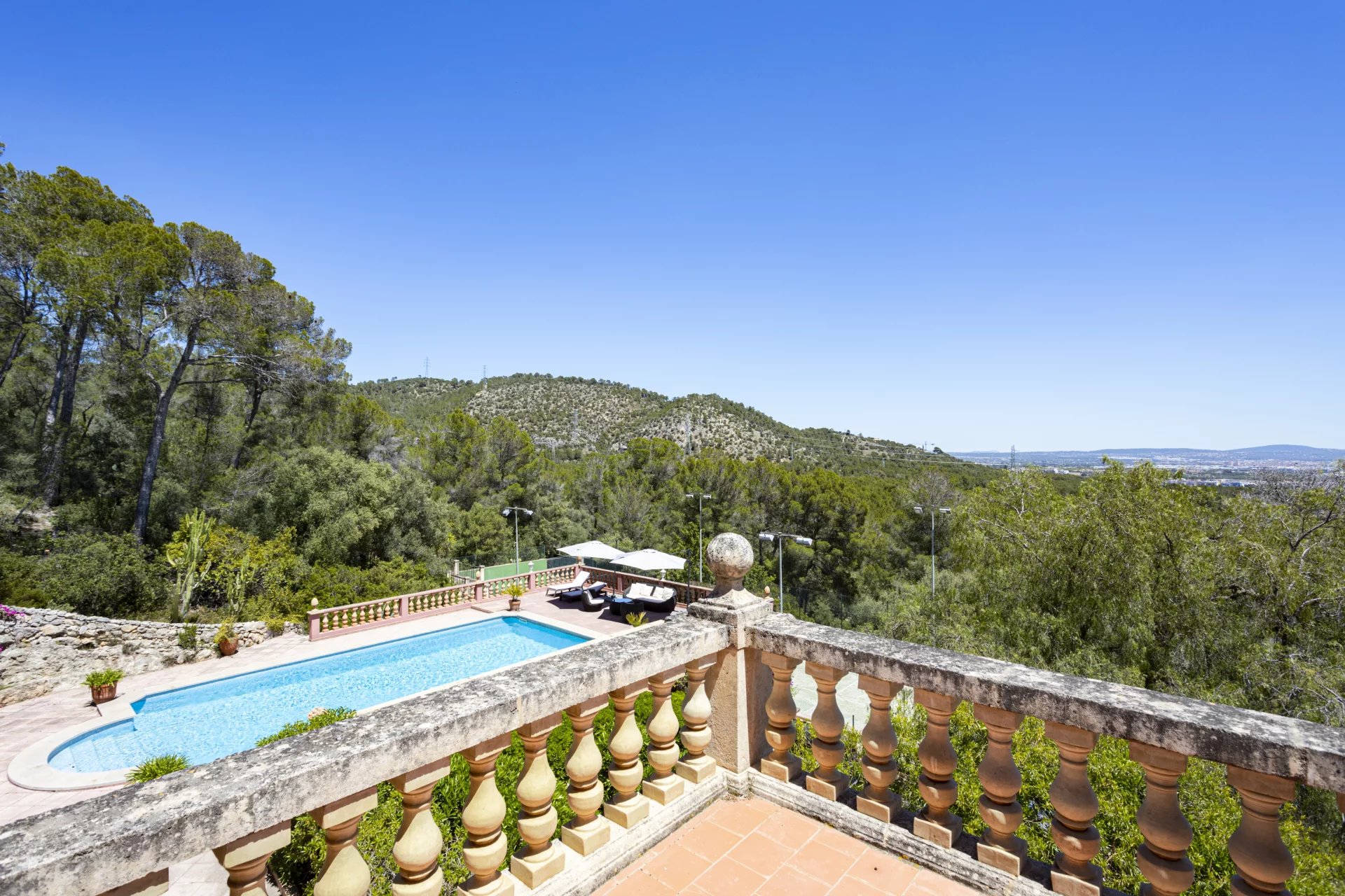 This beautiful holiday Villa is located near Son Vida. The Villa is just right for sports friends. The golf course is located within walking distance, adventurous hikes through the mountains can be started directly from the Villa and the private tennis court also offers another sporty challenge. The net living area of approx. 500 m2 is distributed over 4 floors, connected by an elevator, and houses 4 bedrooms. Ground floor: small guest apartment with kitchen, bedroom, and bathroom, entertainment room, laundry room, engine room, wine cellar. First floor: kitchen, dining room, living room, guest bathroom, 1 bedroom with bathroom en-suite, direct access to the covered terrace and barbecue area. Second floor: bedroom with bathroom en-suite and dressing, 2 bedrooms sharing a bathroom, small living area with beautiful views. Third floor: gallery with beautiful views. License number for vacation rental: L12E 9624.