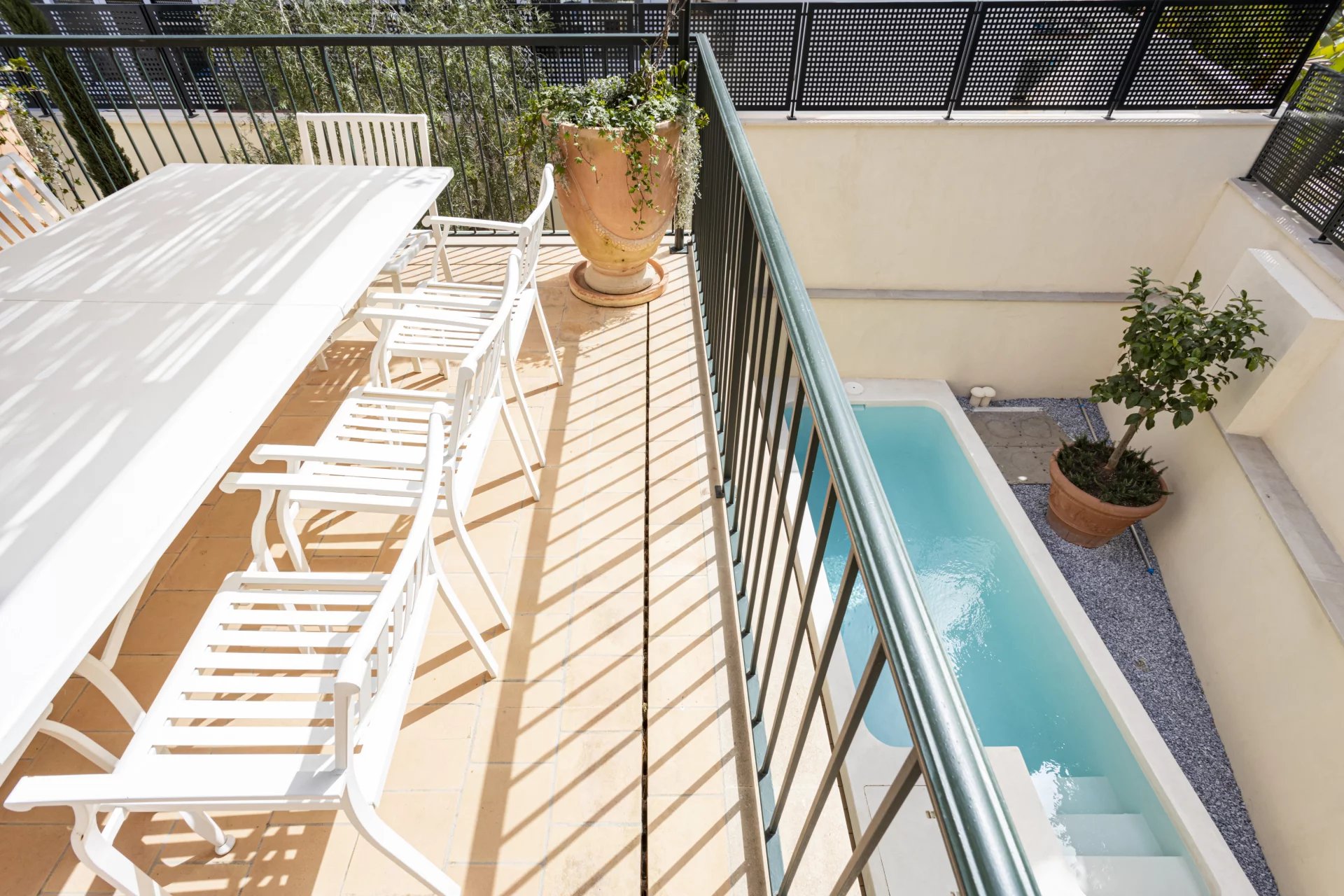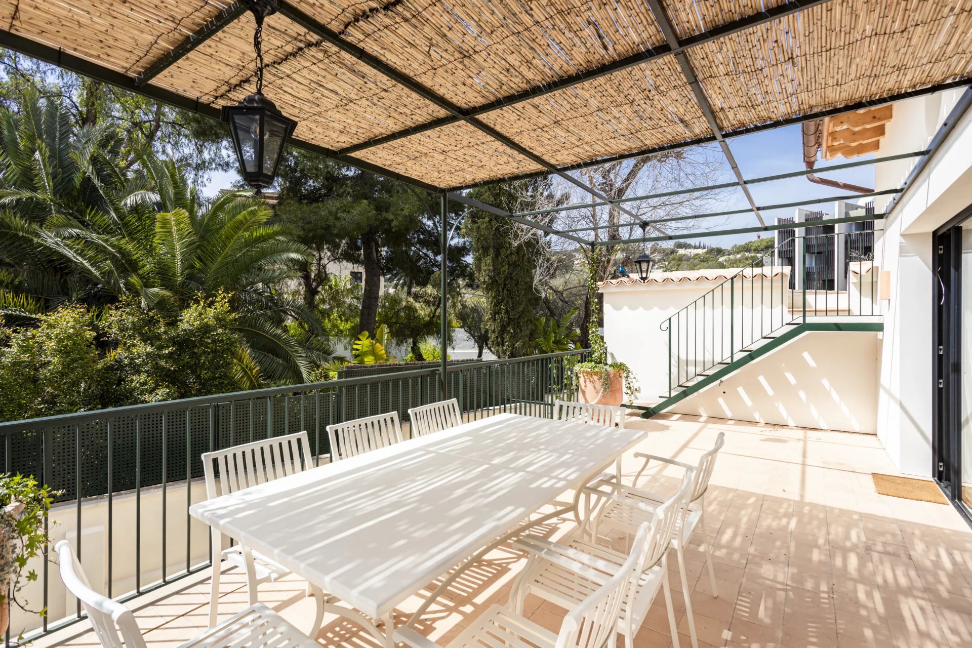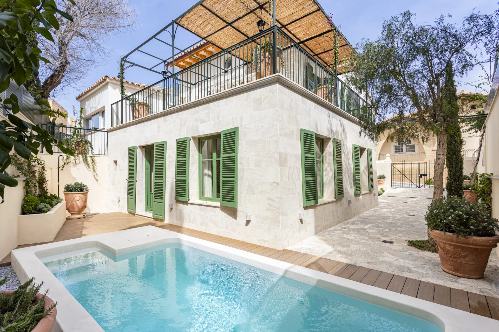 This spectacular house in San Agustín, Palma de Mallorca, has been completely refurbished to the highest quality standards. Situated next to the Hotel Maricel, one of the most exclusive locations in the city, this property offers a perfect combination of luxury, comfort, and advanced technology. With 297 m² of completely renovated living space, the house has 2 double bedrooms and 1 single bedroom, all with luxury finishes. In addition, it has two spacious and bright living rooms designed for comfort and elegance, one of them with an integrated open-plan kitchen. The large 54 m² garage can be used as such or as a gym, spa, cinema room, or any additional space according to your needs, and it has an additional driveway and private parking. The property also boasts two outdoor terraces and a roof terrace, the latter with partial sea views, as well as a beautiful micro-cement saline pool on the ground floor, offering a private oasis. The house has been designed using high-end natural materials such as larch and iroko wood, Perlino marble, and stone from Santanyi and Binissalem. The tiling in the bathrooms, hand-painted in Italy, together with the use of micro-cement, adds a touch of sophistication and style. In terms of comfort and technology, the property has underfloor heating and ducted air conditioning to ensure a perfect temperature at any time of the year. Energy efficiency is optimised with heat pump DHW, water softener, and its own pressure boosting system. In addition, the property includes an advanced home automation system for lighting and air conditioning, as well as pre-installation for an alarm, electric charger, and automatic irrigation to keep the garden perfectly maintained.