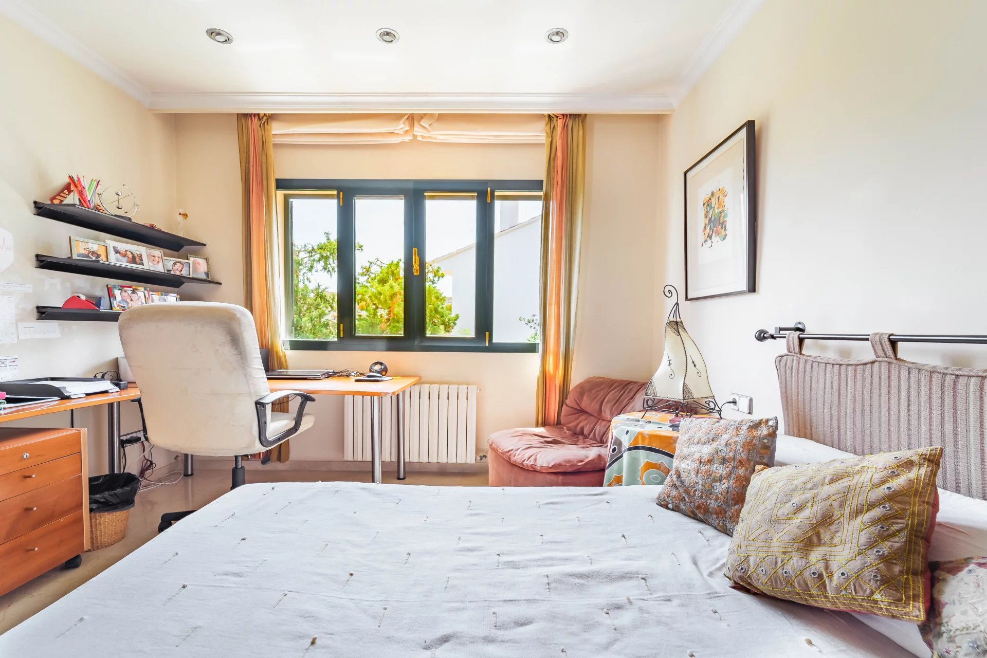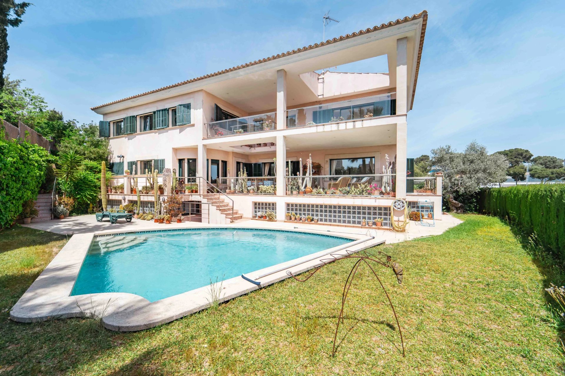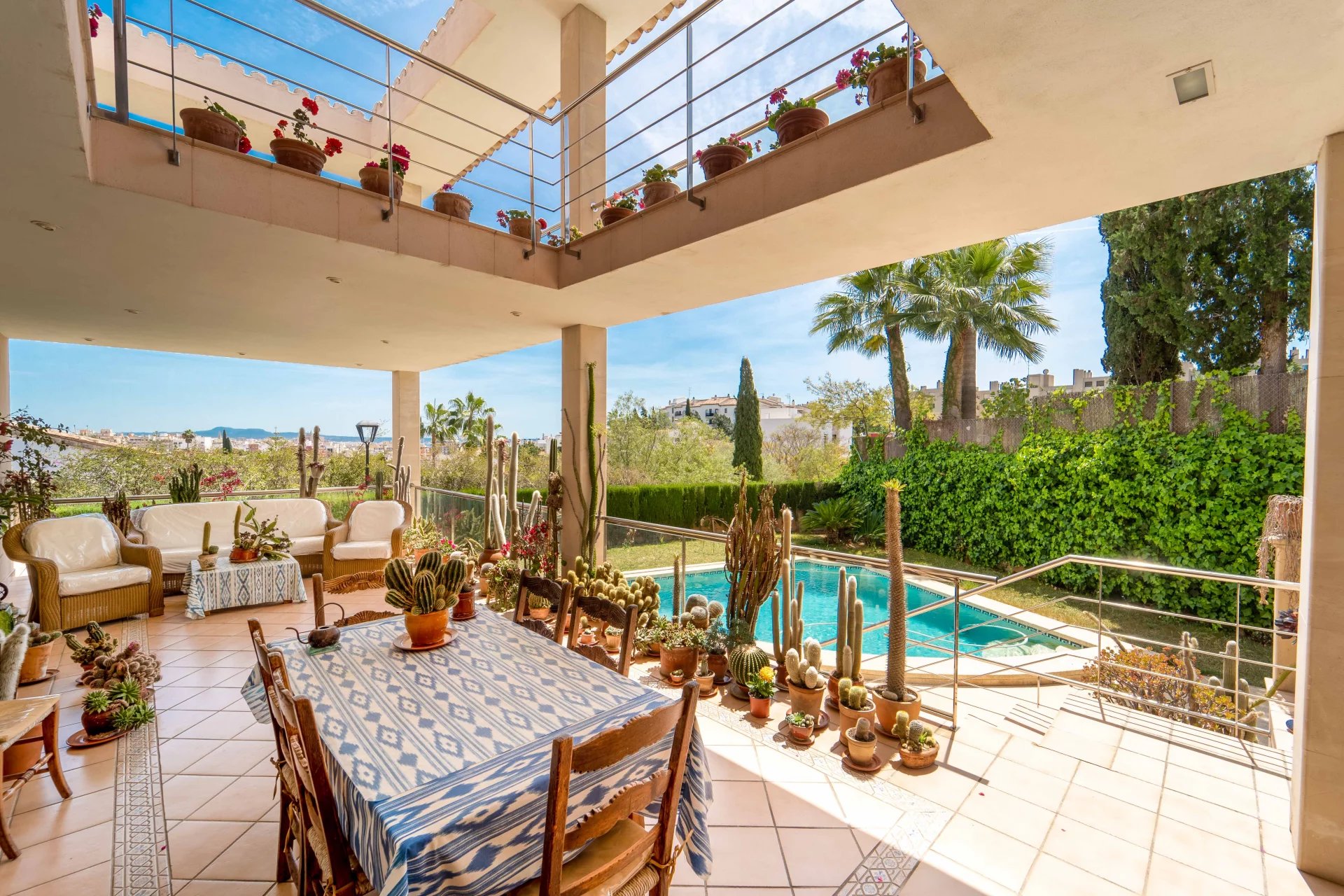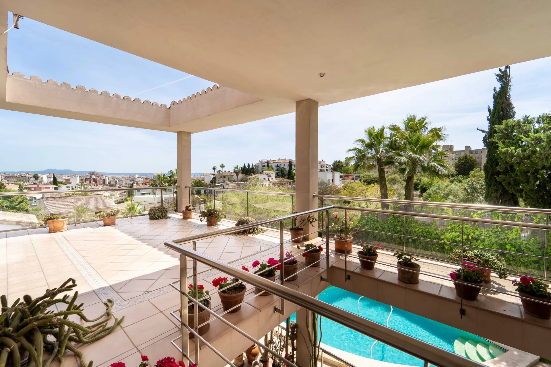 The property enjoys a quiet location in one of the most attractive residential areas of Palma, Son Dureta. Just minutes away from some of the best schools in Mallorca and the center of Palma, the property offers ample space for the whole family and beautiful panoramic views over the city and the Cathedral. Built in 2000 by the current owners, the villa is distributed over 3 floors, on the main floor we find the living-dining room and the kitchen, both with direct access to a large terrace, from where you can access the pool and the garden. The second floor has 4 bedrooms, 3 bathrooms and a second large terrace with access from the master suite. And in the very bright and ample basement there is a garage for 4 cars and a separate extra space ideal for an office, gym or even a guest area, as this floor also has a full bathroom.