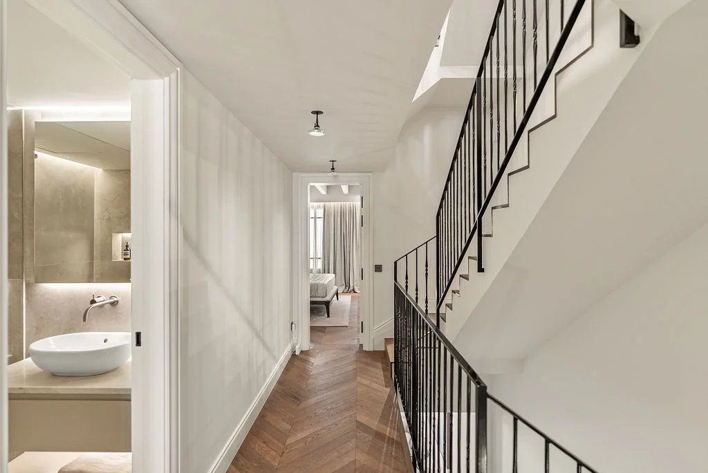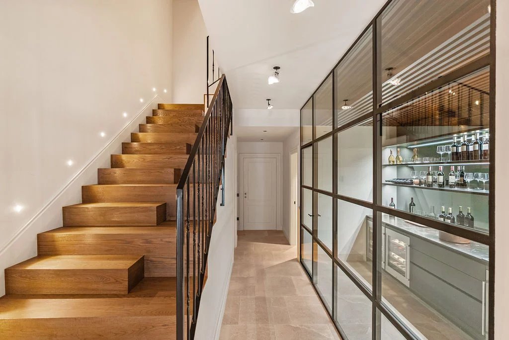 The ground floor welcomes with a welcoming lobby, a representative fireplace, high wooden ceilings, and unique stairs. Also on this floor is a magnificent wine bar, laundry room, and garage parking with plenty of room for cars and bicycles.