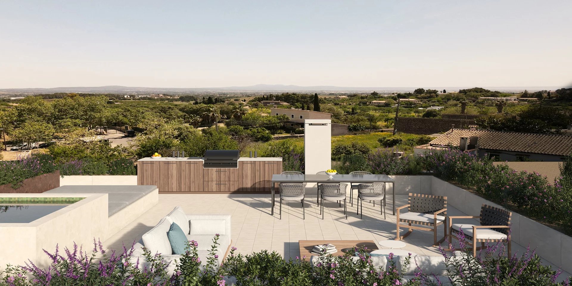 In one of the most sought-after areas of the island, Establiments, due to its proximity to Palma, its natural surroundings, its tranquillity, its connectivity, and services, you find the plot where this beautiful house will be built. This new project will be carried out by local developers who have a great deal of experience and proven success in previous projects. On this occasion, we are talking about a detached house located on a plot with a private garden and swimming pool. The outdoor space is completed with a large roof terrace with unbeatable views of the countryside and even the sea. The house has 3 bedrooms, 3 bathrooms, a guest toilet, a laundry room, and parking for 2 vehicles, as well as an open plan kitchen, living and dining area. Its large interior and exterior spaces are ideal both for daily enjoyment and for sharing with family and/or friends. All this using the best qualities in materials and installations, electrical appliances, sanitary ware, etc. It has underfloor heating and ducted air conditioning in all rooms. The property is expected to completed by Q4 2025.