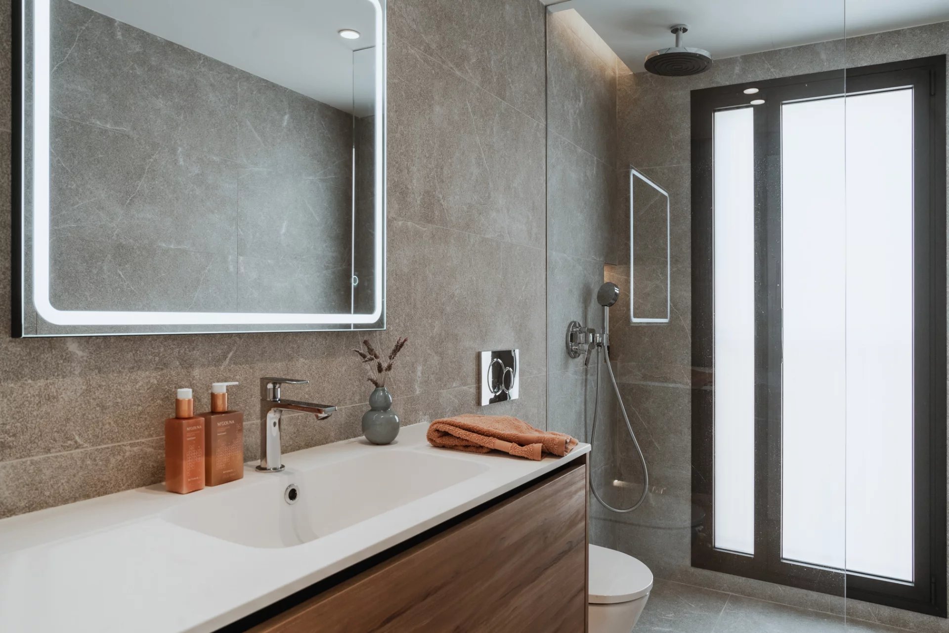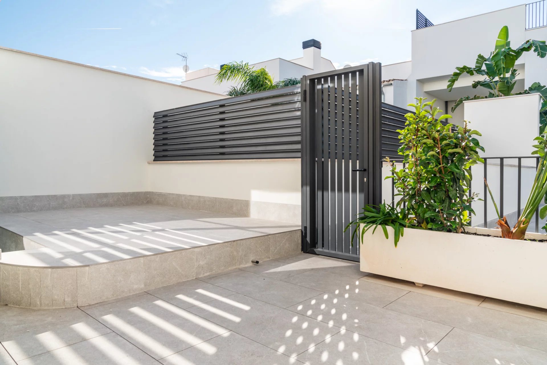 Upstairs, two large bedrooms share a beautifully appointed bathroom, while the master suite features an en-suite bathroom and a private terrace with breathtaking views. A rooftop terrace of 44 m² offers additional space for entertaining, sunbathing, or creating your dream outdoor kitchen.