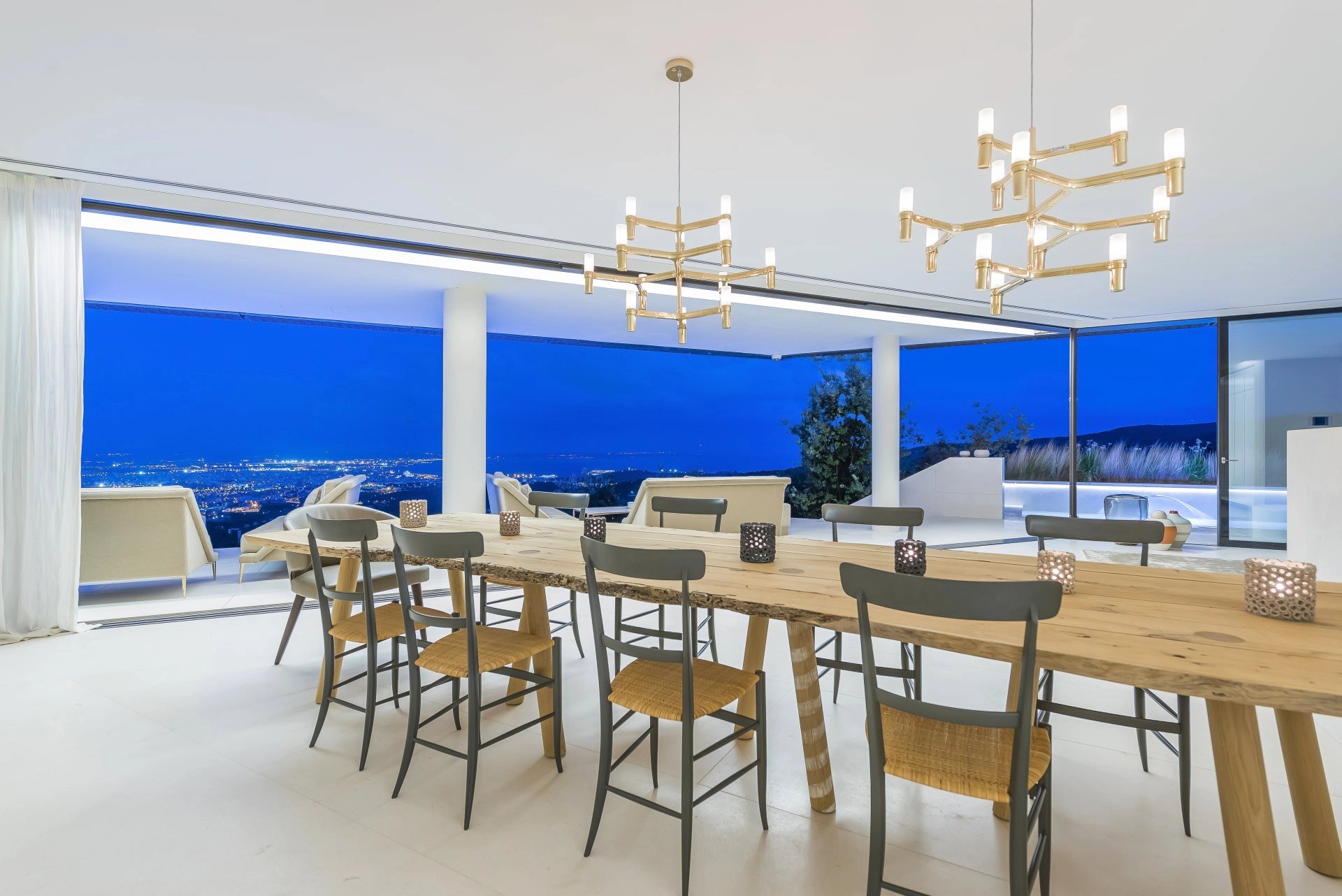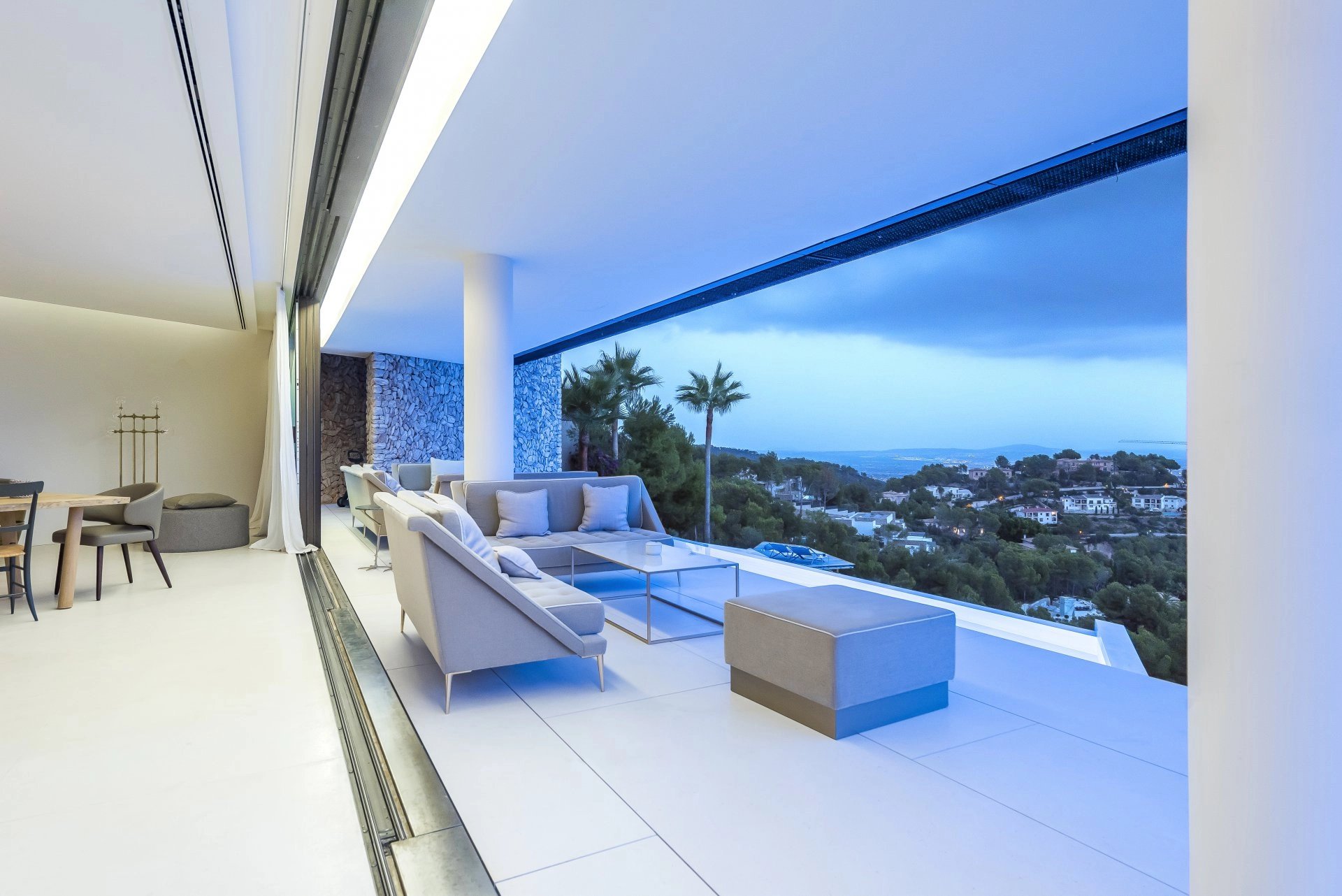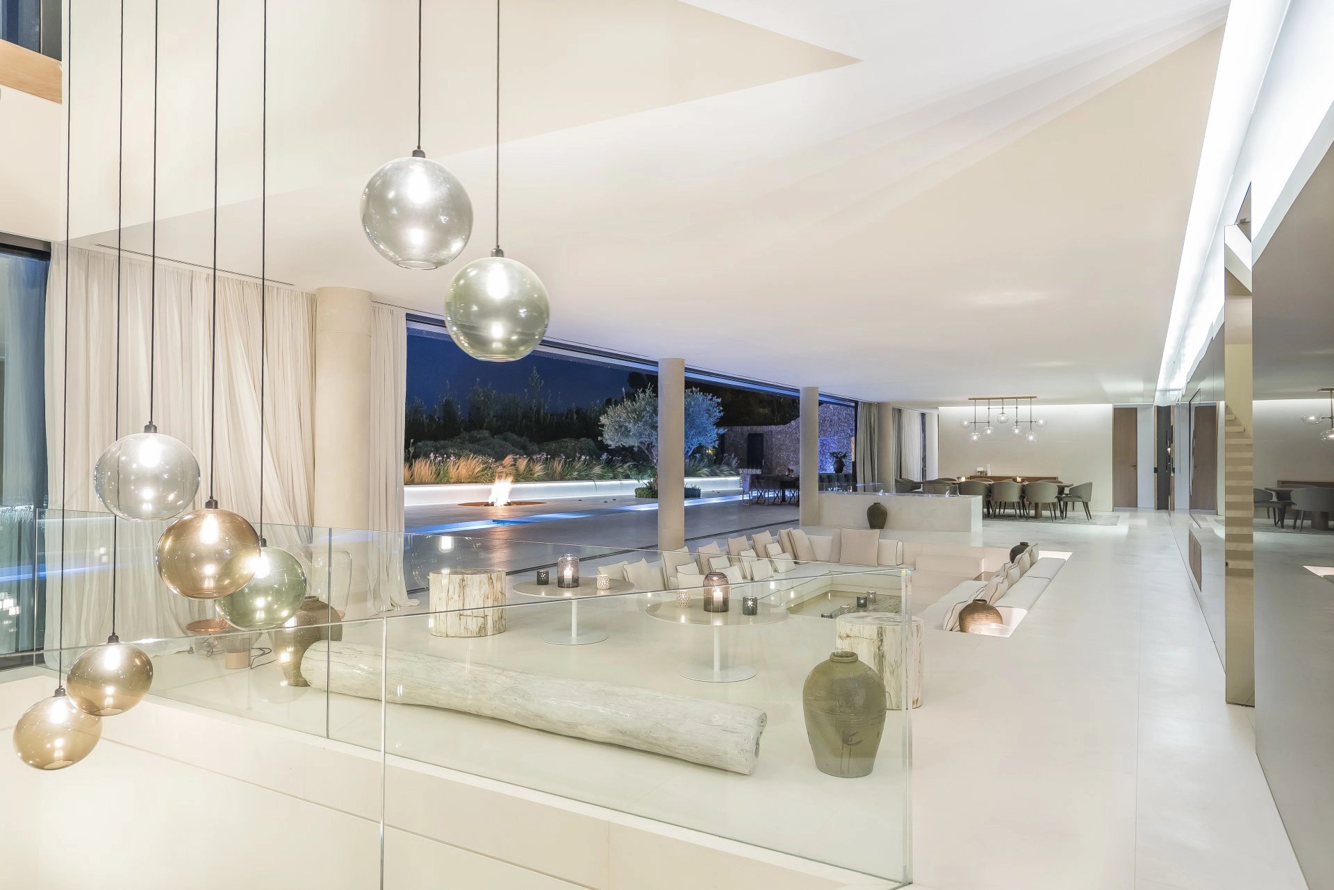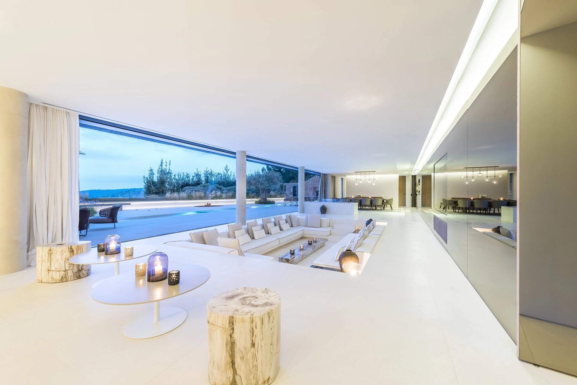 A transparent glass façade on the ground floor means the huge living room opens out and extends into the garden doubling the living space in summer. The infinity terrace is surrounded by the natural landscape and invites you to experience an unforgettable sunset. The desire to bring the Mediterranean landscape into the building improves the connection between the interior and the garden. Outdoor seating areas become a continuation of the living room.