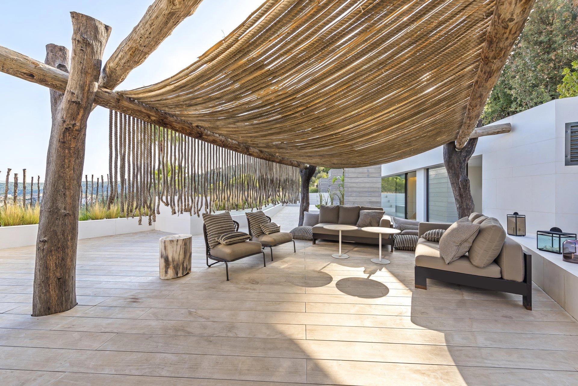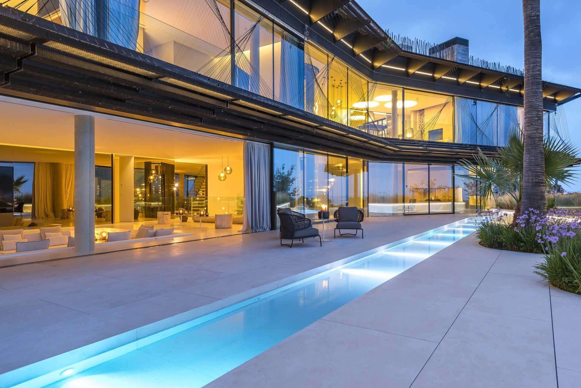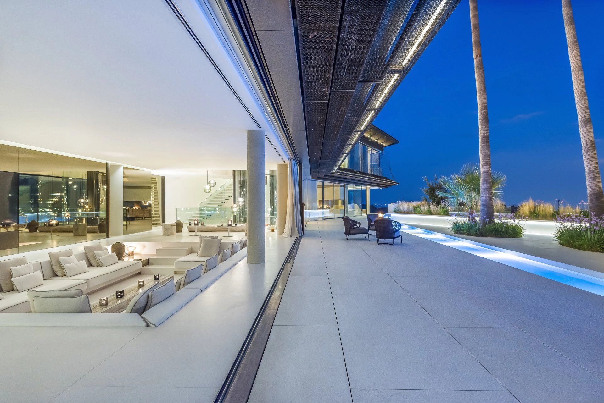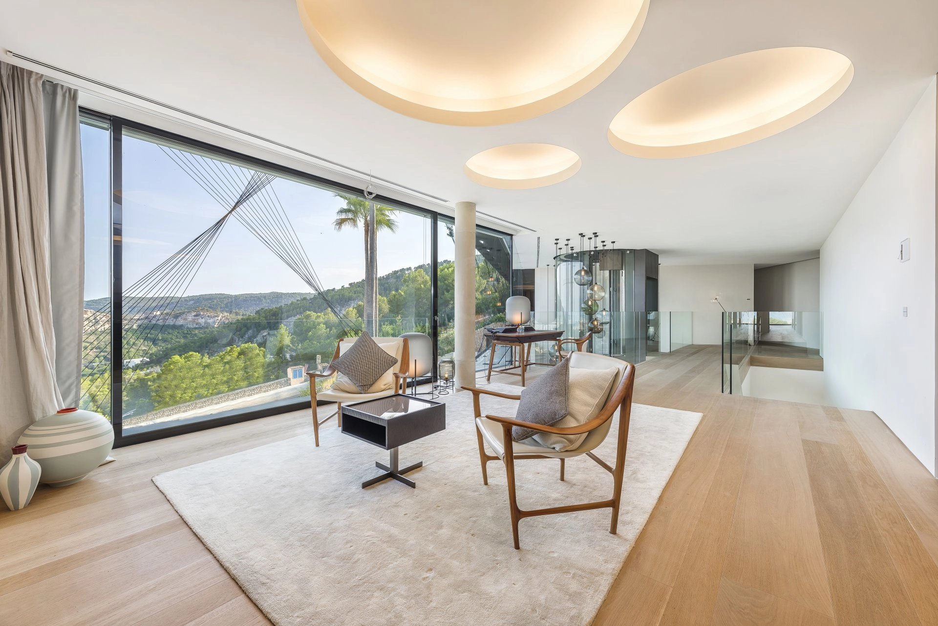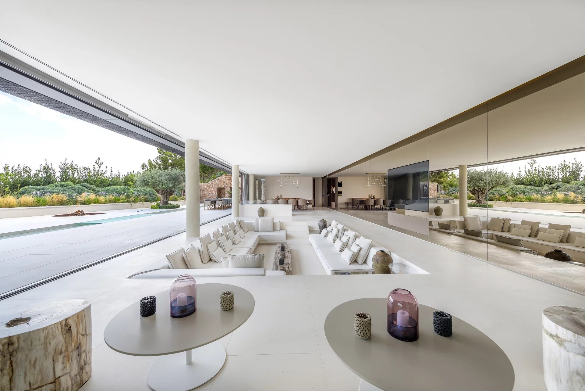A transparent glass façade on the ground floor means the huge living room opens out and extends into the garden doubling the living space in summer. The infinity terrace is surrounded by the natural landscape and invites you to experience an unforgettable sunset. The desire to bring the Mediterranean landscape into the building improves the connection between the interior and the garden. Outdoor seating areas become a continuation of the living room.