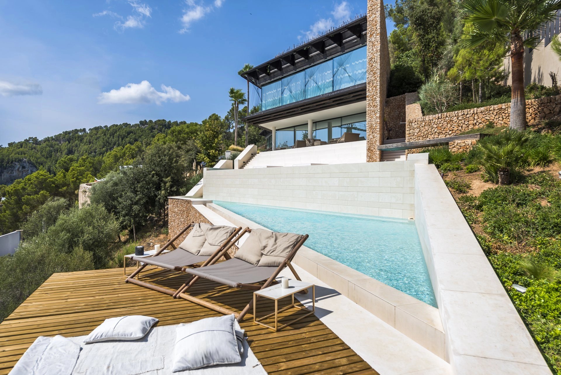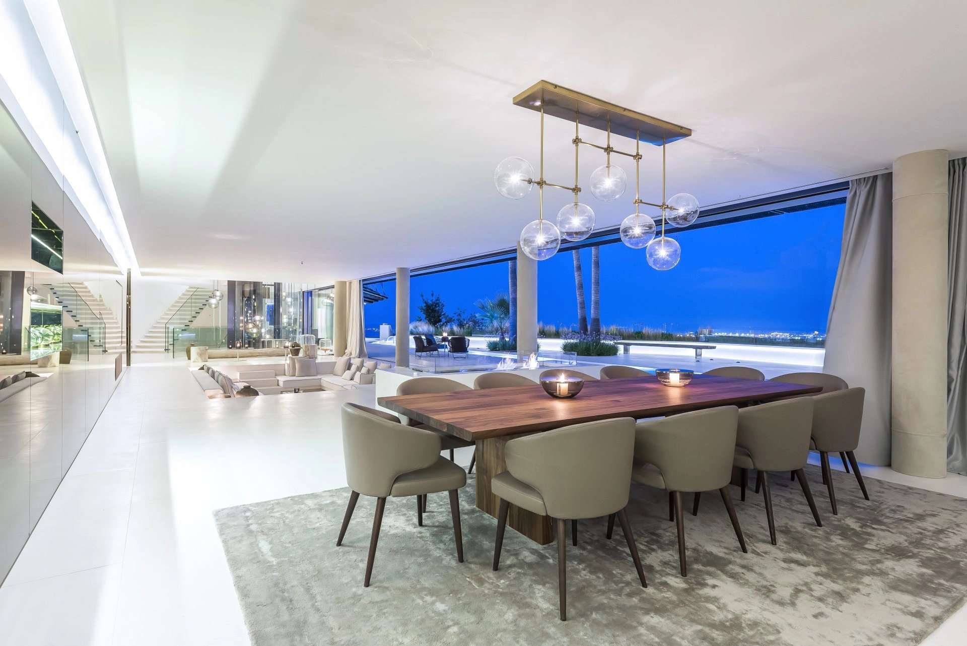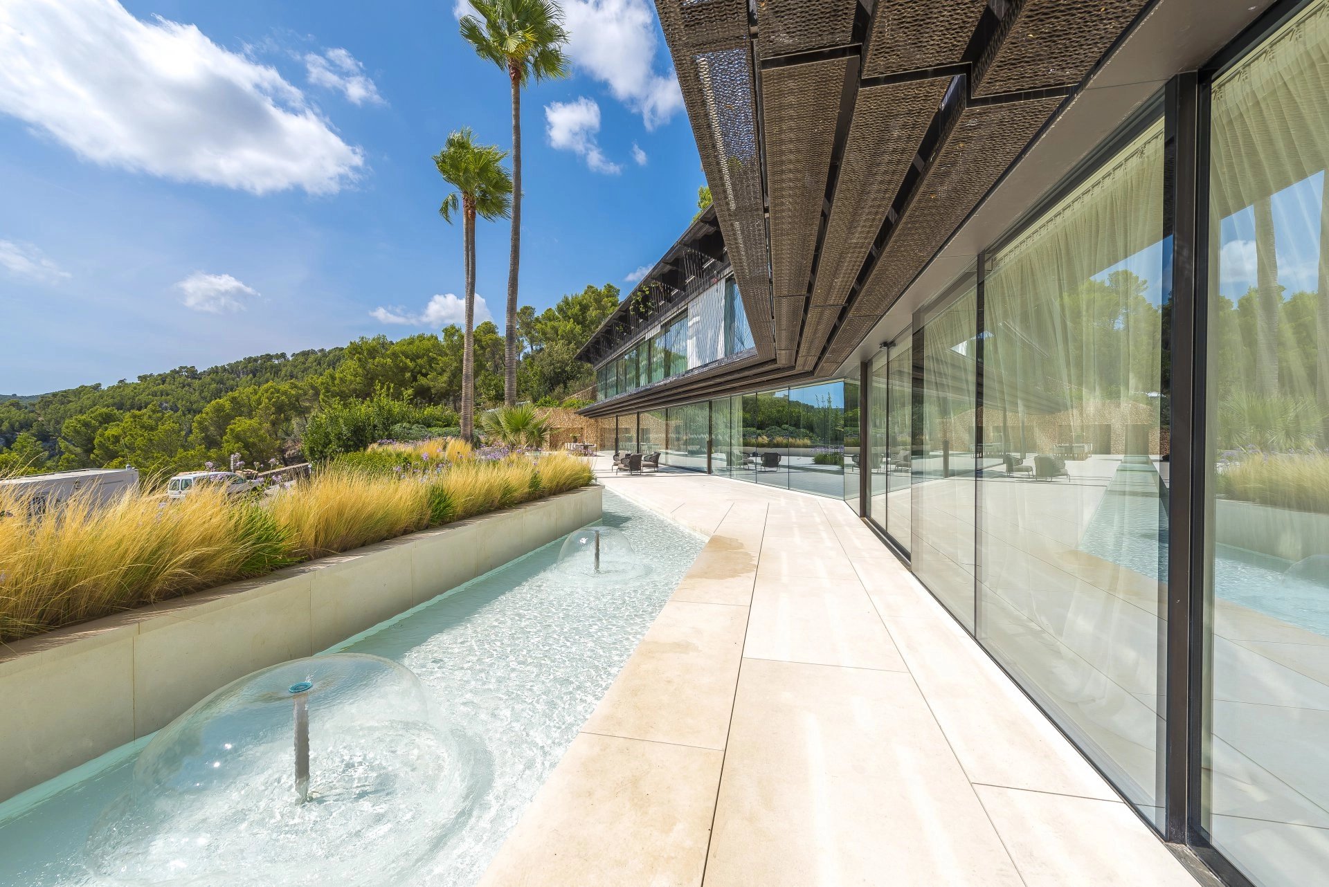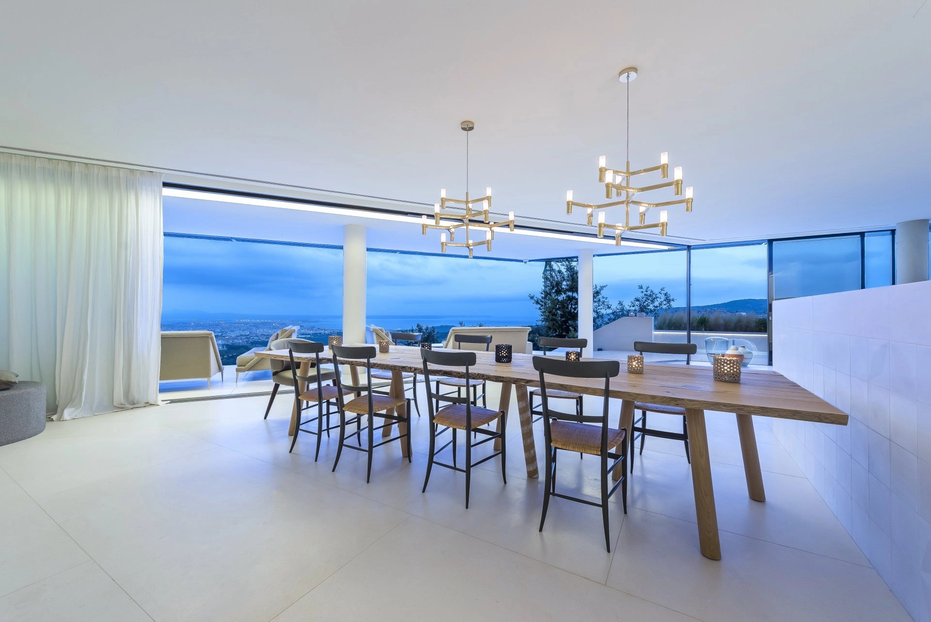 A transparent glass façade on the ground floor means the huge living room opens out and extends into the garden doubling the living space in summer. The infinity terrace is surrounded by the natural landscape and invites you to experience an unforgettable sunset. The desire to bring the Mediterranean landscape into the building improves the connection between the interior and the garden. Outdoor seating areas become a continuation of the living room.