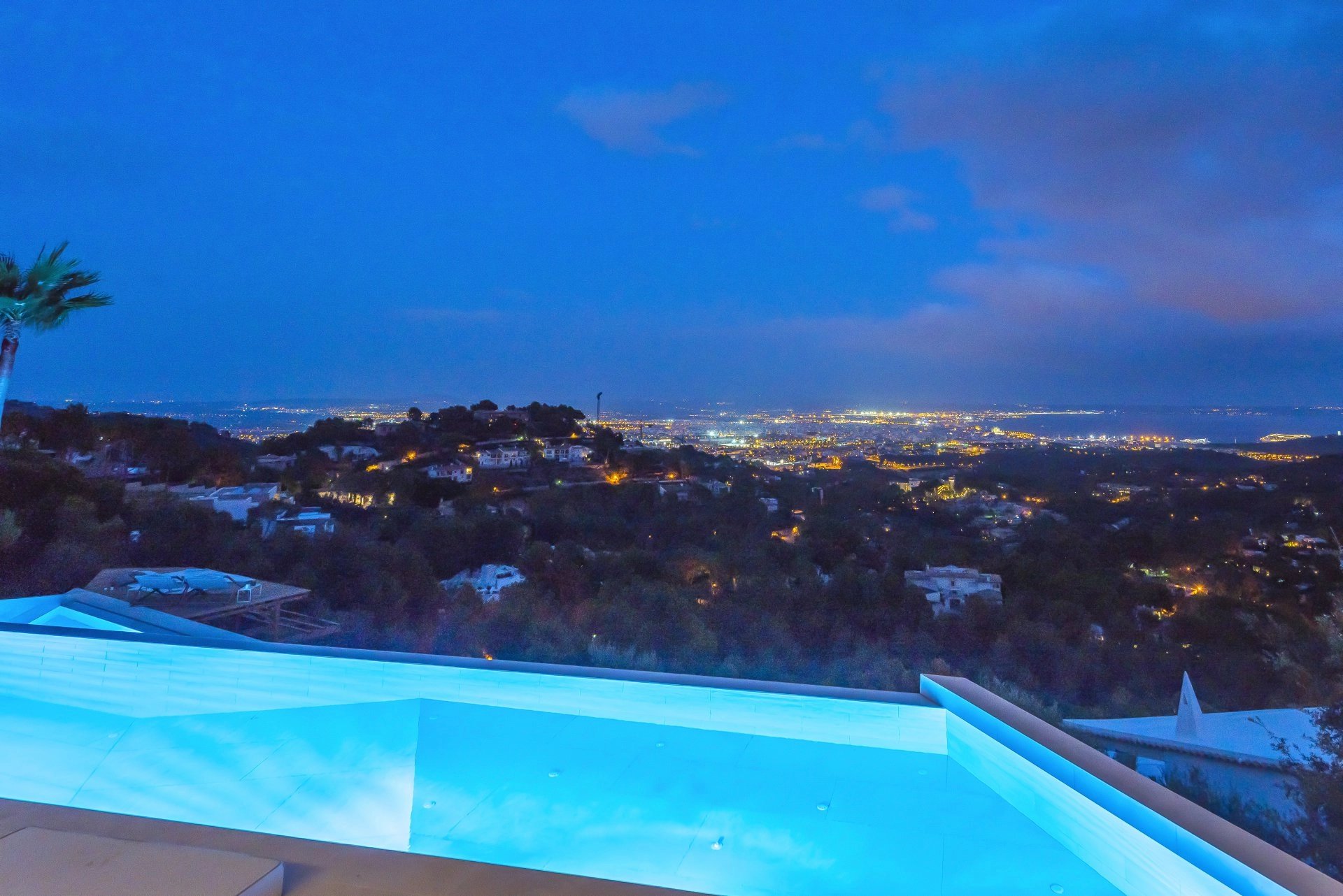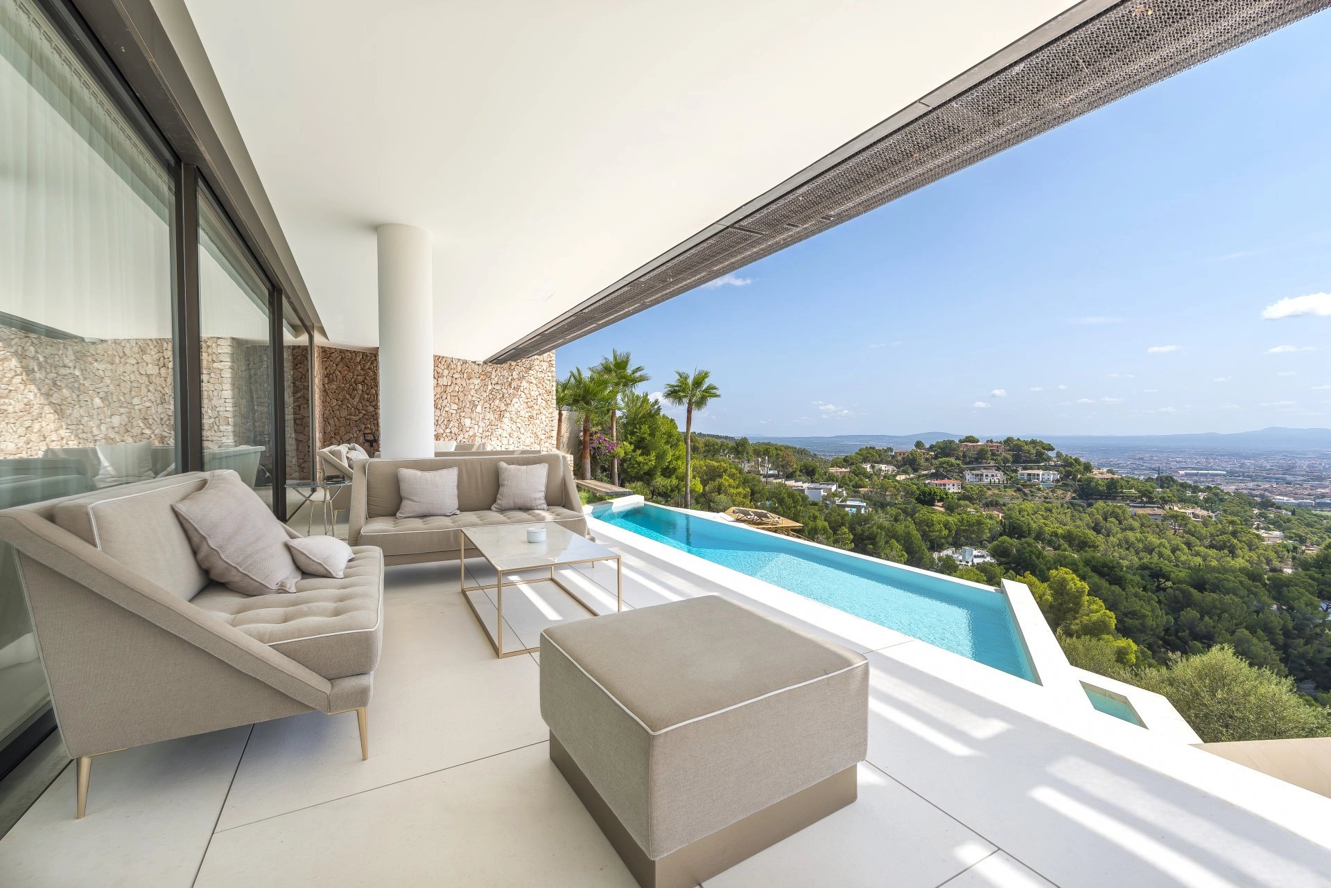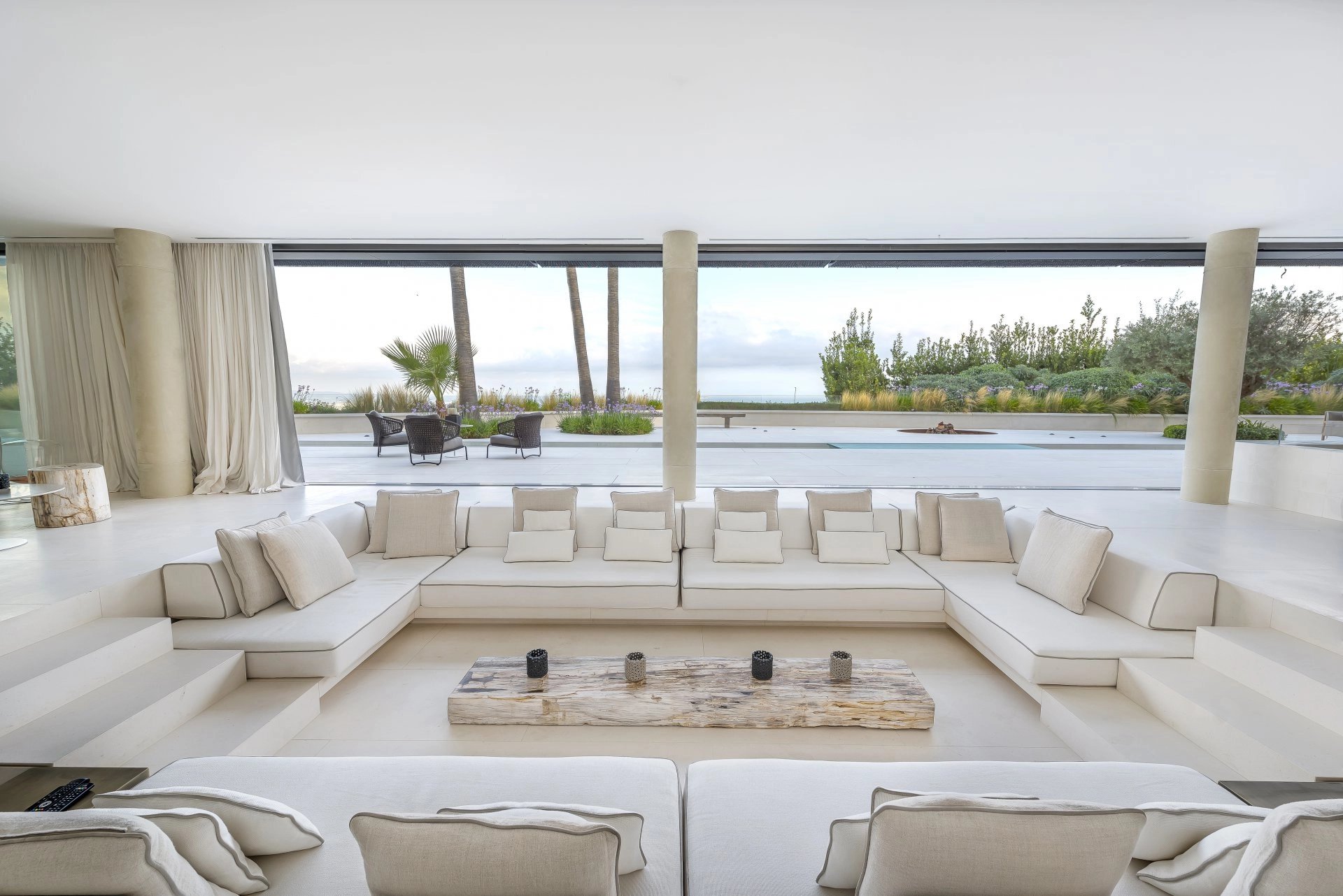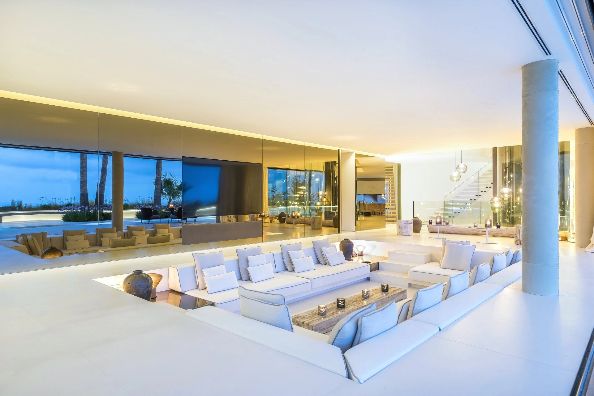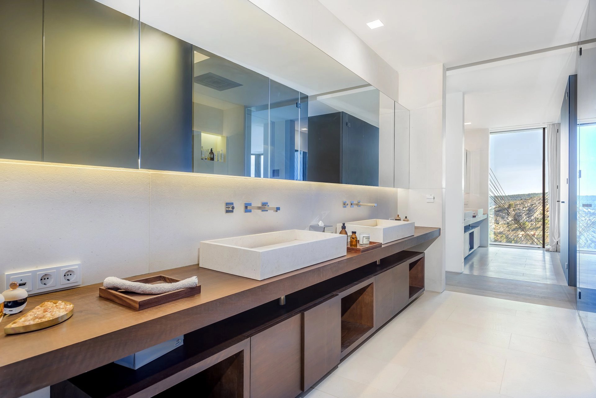 A transparent glass façade on the ground floor means the huge living room opens out and extends into the garden doubling the living space in summer. The infinity terrace is surrounded by the natural landscape and invites you to experience an unforgettable sunset. The desire to bring the Mediterranean landscape into the building improves the connection between the interior and the garden. Outdoor seating areas become a continuation of the living room.