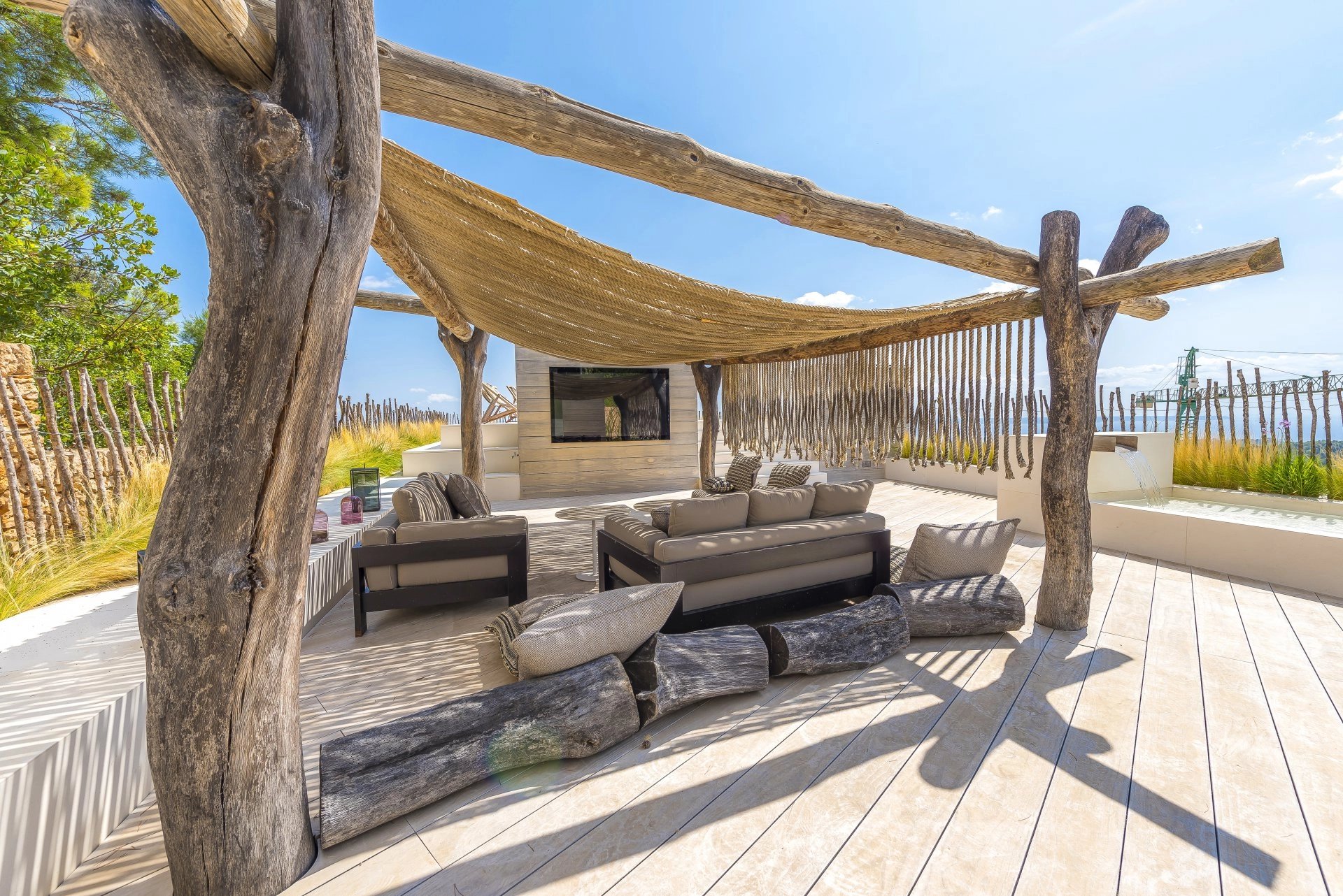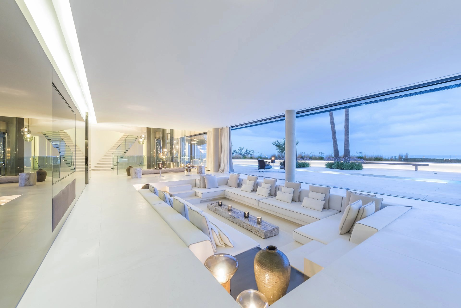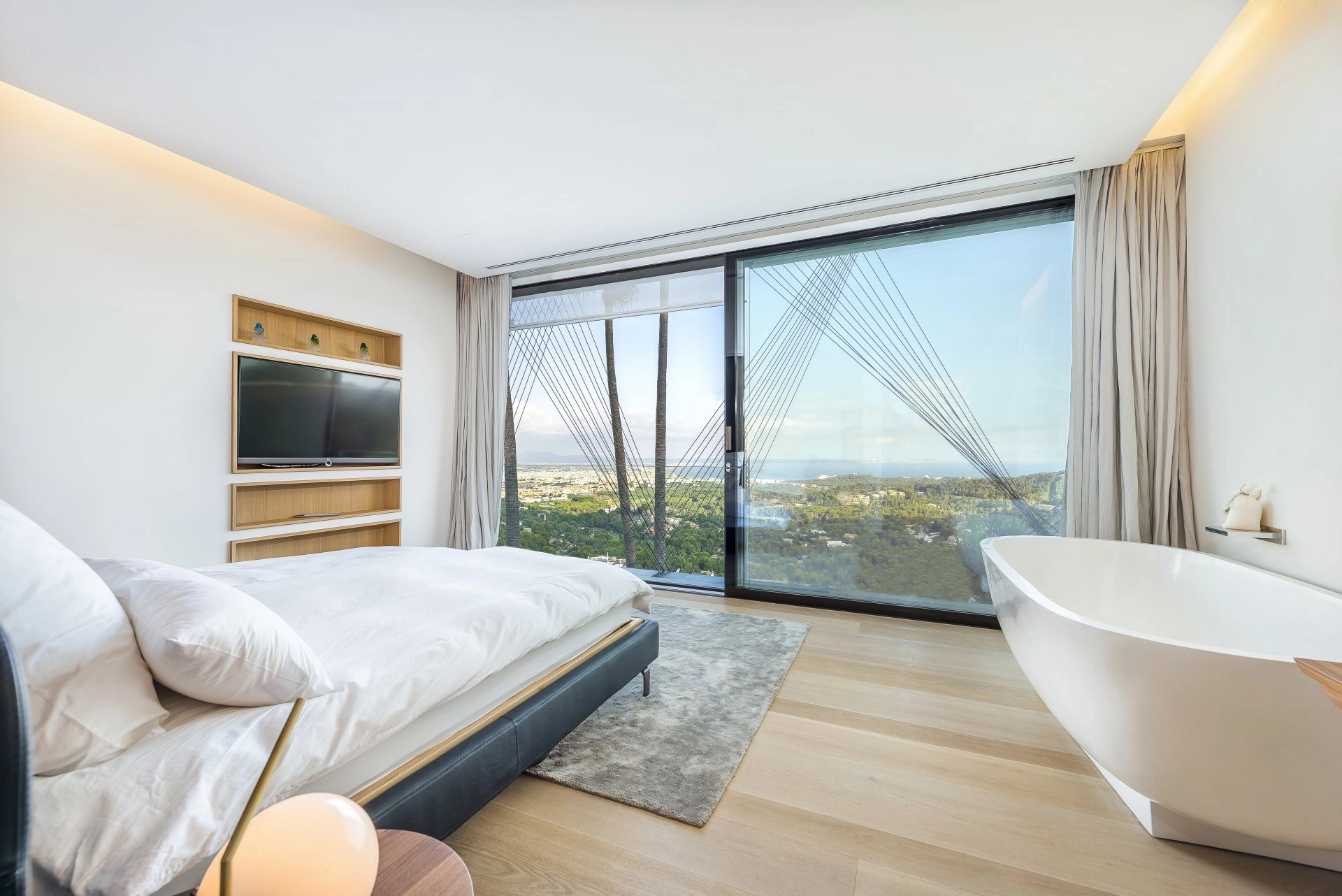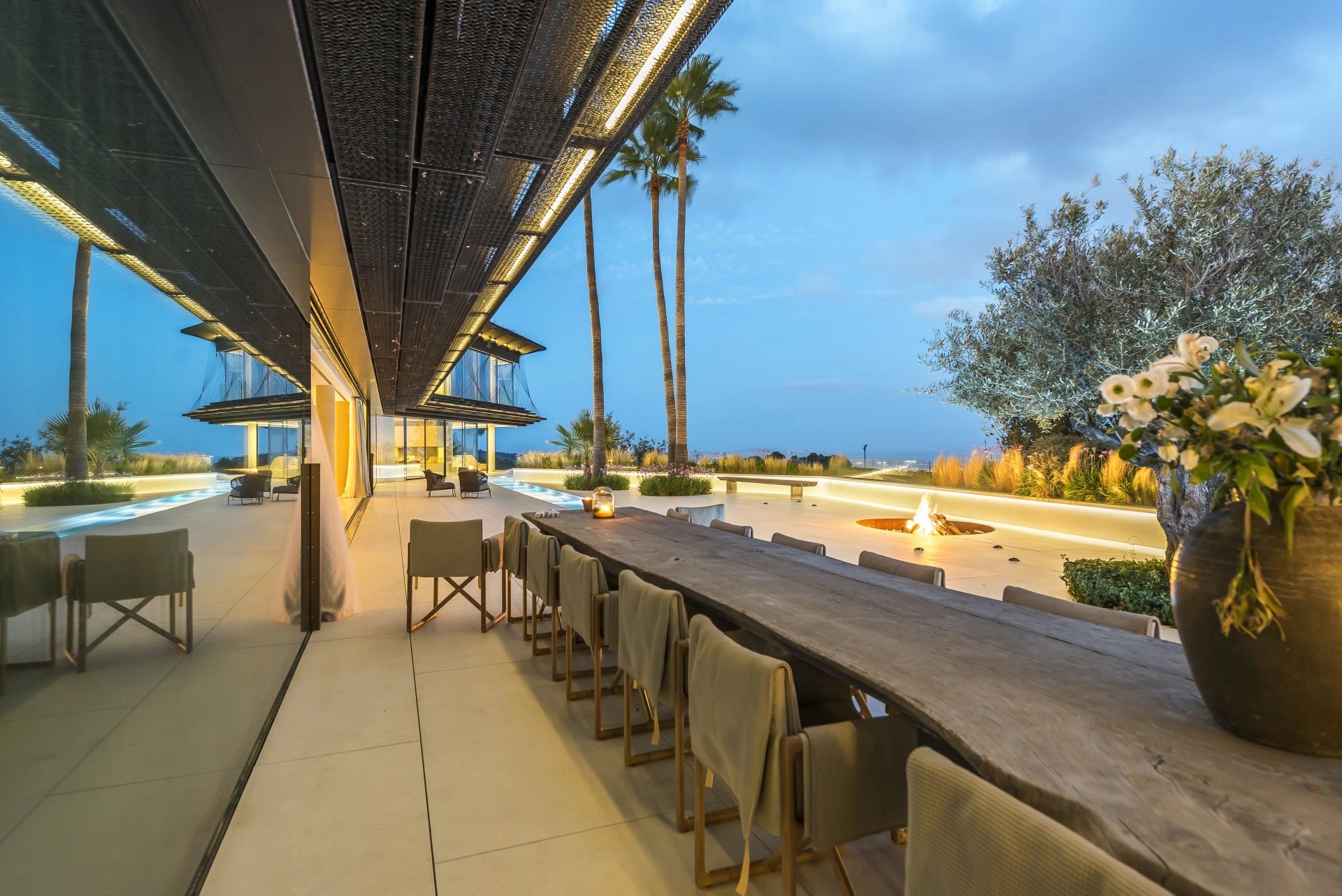 A transparent glass façade on the ground floor means the huge living room opens out and extends into the garden doubling the living space in summer. The infinity terrace is surrounded by the natural landscape and invites you to experience an unforgettable sunset. The desire to bring the Mediterranean landscape into the building improves the connection between the interior and the garden. Outdoor seating areas become a continuation of the living room.