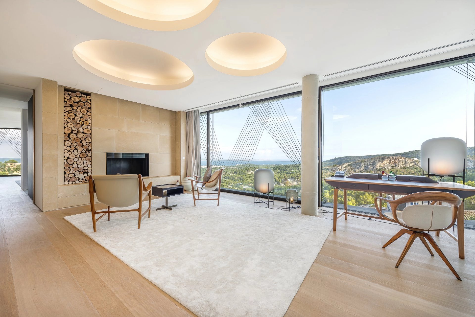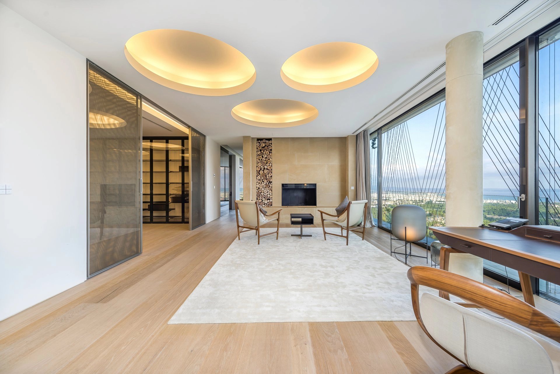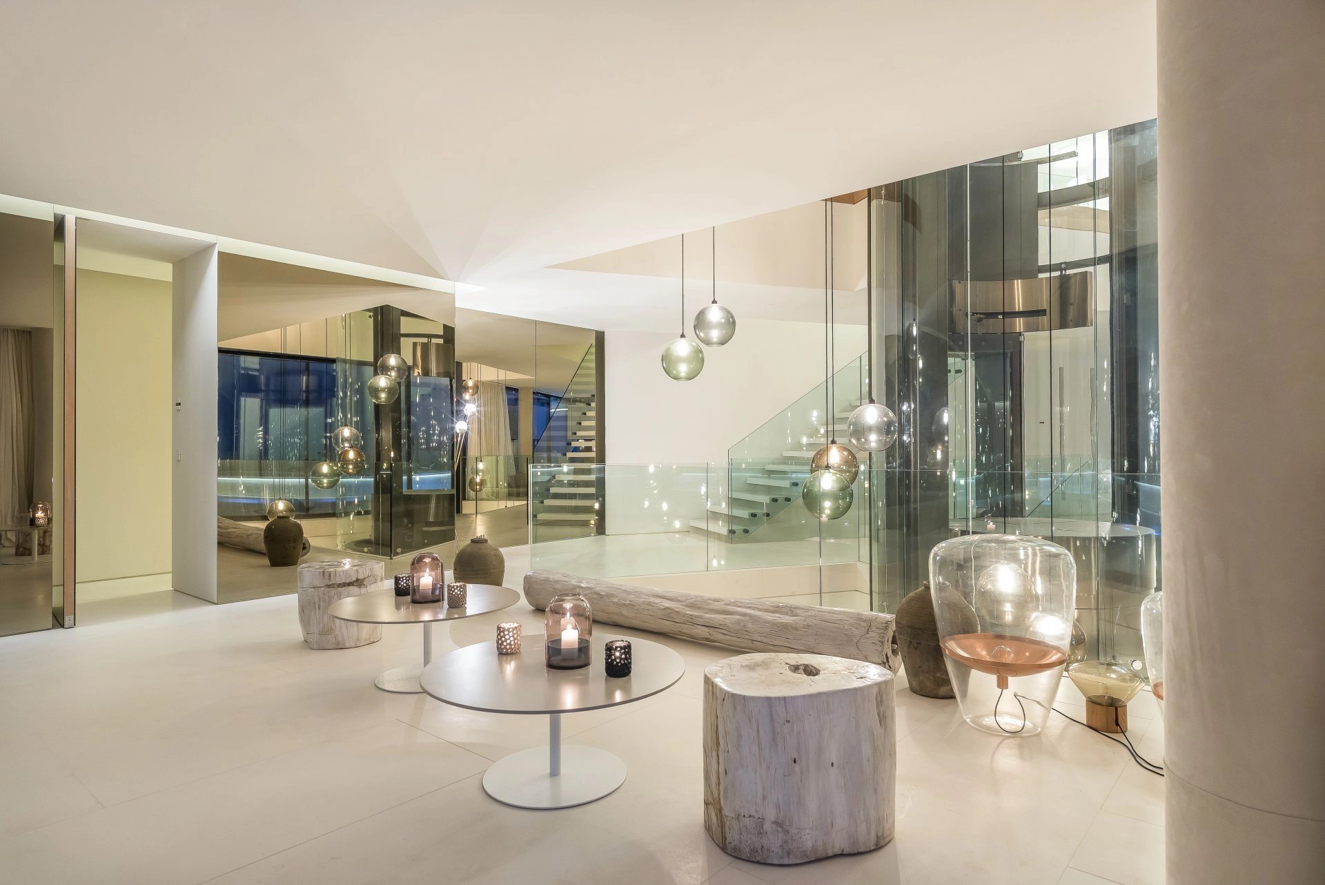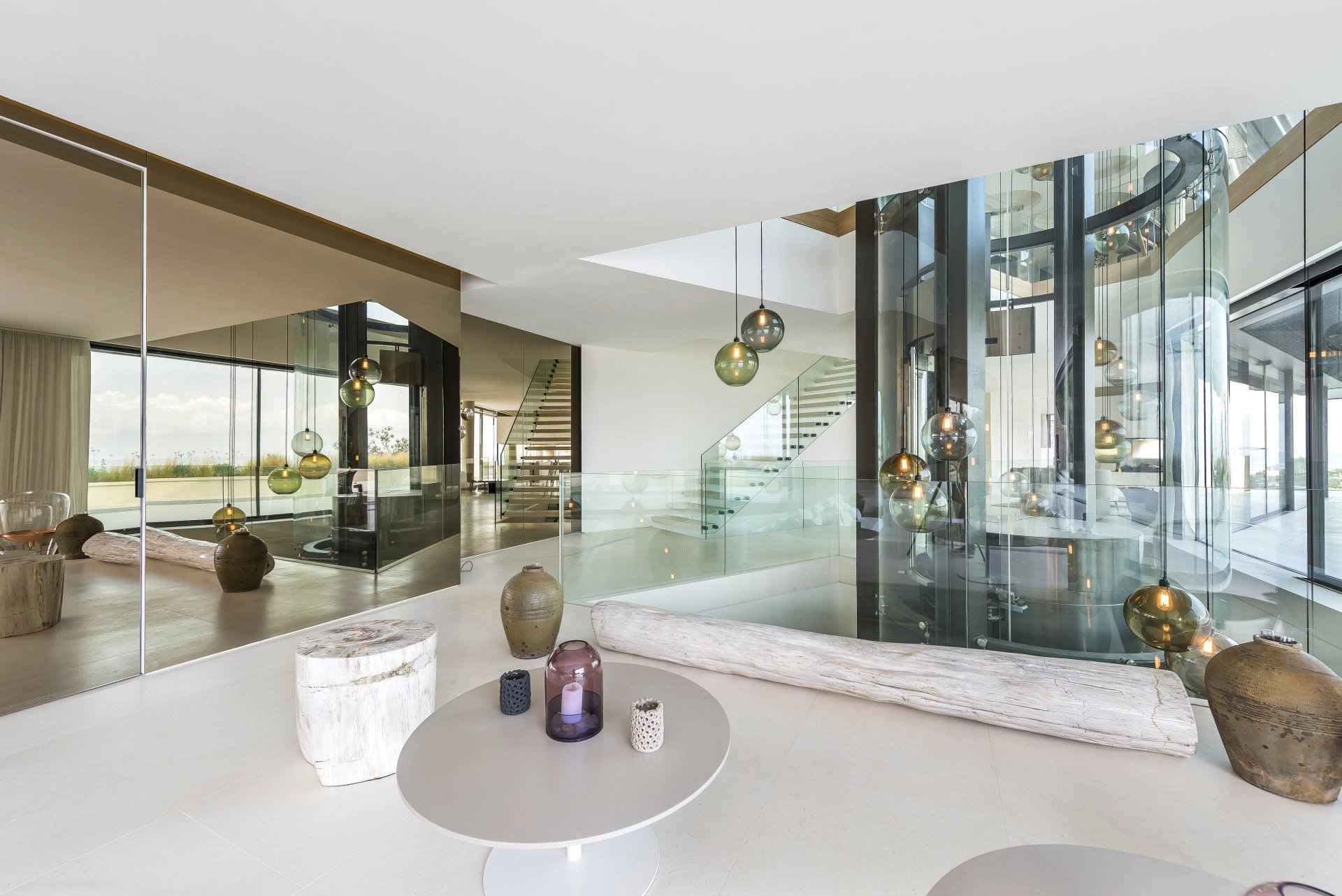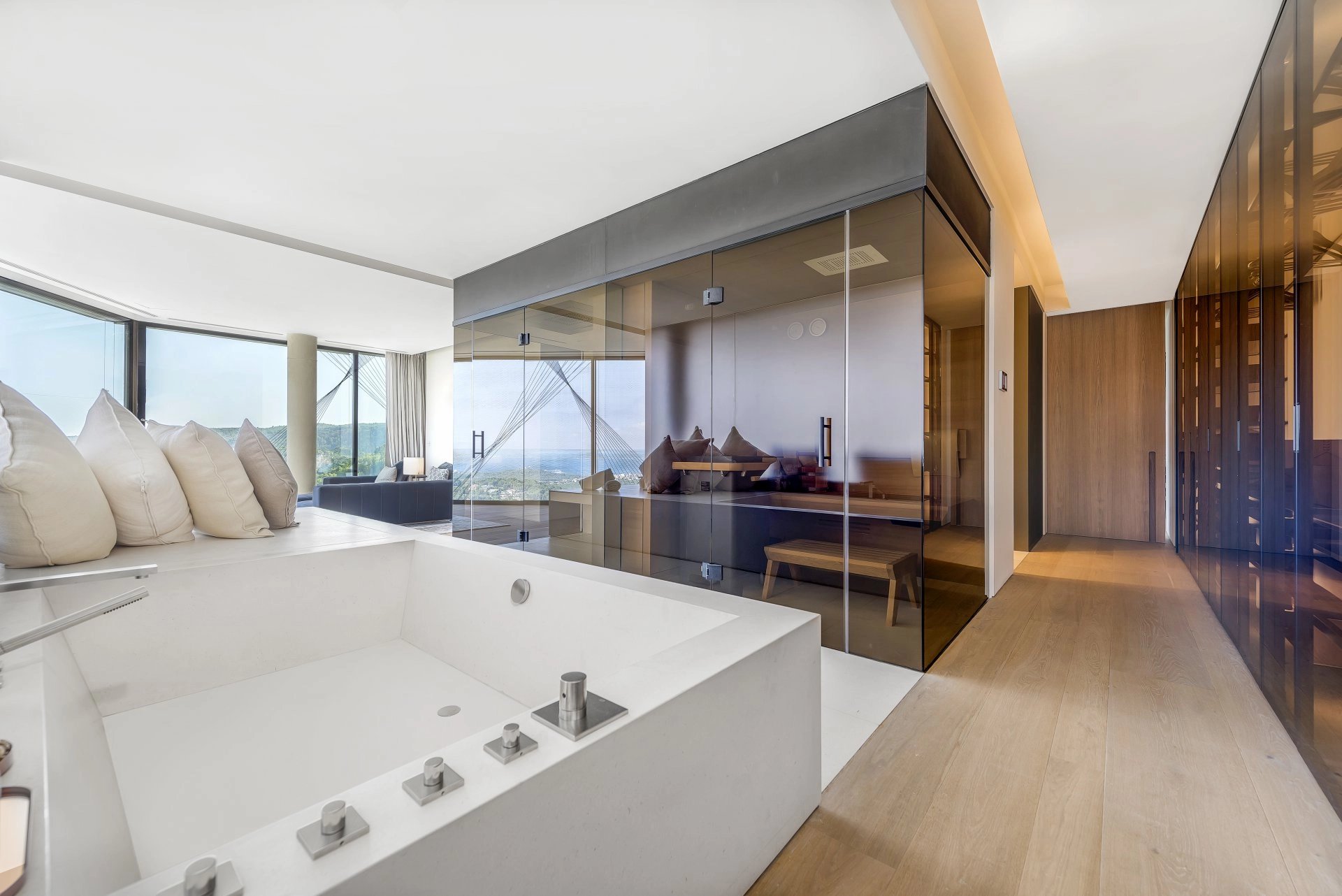 The ground floor is an incomparable open space that can be divided into representative and informal areas. The representative area has a spectacular living room with an attractive open fireplace, a superior dining room, a satellite kitchen, and a sensational wine cellar. The informal area is the focal point where guests might meet while dinner is being prepared.