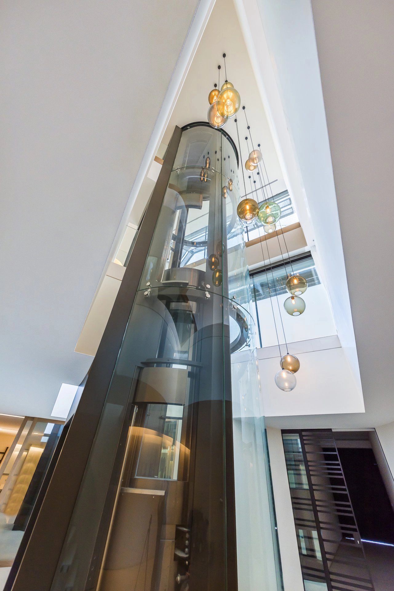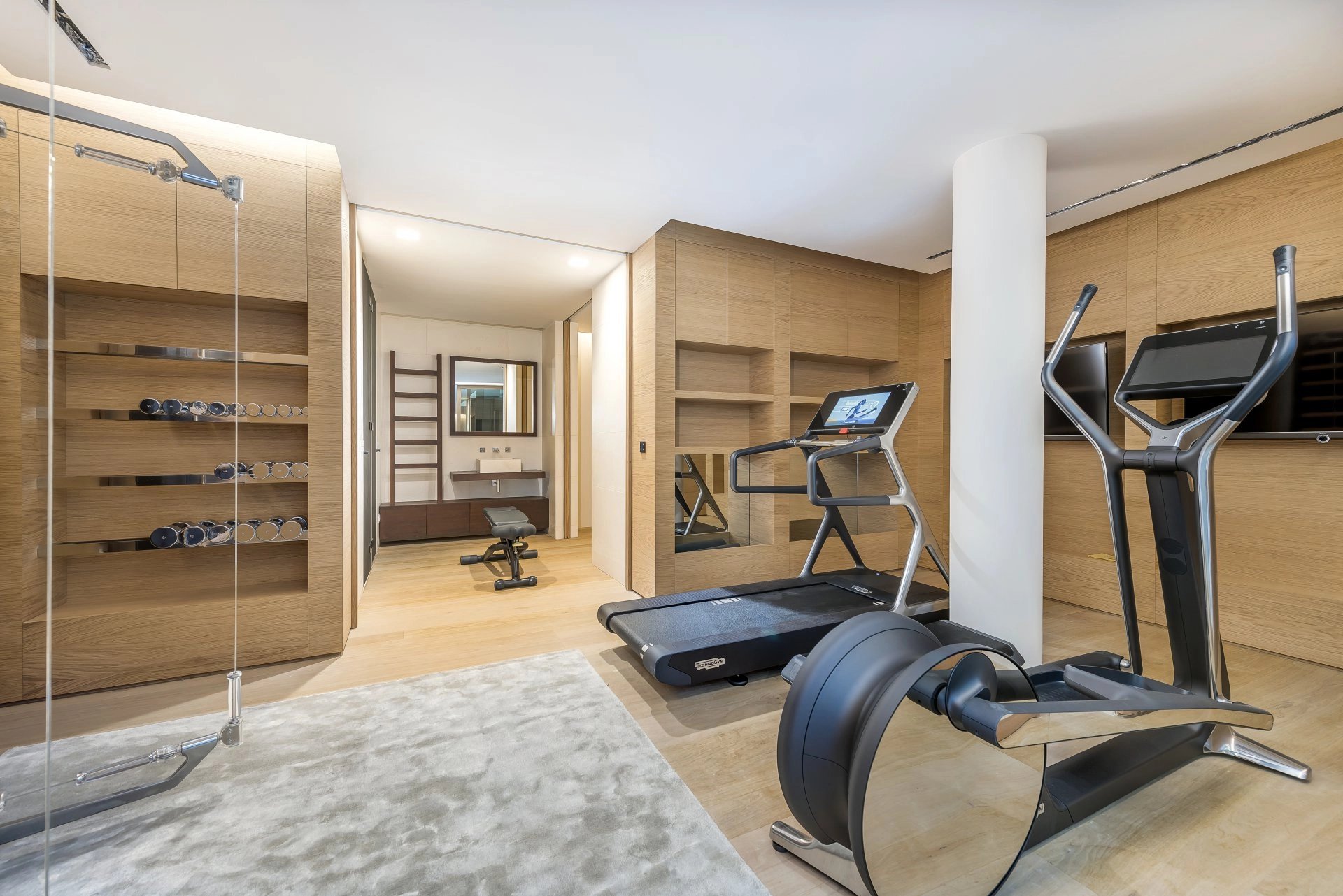 The basement has a video art installation welcome area, a fresh green Zen garden, generous parking with places for six unique cars, a fitness room with treatment space, and staff areas with two additional parking spaces. The basement has two fully equipped staff bedrooms and a pantry. From the welcome atrium, you can take the platform lift directly to the living areas and the bedrooms.
