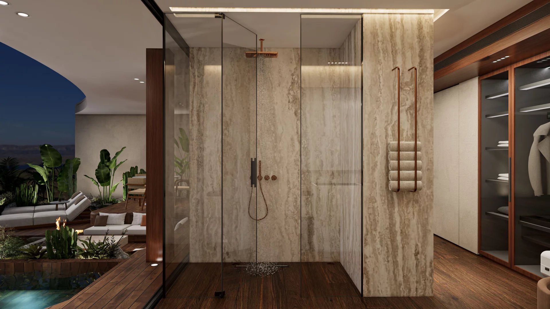 frameless glass-enclosed rain shower, wc, premium design fixtures, a stone